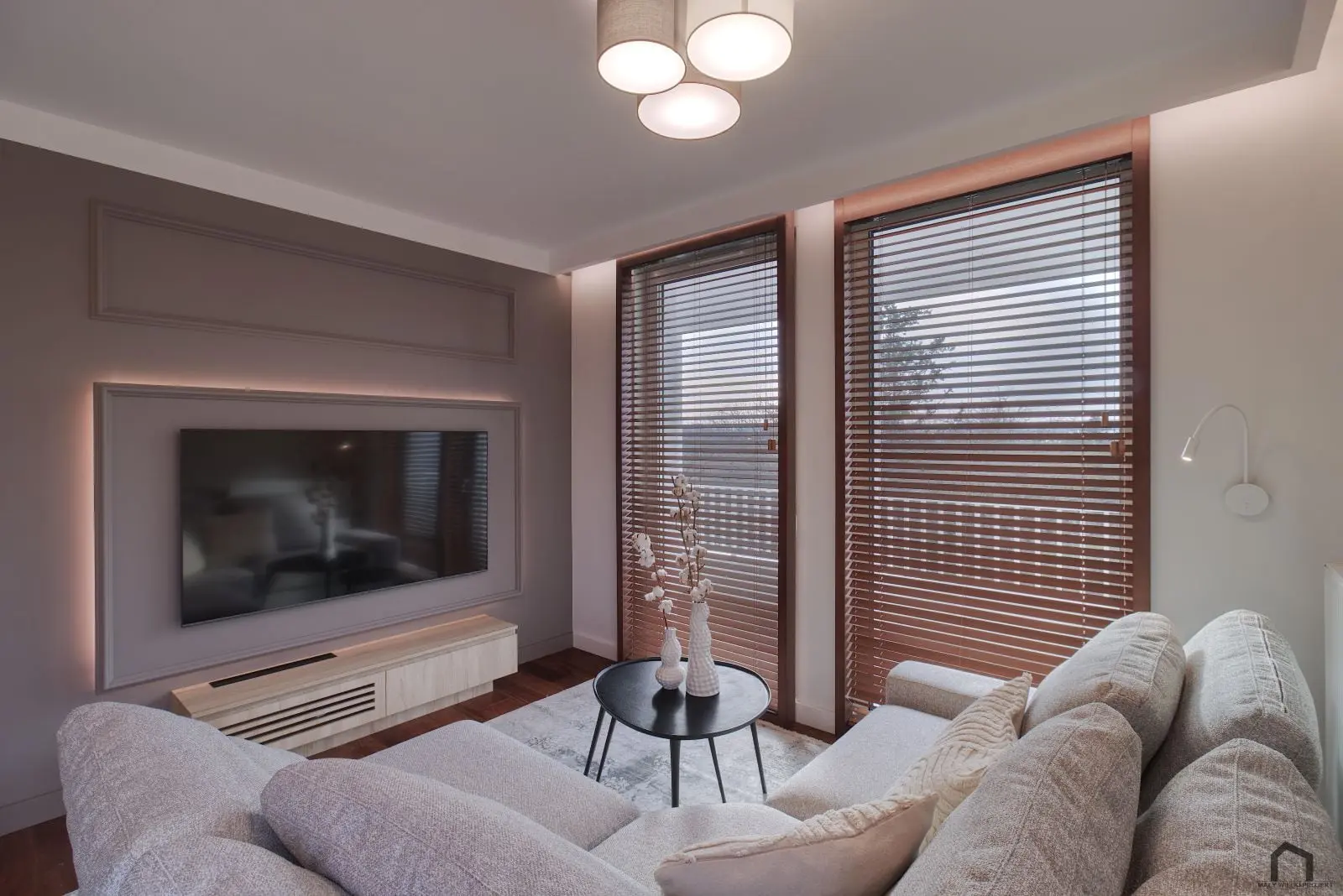 Salon został urządzony w komfortowych i przytulnych ciepłych odcieniach szarości. Na oknach zamontowano drewniane żaluzje, które wnoszą dodatkową atmosferę ciepła do wnętrza mieszkania.