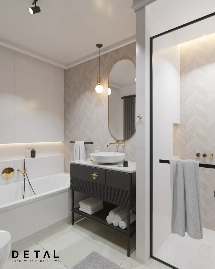 Do urządzenia wyjątkowej łazienki wykorzystano produkty z oferty Internity Home. Płytki ścienne Mutina kolekcja FOG, armatura AXOR Uno2, ceramika Kaldewei oraz Villeroy & Boch, grzejnik Hushlab. Na szczególną uwagę również zasługują złote uchwyty PAP DECO, niczym biżuteria łazienki, zdobią szafkę umywalkową. Uchwyty są nietuzinkowe i bardzo kreatywne o ciekawych wzorach. Kolorystyka łazienki jest ponadczasowa, beże, delikatne szarości i złoto znakomicie podkreślają styl wnętrza.