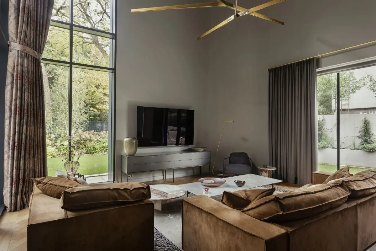 Salon, który natychmiast przyciąga uwagę swą podwójną wysokością, został urządzony meblami renomowanych marek. Centralnym punktem przestrzeni jest sofa zaprojektowana przez Paolę Navone, która doskonale komponuje się z otoczeniem, zapewniając jednocześnie niebywały komfort domownikom. Wyjątkowym akcentem w salonie jest lampa marki Henge, stworzona przez Massimo Castagnę we współpracy ze studiem Tabu Pushelberg i Fausto Salvi.