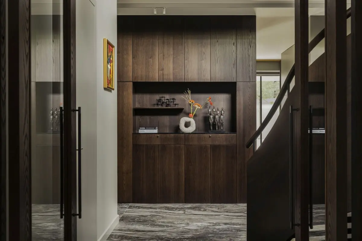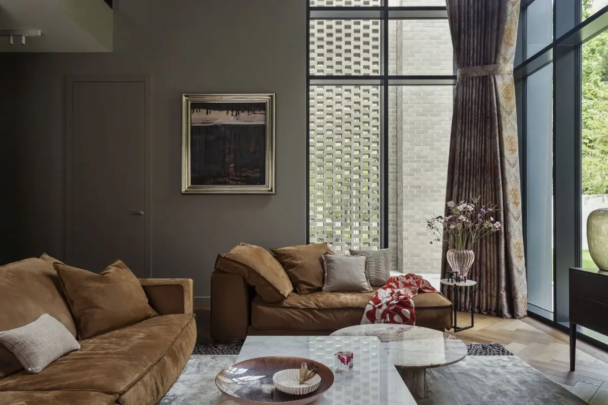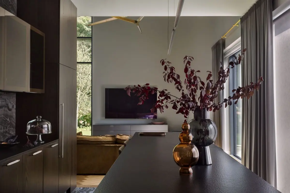 Projektowanie wnętrz tego domu było starannie przemyślanym procesem, obejmującym inwentaryzację pomiarową i fotograficzną oraz opracowanie założeń projektowych w ścisłej współpracy inwestora z mow.design. Kluczowym elementem okazało się stworzenie przestrzeni otwartej na otaczającą zieleń i integralnej z otoczeniem. Kolorystykę domu zdecydowano się utrzymać w szarościach, wzbogaconych brązami i rudościami, nawiązującymi do kolorów ziemi. Architektki zadbały również o użycie szlachetnych materiałów, takich jak fornir i kamień naturalny, połączonych z włoskim wzornictwem.