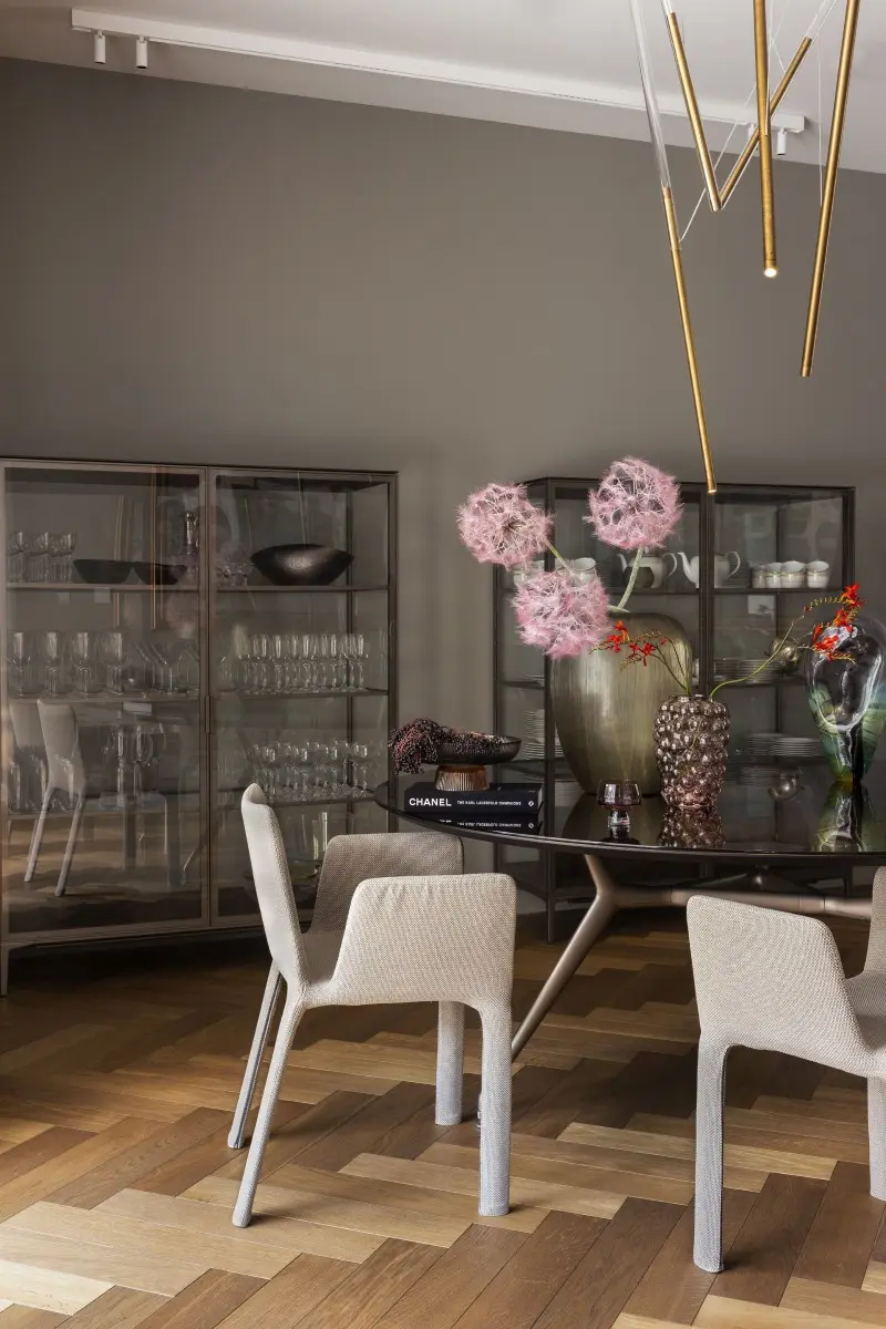 Nieoczywiste relacje tworzą również elementy ze szkła dekoracyjnego autorstwa Aleksandry Kujawskiej, których organiczne formy harmonizują z prostymi liniami wnętrza i kryształowymi lampami. Dzięki starannej selekcji, w efekcie powstały wnętrza dalekie od sztampy i śmiertelnej powagi.
