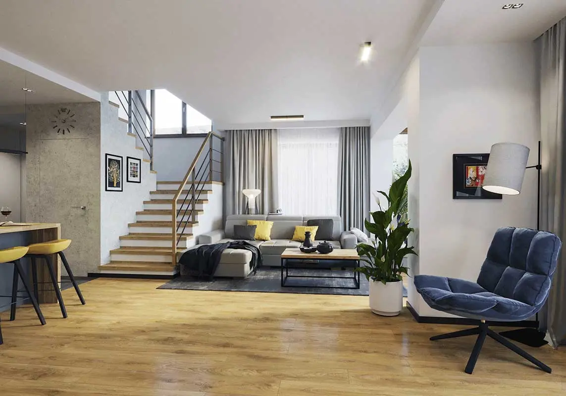 W najnowszym projekcie warszawskiego biura Motyw Design dominuje szarość i drewno. Tym samym mamy do czynienia z połączeniem dwóch żywiołów: surowego betonu i przytulnego drewna. Dzięki temu udało się zachować równowagę pomiędzy nowoczesnością a rodzinnym ciepłem. Całość przełamują mocniejsze tony, takie jak żółty, granat i turkus.
