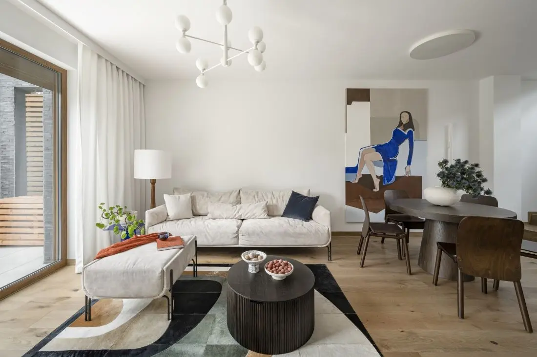 Ponad 105-metrowy apartament, zaprojektowany przez architektkę położony jest pod Warszawą. Tutaj sztuka nie tylko znajduje swoje miejsce w postaci licznych dzieł, ale również wyraża się poprzez formę, materiały i kolorystykę, tworząc spójną i wyjątkową kompozycję wnętrz. Inspirując się stylem Bauhaus, gdzie kluczową rolę odgrywa zabawa formą i kolorem, architektka stworzyła przestrzeń pełną kubistycznych form i prostej elegancji.