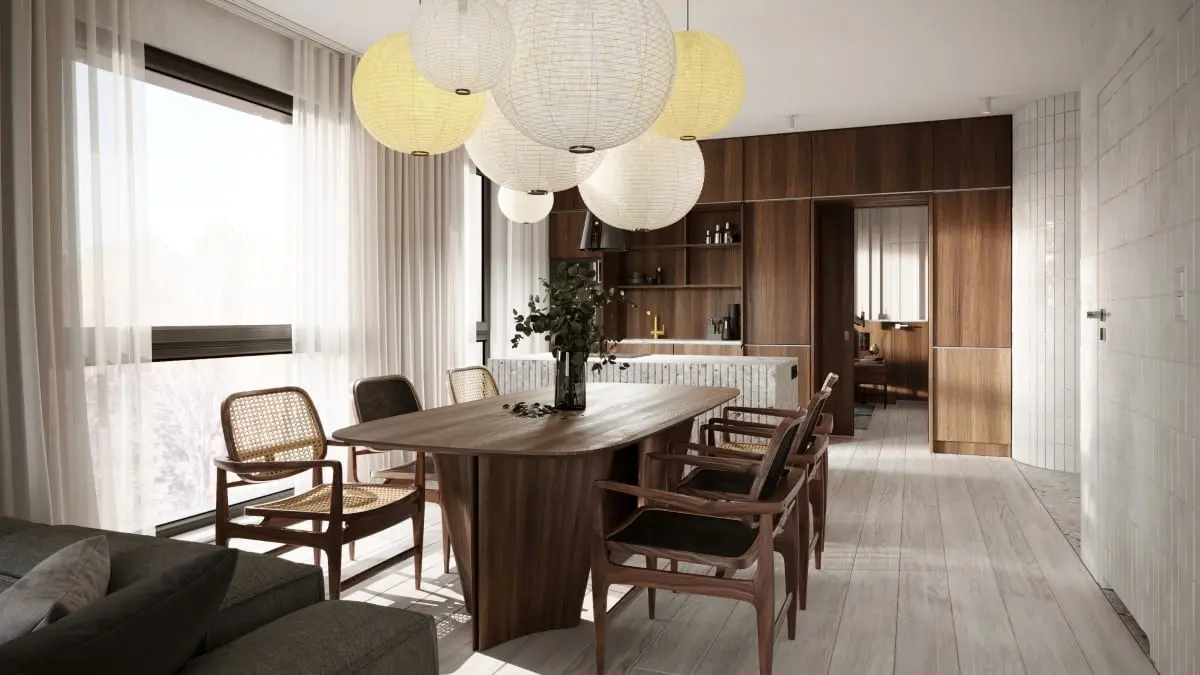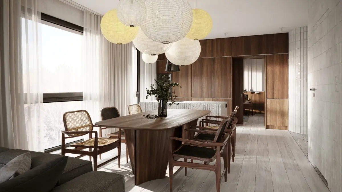 Centralnym miejscem aranżacji jest duży stół otoczony miksem krzeseł. Ta eklektyczna, ale i też niezwykle dobrana kompozycja, roztacza iście domową atmosferę. Całość dopełniają papierowe lampy inspirowane japoński lampionami.