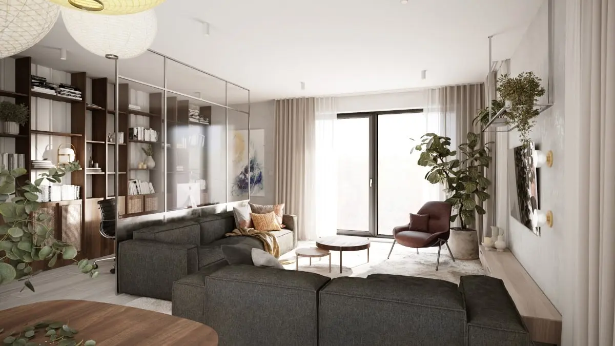 Tuż obok jadalni znajduje się płynne przejście do strefy wypoczynkowej. Dwie rodzinne sofy bez widocznych twardych elementów konstrukcyjnych otulają przestrzeń i zapraszają do relaksu. W salonie znalazło się też miejsce na subtelnie wydzielony gabinet do pracy zdalnej.