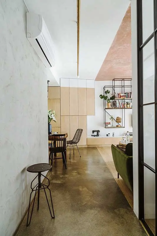 Architekci zaczęli prace nad 88-metrowym wnętrzem od zmiany układu funkcjonalnego. Spore ingerencje w istniejący rzut, wynikały z potrzeby stworzenia pokoju dla dziecka. Ponadto mieszkanie miało być przestronne i jasne, stąd takie rozwiązania jak przeszklona ściana loftowa, pomiędzy gabinetem a strefą dzienną. Pozwoliło to optyczne powiększenie oraz doświetlenie korytarza przy jednoczesnym otwarciu domowego biura na salon.