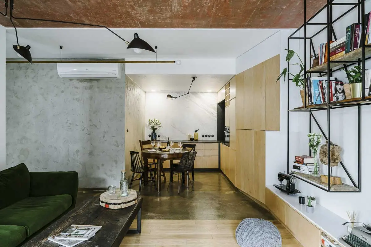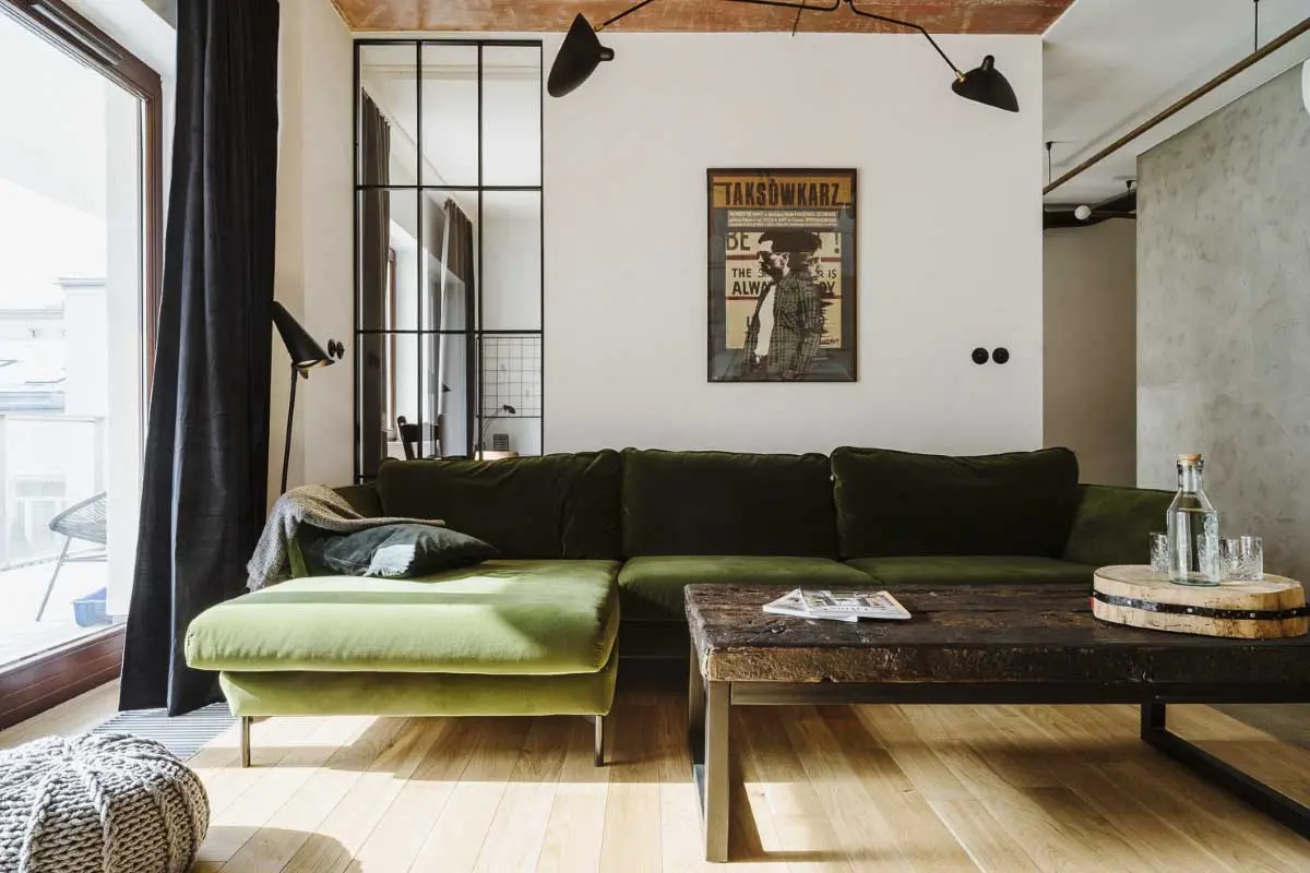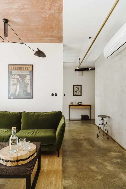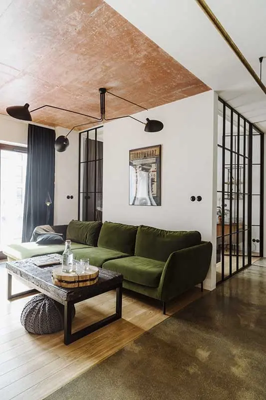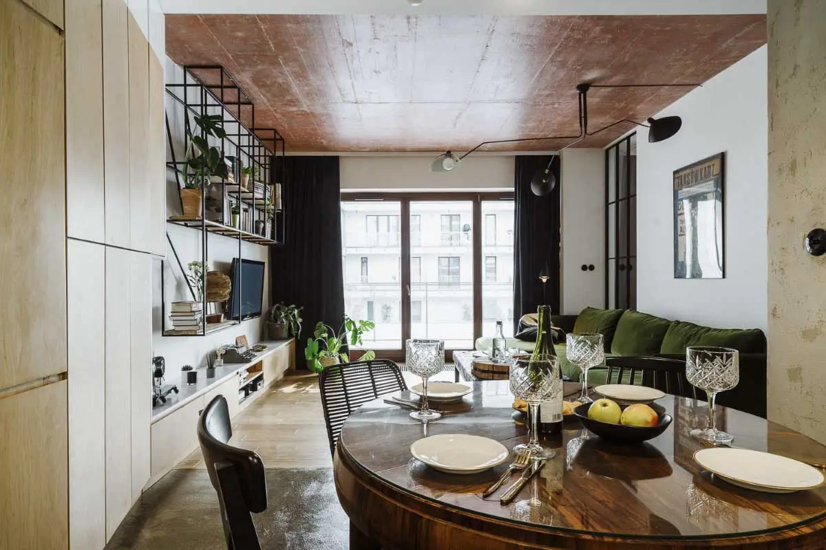 Styl industrialny często kojarzy się z surowym wnętrzem, bliższym kawalerskiej garsonierze niż miejscu dla rodziny z dzieckiem. Natomiast architektom z zespołu Mili Mlodzi Ludzie, udało się zbudować bardzo ciepłą aranżacje, sprzyjającą wspólnemu spędzaniu czasu, nawet jeśli każdy z domowników oddaje się innym obowiązkom. Niezwykle przytulne mieszkanie tworzą nie tylko wykorzystane materiały, ale także elementy wyposażenia i ciepłe barwy. Zielony, welurowy narożnik , stanowi akcent kolorystyczny, ale jednocześnie zachęca do wypoczynku. Okrągły stół vintage w kolorze drewna orzechowego z dobranym do niego rozkompletowanym zestawem krzeseł, również łagodzi loftowy charakter mieszkania. Ciekawym zabiegiem jest zastosowanie mosiądzu jako lejtmotiwu, który występuje w postaci prostej lampy zaprojektowanej przez architektów, podziałach betonowej posadzki i pochwytach szaf.