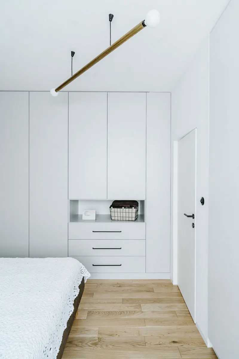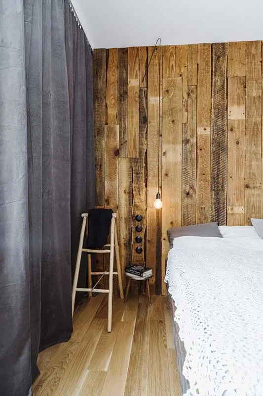 Wyjątkowo ciepła i lekko rustykalna aranżacja powstała w głównej sypialni. Stało się tak za sprawą drewna, którym pokryto ścianę, a które właściciel przywiózł kiedyś z Bieszczad oraz koronkowej kapie na łóżko. Dodało to pomieszczeniu przytulności i nasyciło je wspomnieniami.