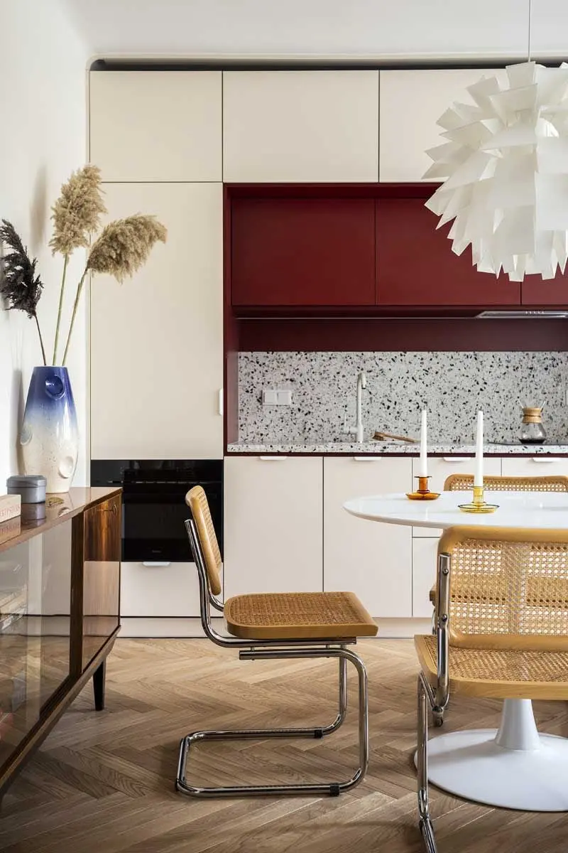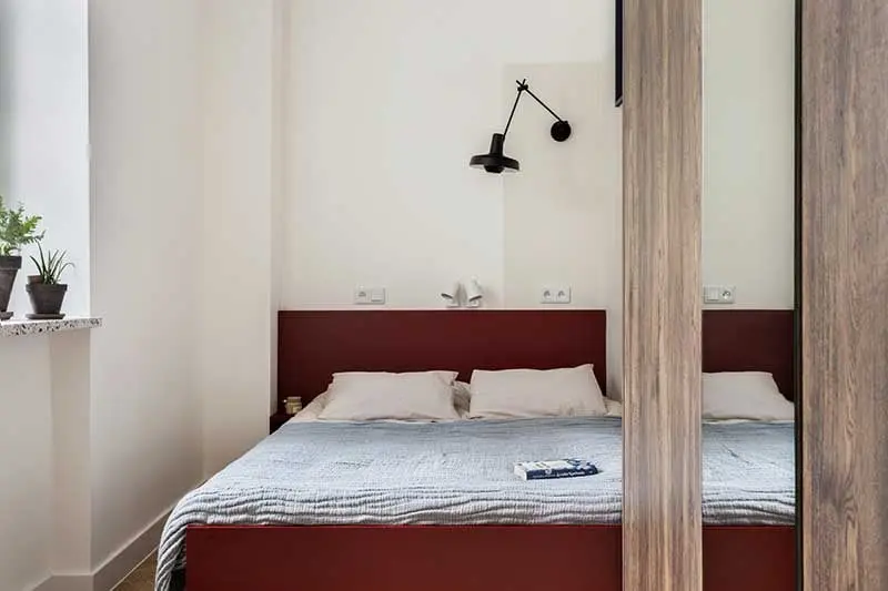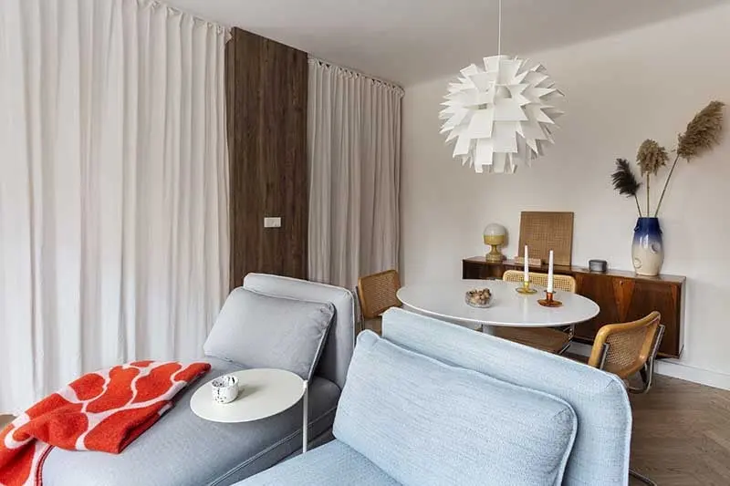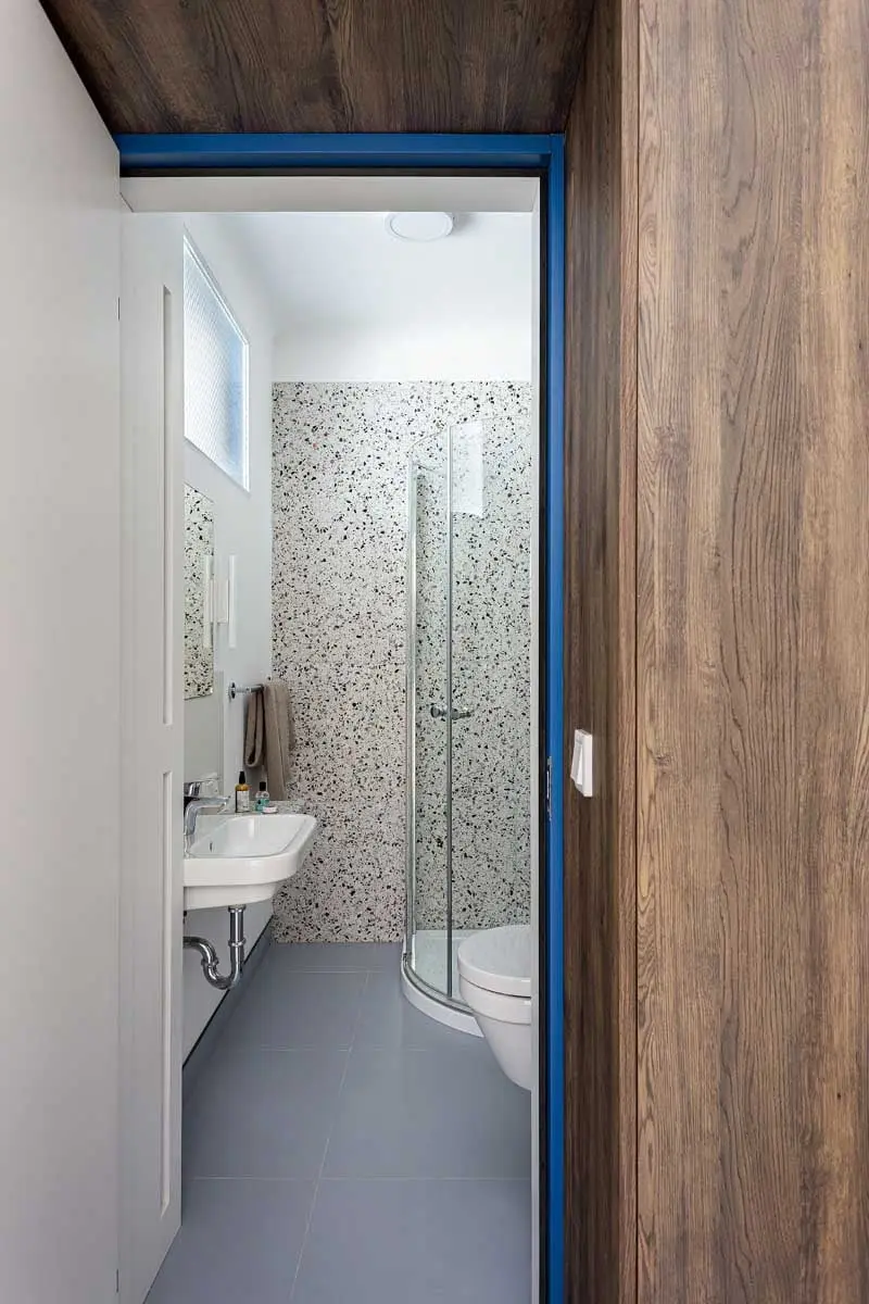 Pomimo, iż mieszkanie przeznaczone jest na wynajem, właściciele chcieli by panował tu klimat domowego ciepła. Istotnym aspektem, obok funkcjonalności, było więc wprowadzeniu rozwiązań pozwalających na wygodne i komfortowe mieszkanie. Architektka podzieliła niewielką część dzienną na trzy strefy funkcjonalne: aneks kuchenny z pojemną zabudową, strefę jadalnianą oraz wypoczynkową z wygodnymi leżankami. Za lekkimi białymi zasłonami, skrywa się kącik sypialniany. Przedpokój również można odseparować od reszty mieszkania, zasuwając zasłonę. Aby powiększyć przestrzeń łazienki, zdecydowano się przenieść pralkę do zabudowy szafy, znajdującej się pomiędzy sypialnią a salonem. Dzięki temu zabiegowi w łazience stanęła duża kabina prysznicowa. Ściany pokryte barwnym lastryko nawiązują do modernizmu i są motywem przewijającym się w całej aranżacji mieszkania. Wnętrze idealnie dopełnia prosta ceramika i chromowana armatura.