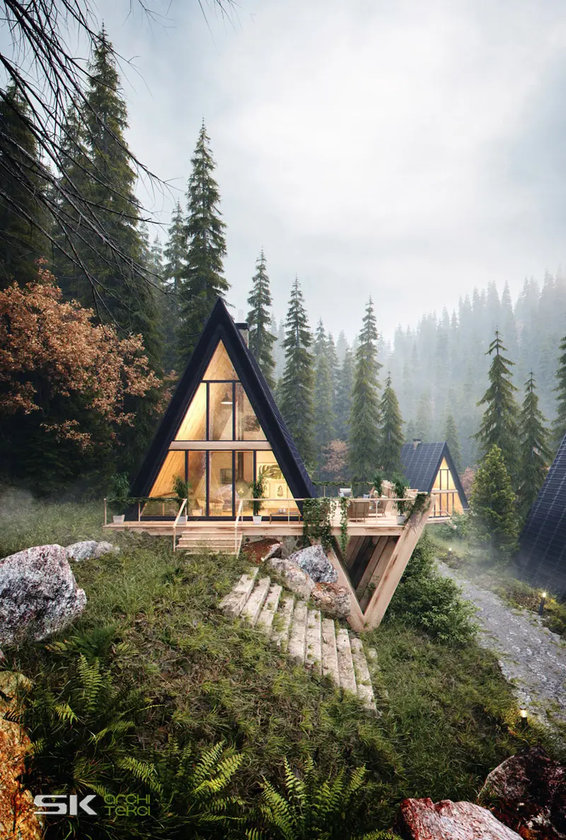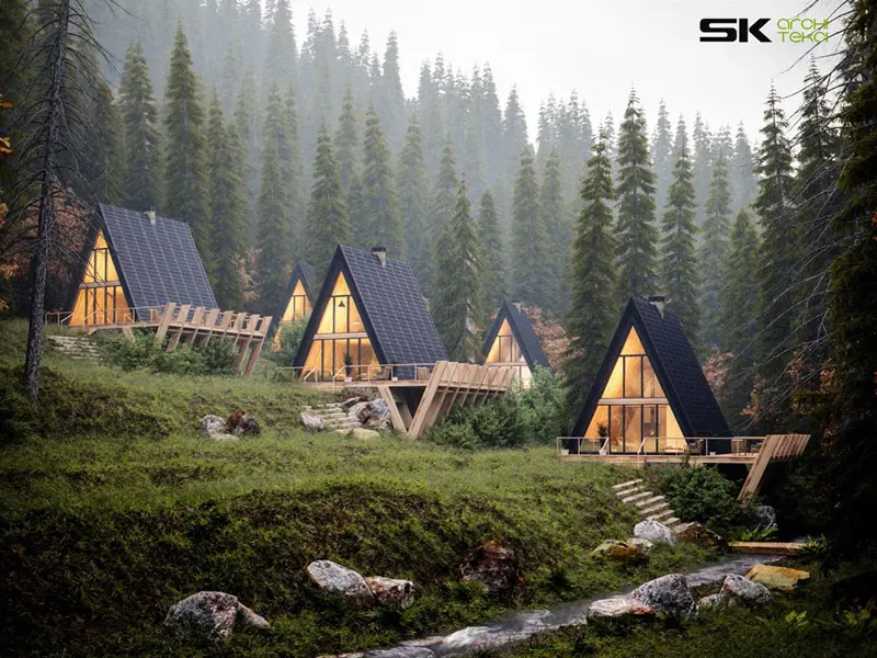 Domki charakteryzują się prostą bardzo formą, przypominającą domki letniskowe typu BRDA. Elewacje otwarta na malowniczy krajobraz dużymi przeszkleniami. Domków mogą być przykryte dachem wykończonym łupkiem, dachówką, blachą lub deskami – istnieje także możliwość wykorzystania paneli fotowoltaicznych.