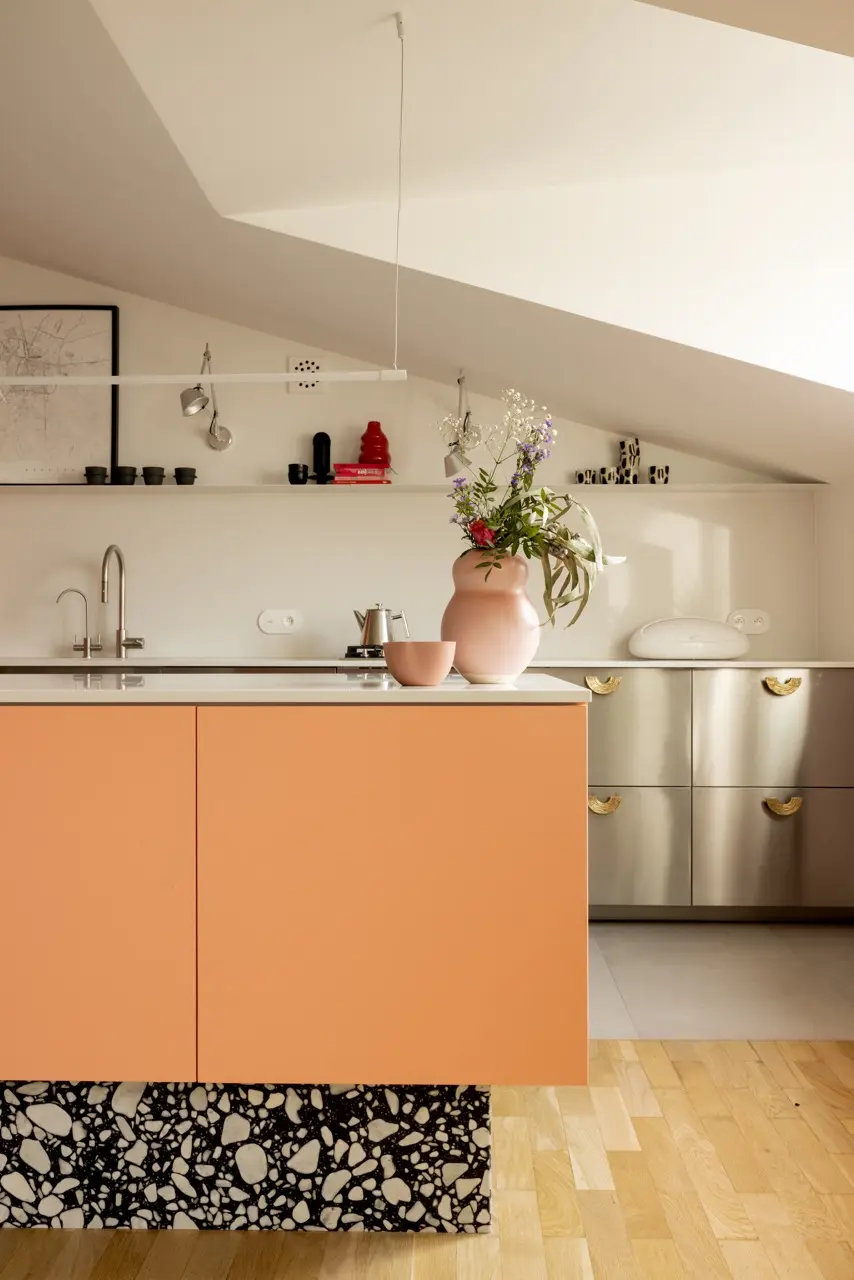 – Wiedziałam, że chcę wnętrza, które będzie kolorowe, wesołe, wypełnione przedmiotami vintage, mającymi dla nas wartość sentymentalną i klasykami designu, które będą się pięknie starzały. Chociaż kamienica pochodzi z okresu powojennego, samo poddasze zostało zaadaptowane do użytku dopiero na początku lat 90-tych, na które przypada też moje dzieciństwo. Postanowiłam połączyć te fakty, wykorzystując stylistykę tamtych lat jako inspirację do projektu. Np. wzór płytek w łazience do złudzenia przypomina lastryko, z którego wykonane były parapety w moim rodzinnym domu 30 lat temu – opowiada z nostalgią Katarzyna Burak.