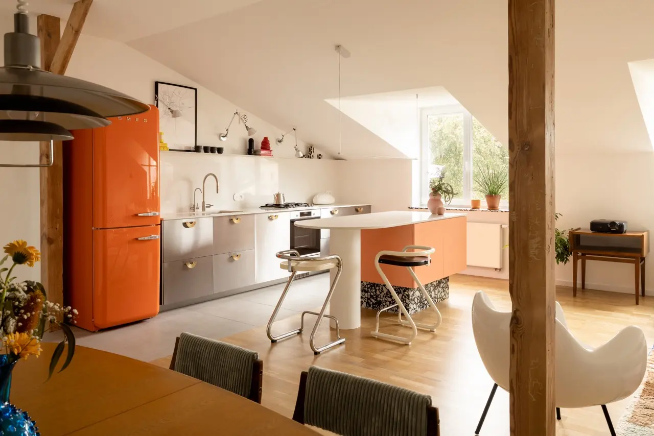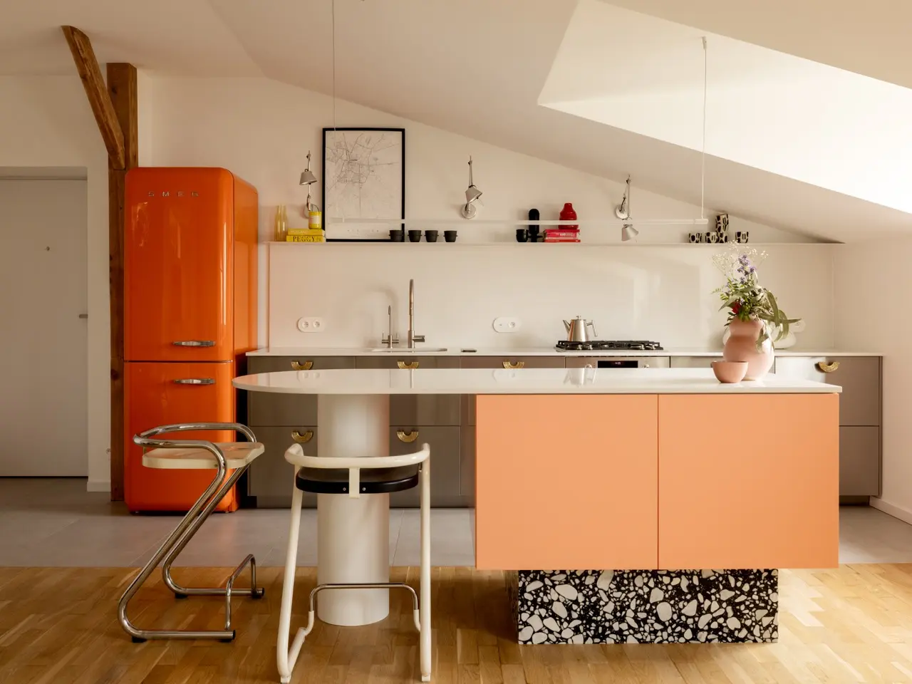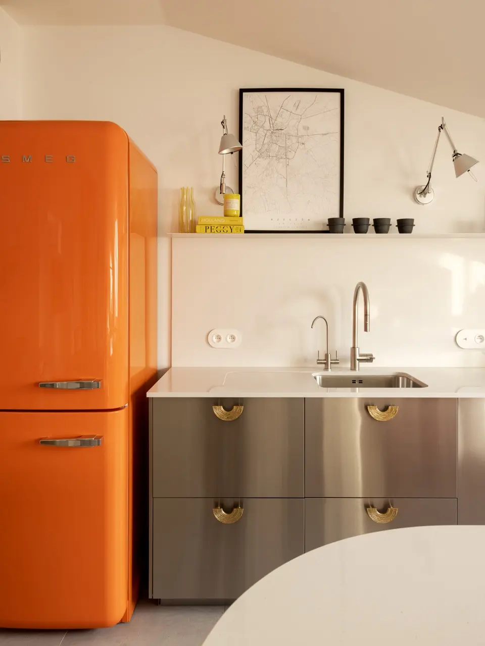 Obecnie mieszkanie składa się z ponad 40-metrowej strefy dziennej, która już od progu wprawia w dobry nastrój. To za sprawą dużej odwagi w łączeniu kolorów oraz materiałów, jaką wykazała się architektka. Nieoczywiste zestawienia np. look stalowych frontów w kuchni dopełniają złote uchwyty, czy awangardowa kompozycja złota ze srebrem potwierdza, że nad detalami pracował tutaj ekspert w swojej dziedzinie, lubiący łamać utarte schematy. Wybierając kolory np. oranżową lodówkę, czy niebanalny lila na szafkę w łazience architektka celowo zastosowała koloroterapię, aby na co dzień poprawiać sobie humor samym przebywaniem w domu.