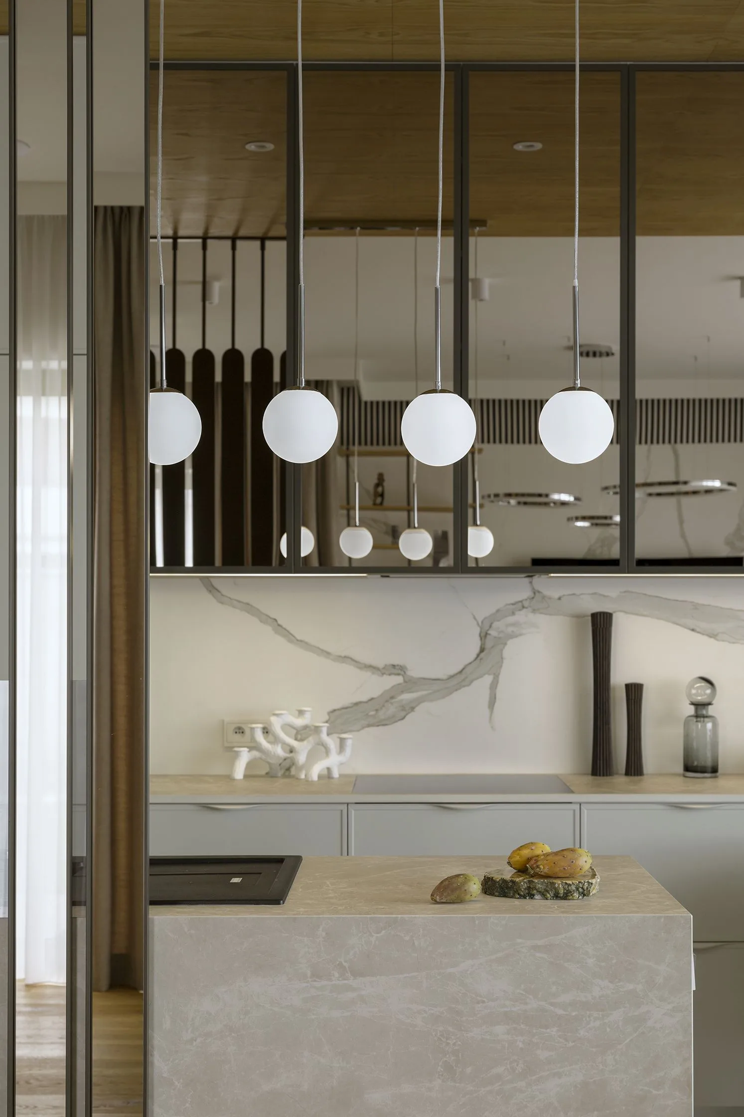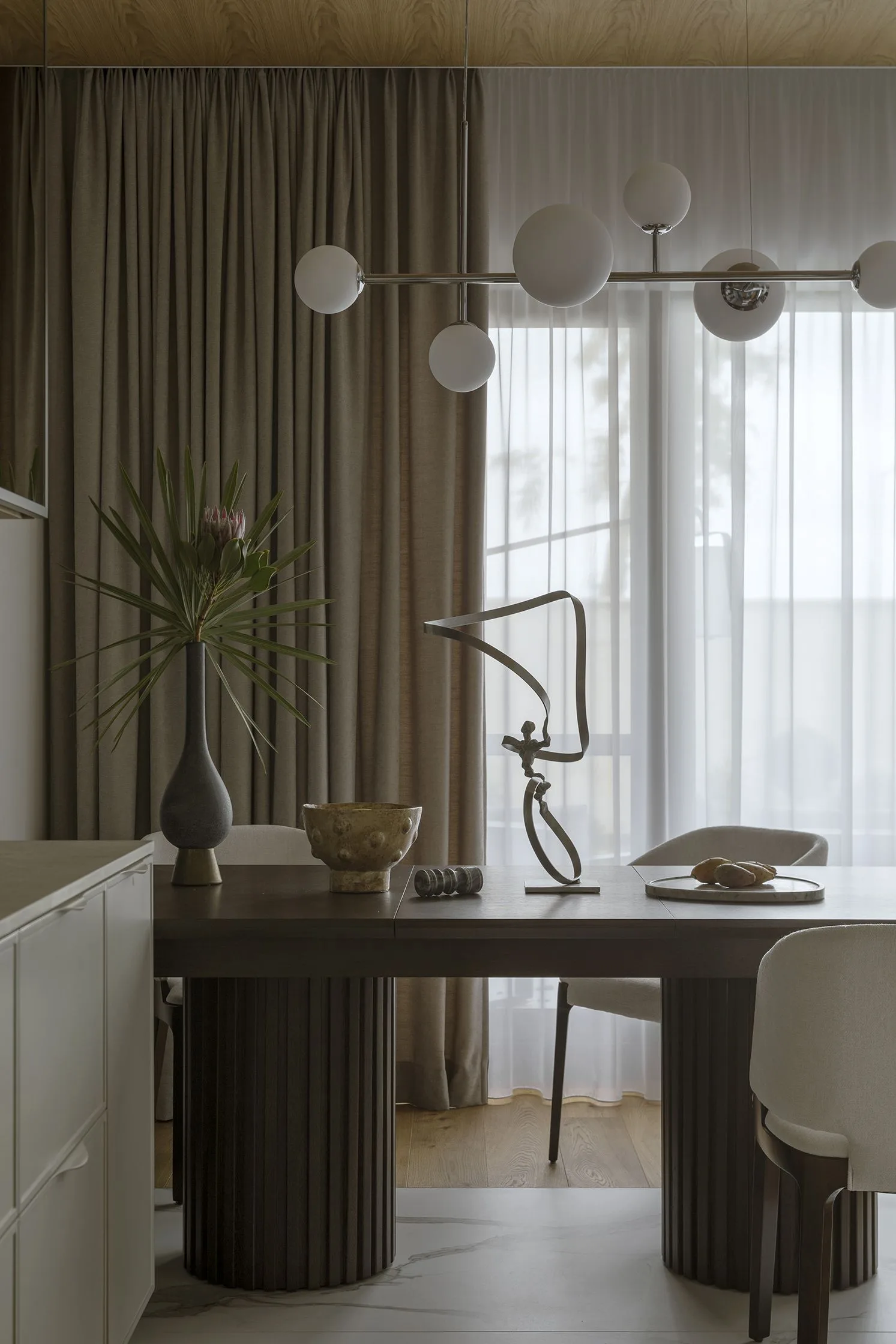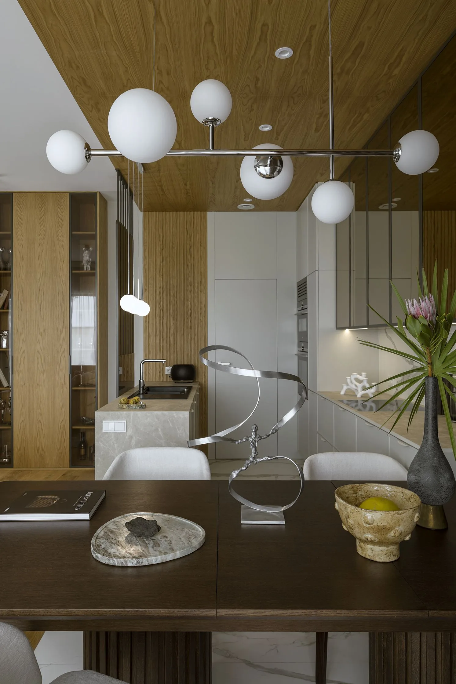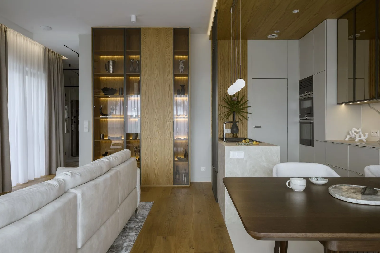 W jadalni, jak w sercu starego domu, króluje drewniany stół, wokół którego ustawiono tapicerowane krzesła o miękkich, organicznych liniach. To przestrzeń codziennych spotkań, gdzie czas płynie wolniej. Tuż obok, w kuchni, króluje zestaw matowych, beżowych frontów, połączonych z ciepłym drewnem i lustrzanymi panelami w eleganckich, aluminiowych ramach. Subtelne lustro-ściana oddzielająca kuchnię od salonu nie tylko dodaje głębi, lecz również pełni funkcję praktyczną – zasłaniając strefę roboczą bez utraty światła.