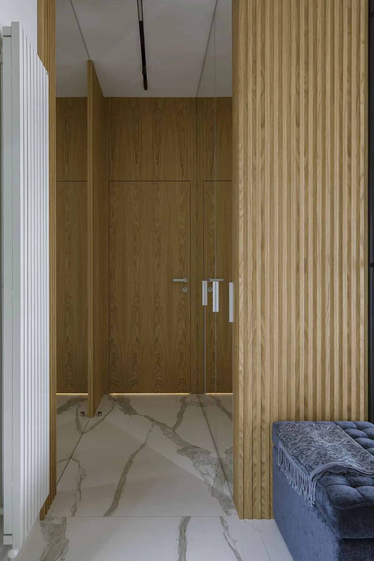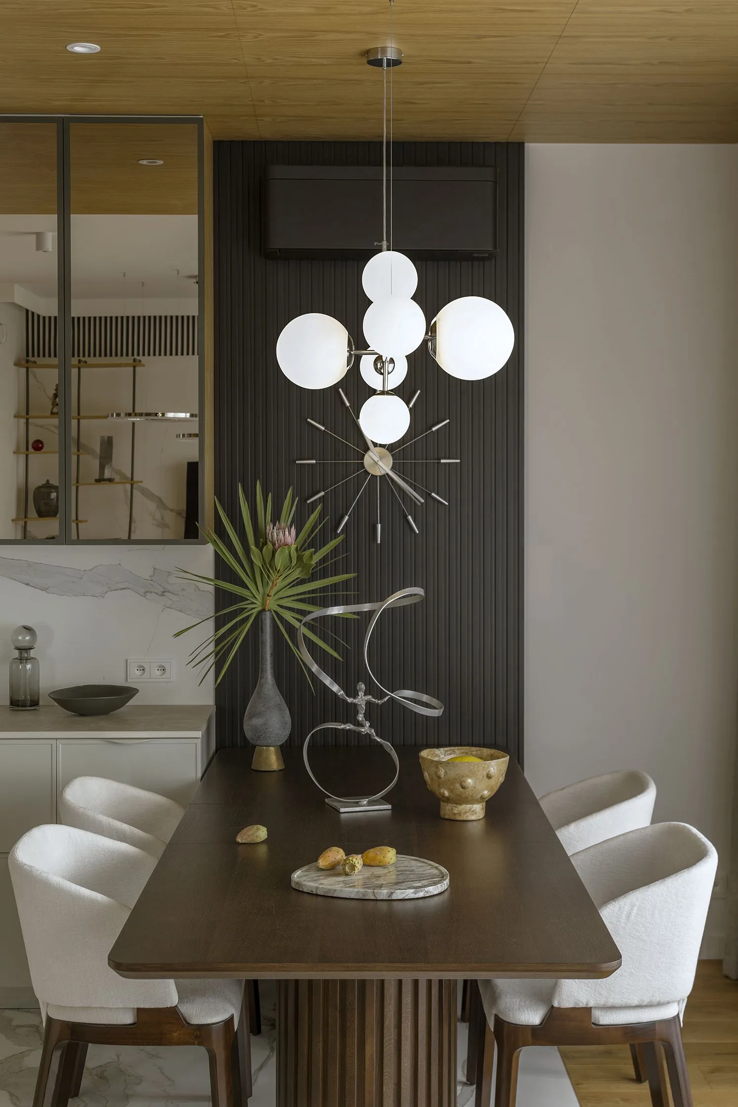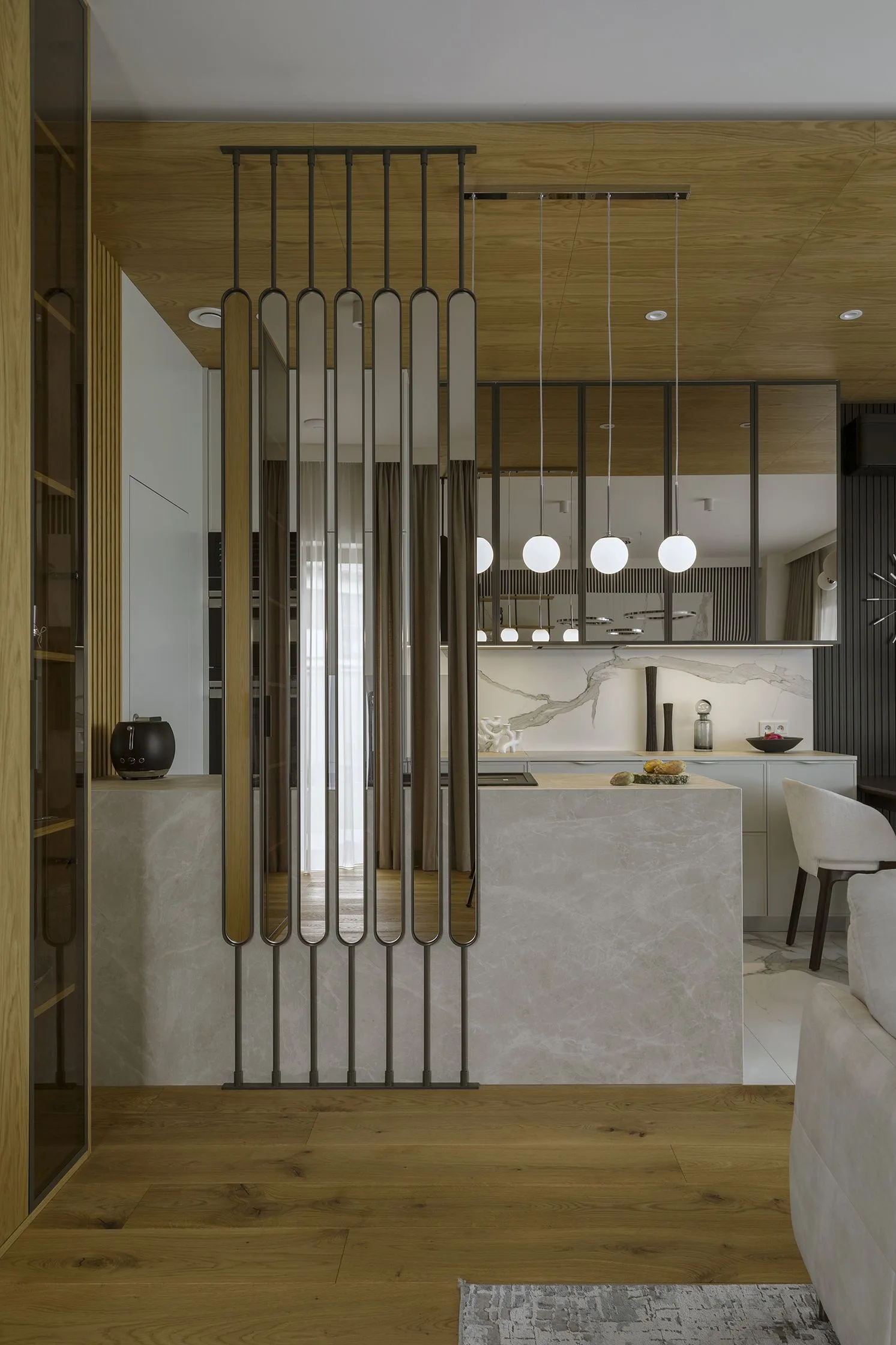 W jadalni, jak w sercu starego domu, króluje drewniany stół, wokół którego ustawiono tapicerowane krzesła o miękkich, organicznych liniach. To przestrzeń codziennych spotkań, gdzie czas płynie wolniej. Tuż obok, w kuchni, króluje zestaw matowych, beżowych frontów, połączonych z ciepłym drewnem i lustrzanymi panelami w eleganckich, aluminiowych ramach. Subtelne lustro-ściana oddzielająca kuchnię od salonu nie tylko dodaje głębi, lecz również pełni funkcję praktyczną – zasłaniając strefę roboczą bez utraty światła.