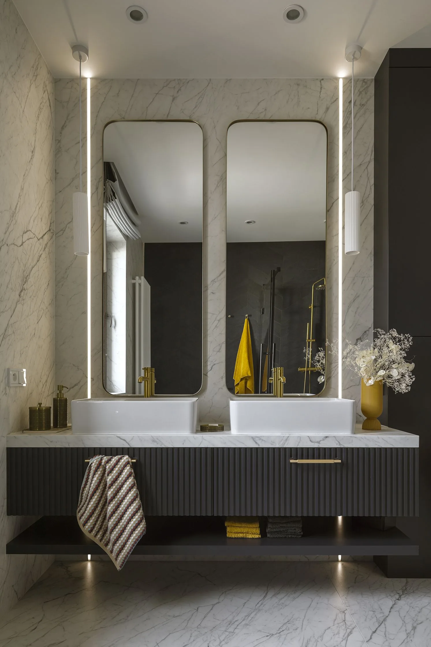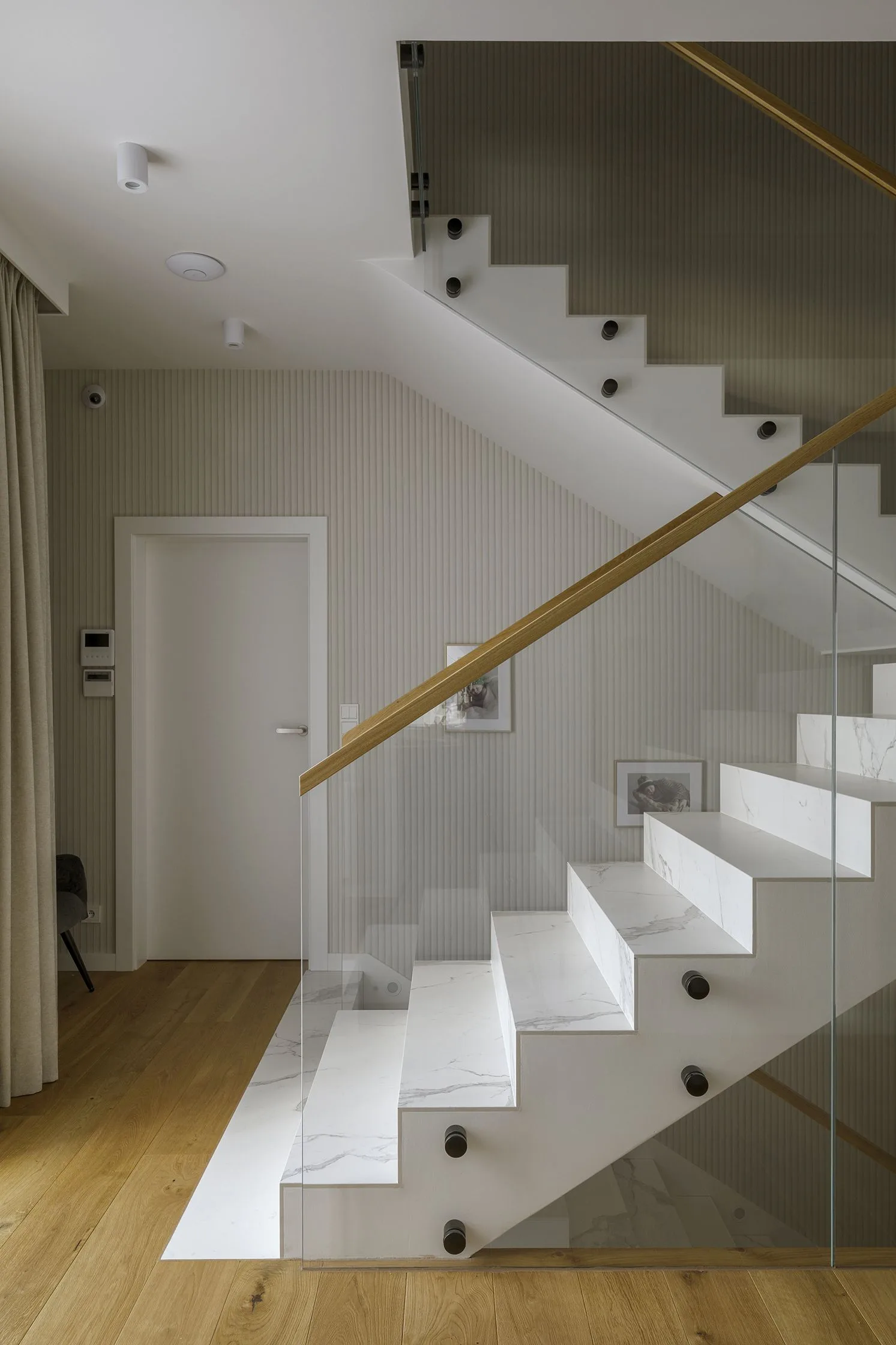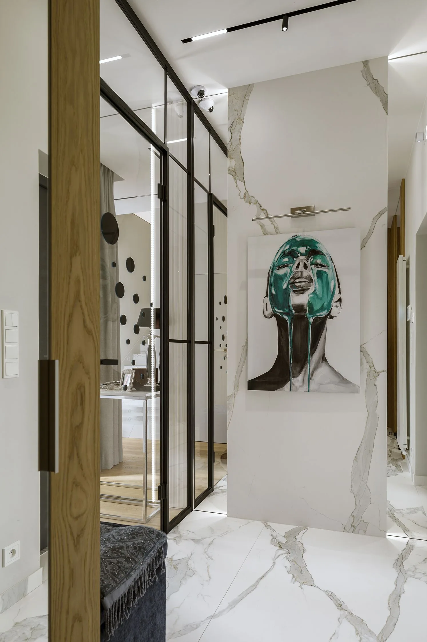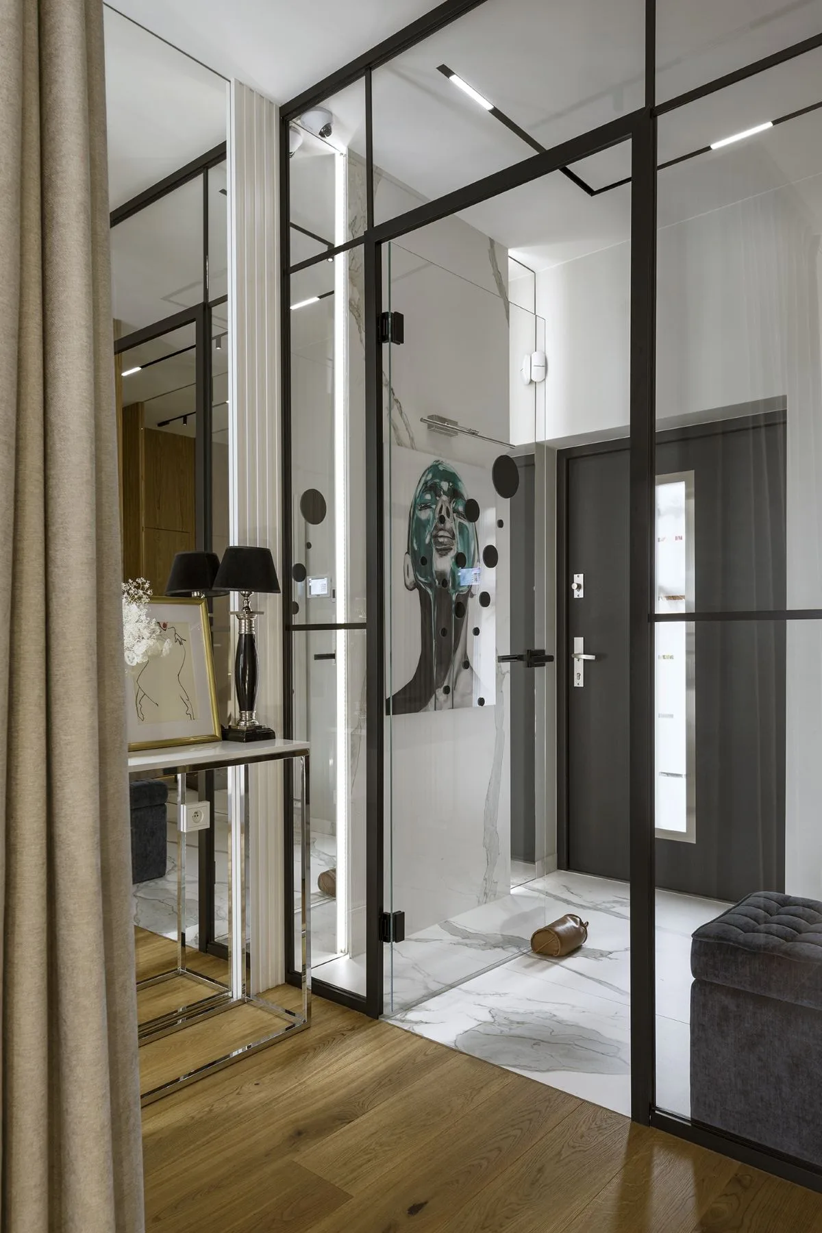 W jadalni, jak w sercu starego domu, króluje drewniany stół, wokół którego ustawiono tapicerowane krzesła o miękkich, organicznych liniach. To przestrzeń codziennych spotkań, gdzie czas płynie wolniej. Tuż obok, w kuchni, króluje zestaw matowych, beżowych frontów, połączonych z ciepłym drewnem i lustrzanymi panelami w eleganckich, aluminiowych ramach. Subtelne lustro-ściana oddzielająca kuchnię od salonu nie tylko dodaje głębi, lecz również pełni funkcję praktyczną – zasłaniając strefę roboczą bez utraty światła.
