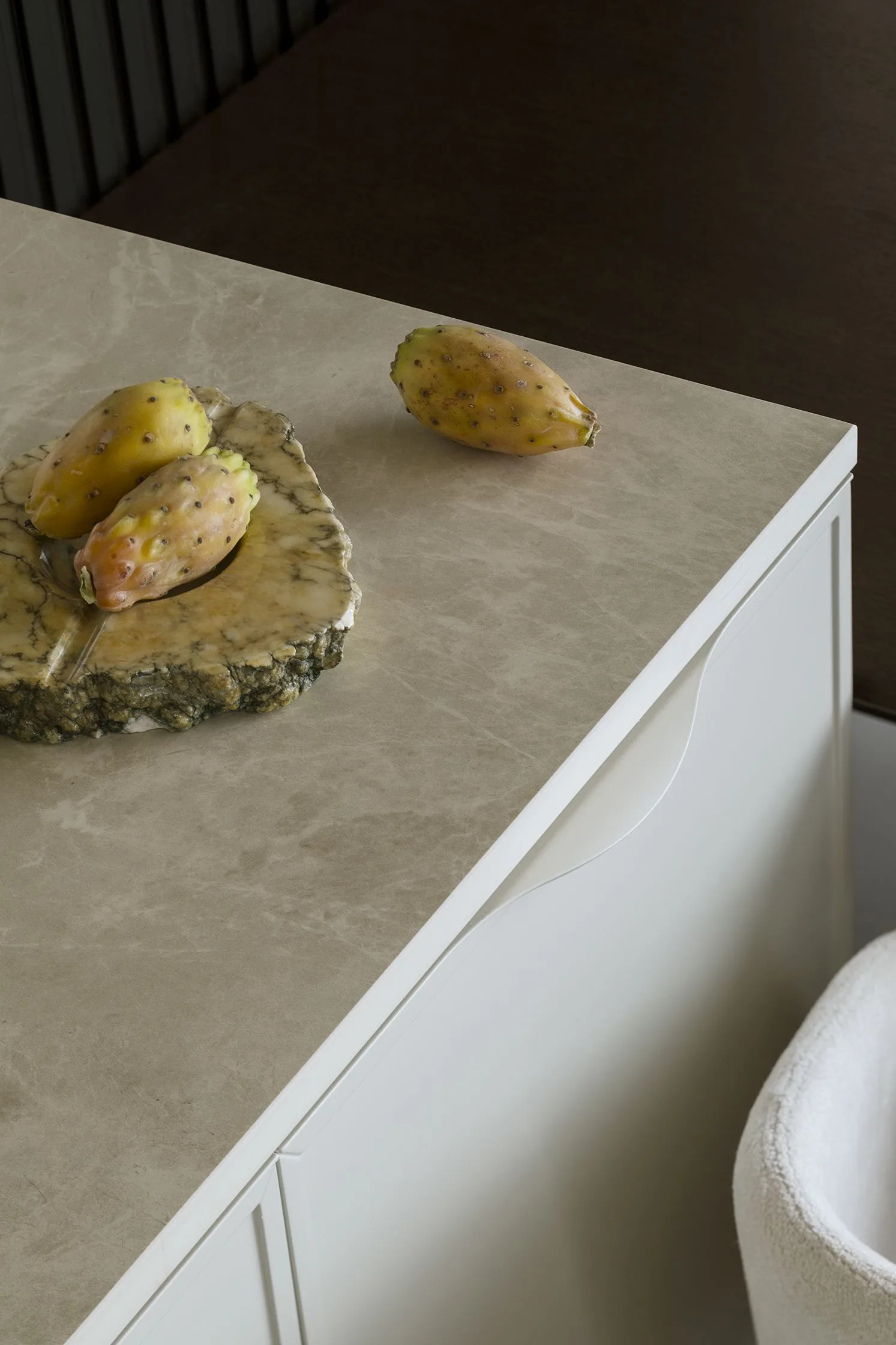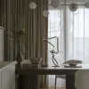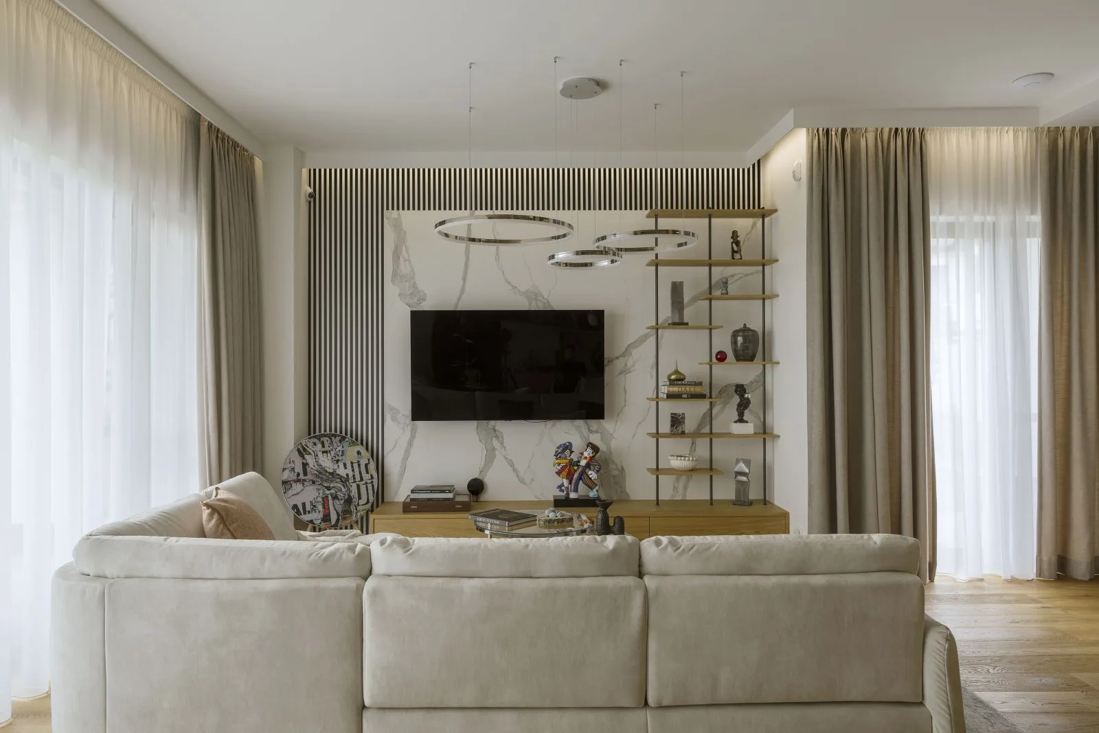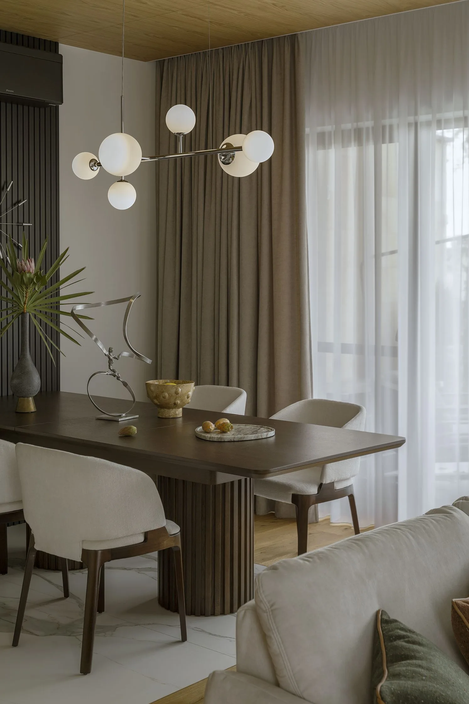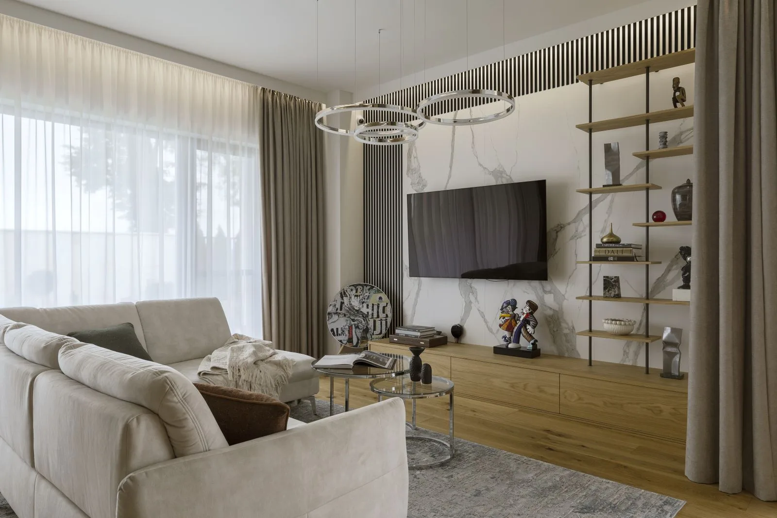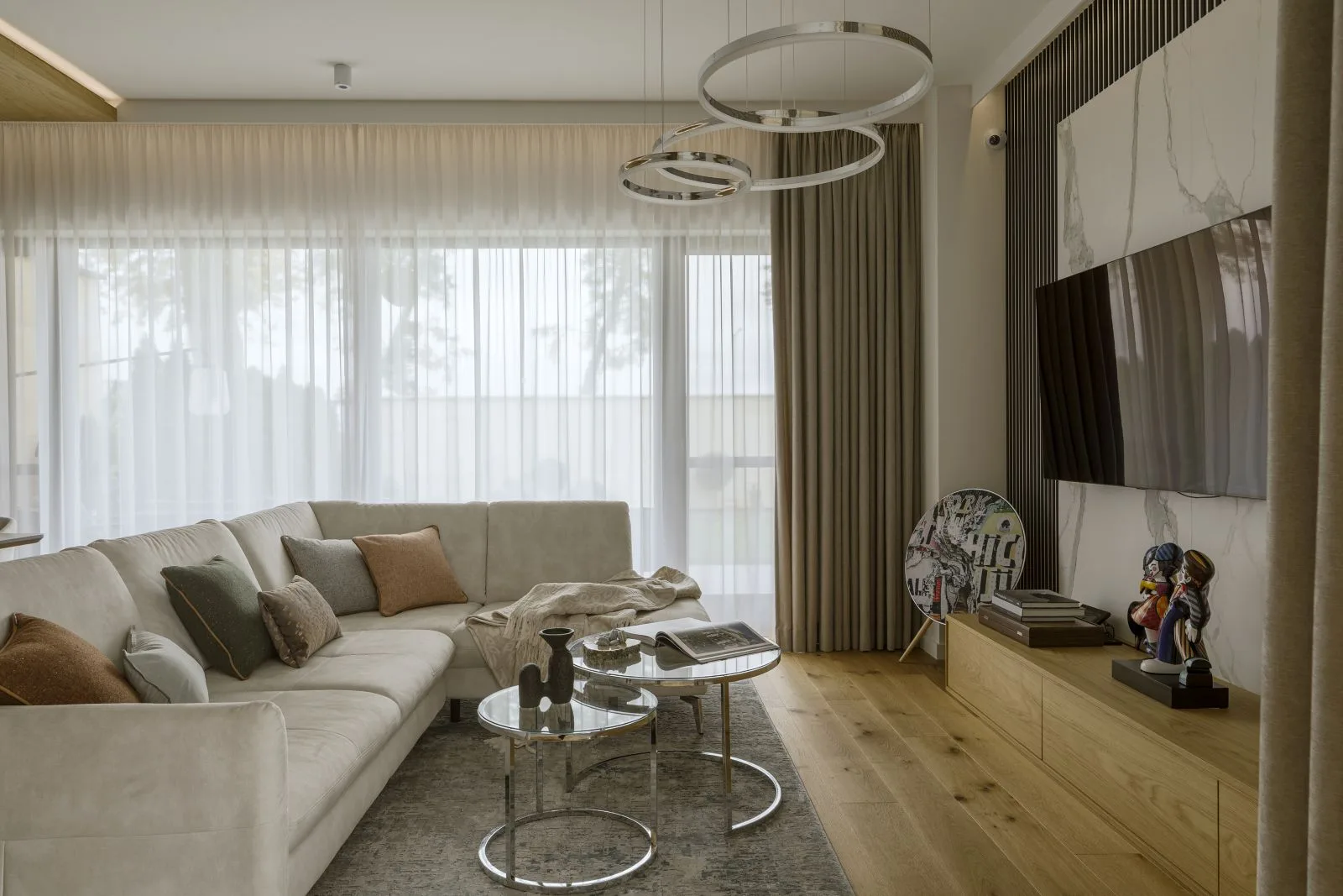 W centrum salonu króluje miękka, kremowa sofa, skąpana w świetle, otulona aksamitnymi poduszkami. To właśnie tu dom zyskuje swoje serce – miejsce odpoczynku i bliskości. Kompozycję uzupełniają subtelne, okrągłe stoliki ze szklanymi blatami, które wnoszą do wnętrza lekkość i nutę nowoczesnej poezji. Paleta barw balansuje pomiędzy ciepłymi beżami, złamaną bielą, tonami naturalnego drewna i delikatnymi akcentami oliwki, rudości oraz brązów – jak pejzaż utkany z kolorów ziemi.