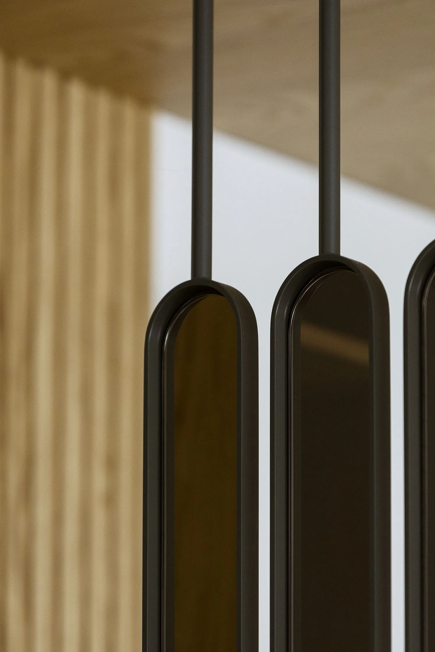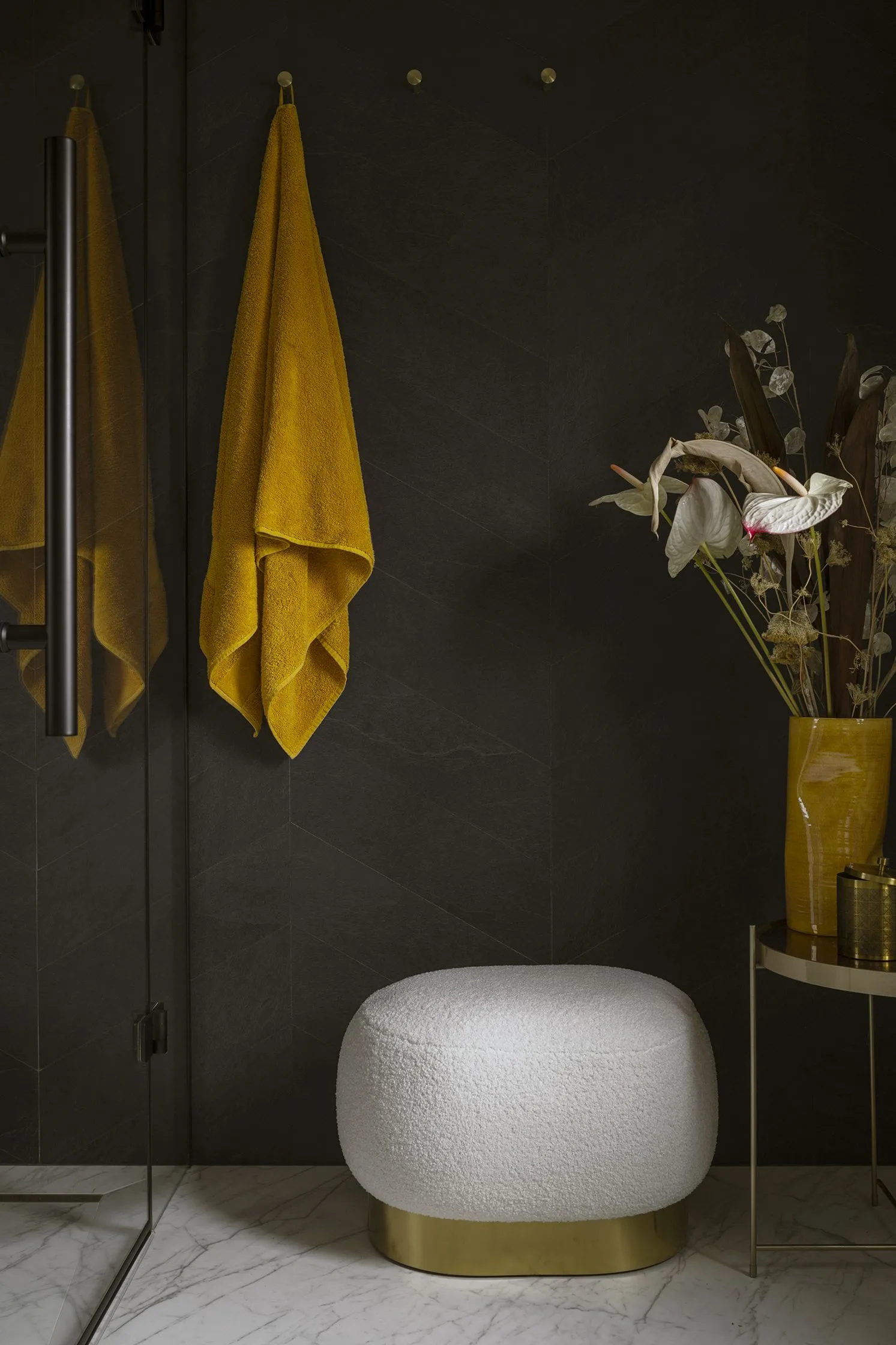 Motyw przewodni w postaci stalowo-granatowego akcentu pojawia się w całym domu niczym refren eleganckiej melodii – od łazienek po meblowe detale, budując poczucie spójności i głębi. W zestawieniu z ciepłą paletą barw i naturalnymi materiałami, tworzy wysmakowaną równowagę pomiędzy nowoczesnym chłodem a domowym ciepłem.