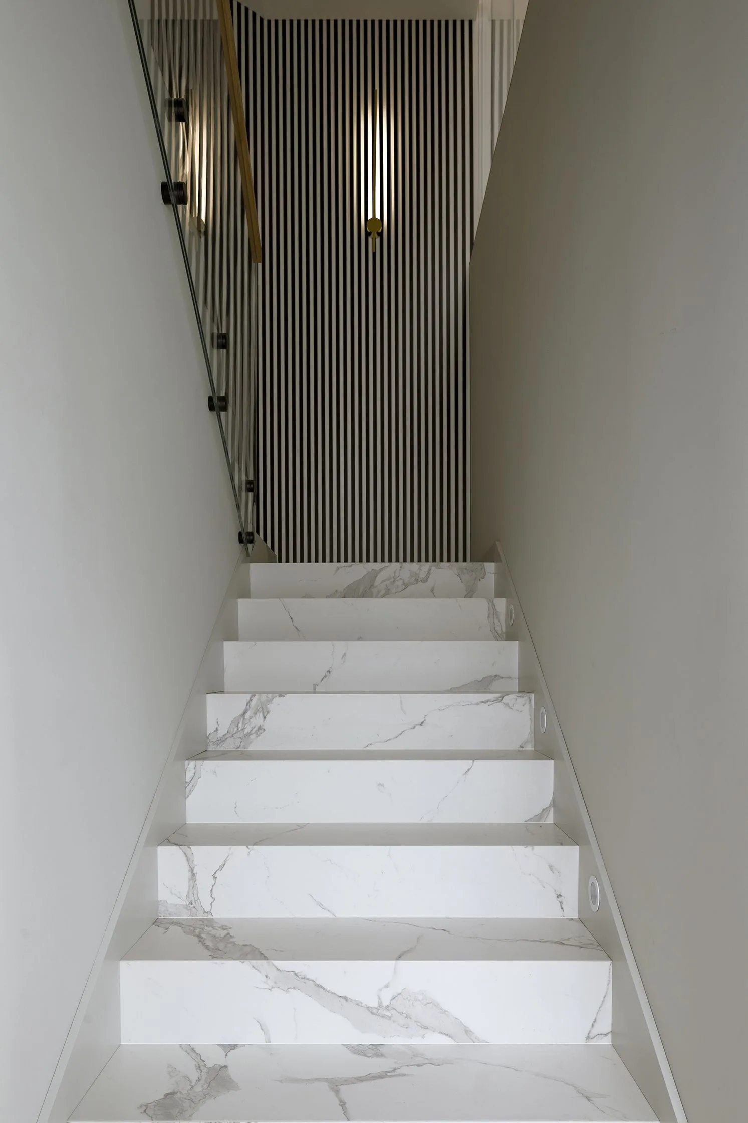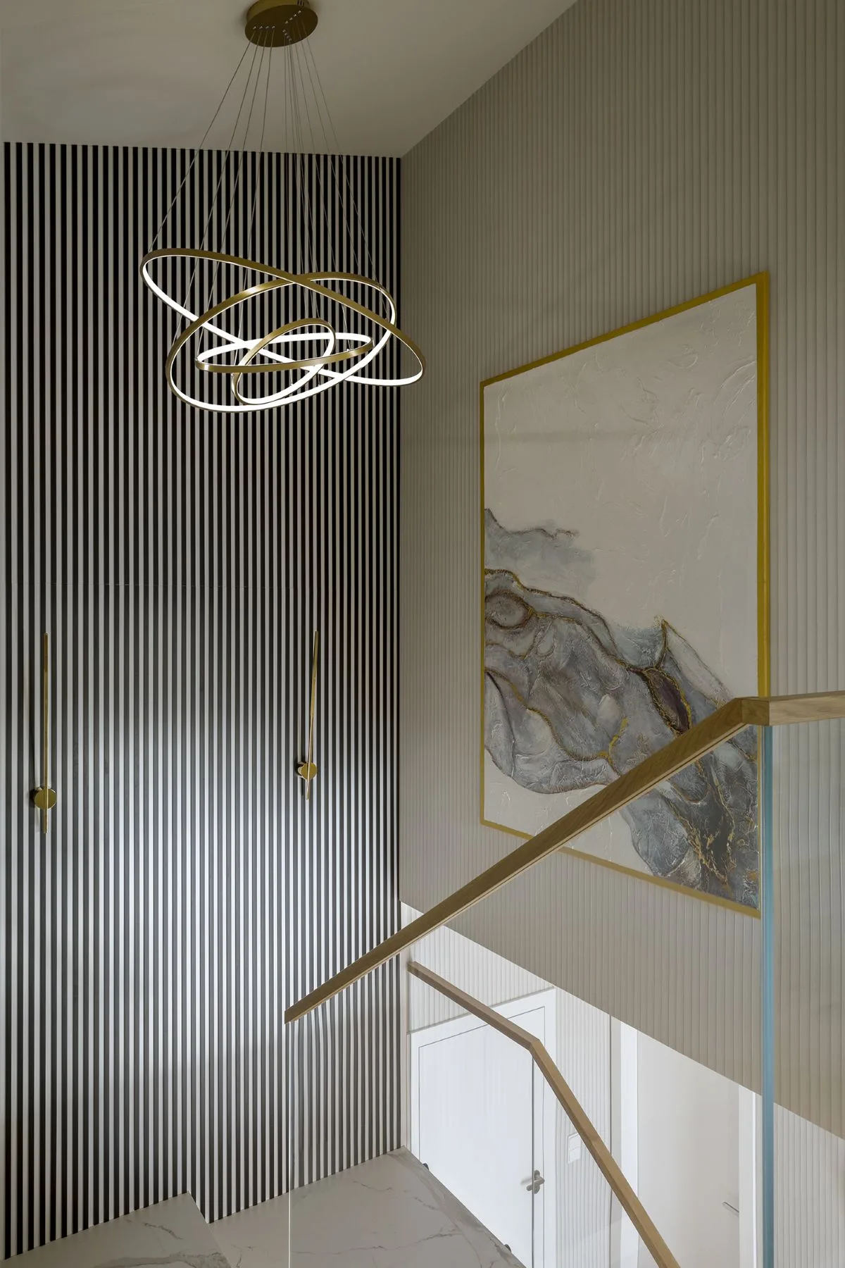 Projekt Hola Design to jednak nie tylko wrażenie – to detal, który urzeka. Drewniane lamele za telewizorem, powtórzone w innych częściach domu jako tapeta o wertykalnym rysunku, nadają przestrzeni rytm i spójność. Drewniany sufit z liniowym podświetleniem, wykonany z tej samej partii dębowego forniru co zabudowa meblowa, tworzy wrażenie architektonicznego ładu i harmonii materiału.