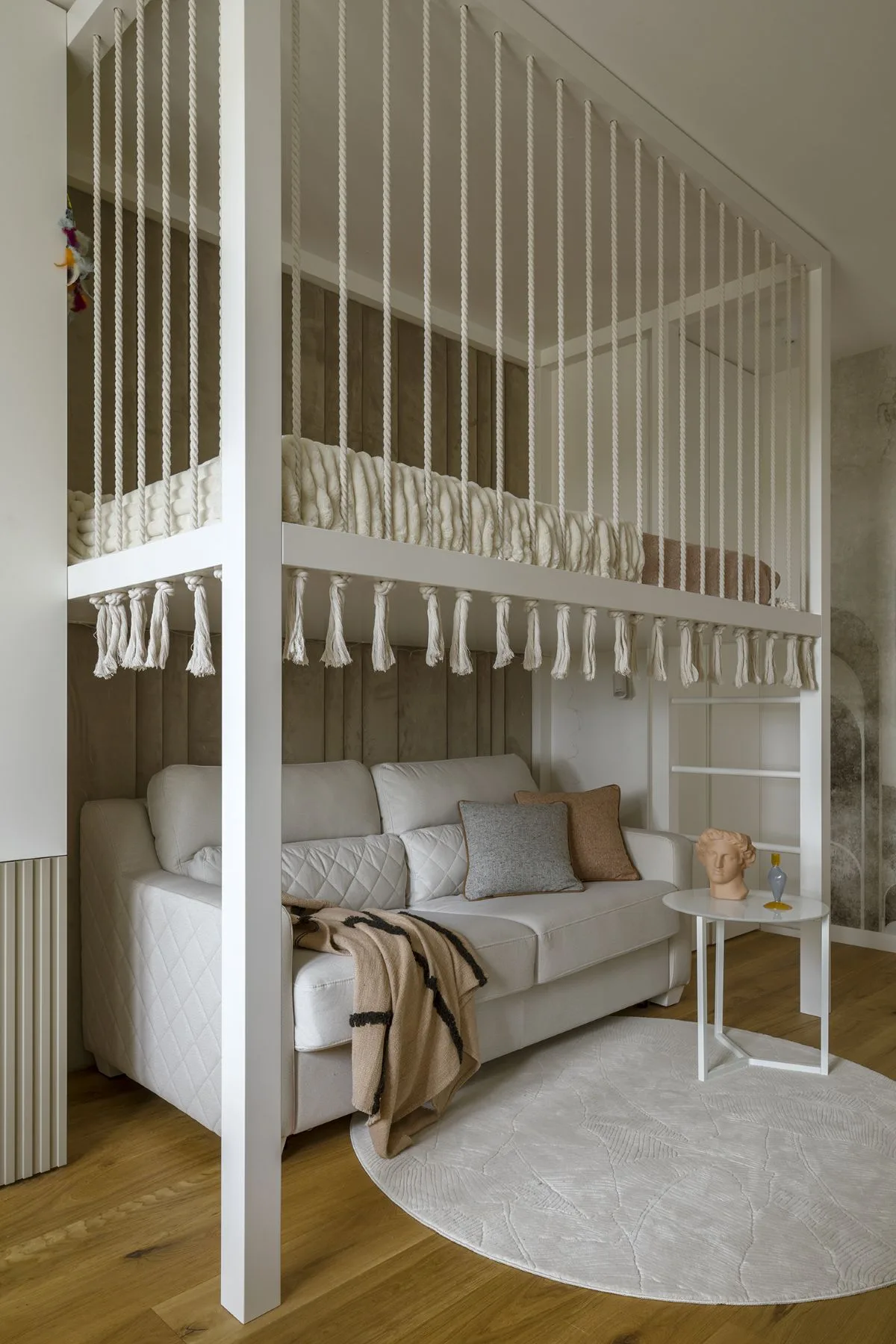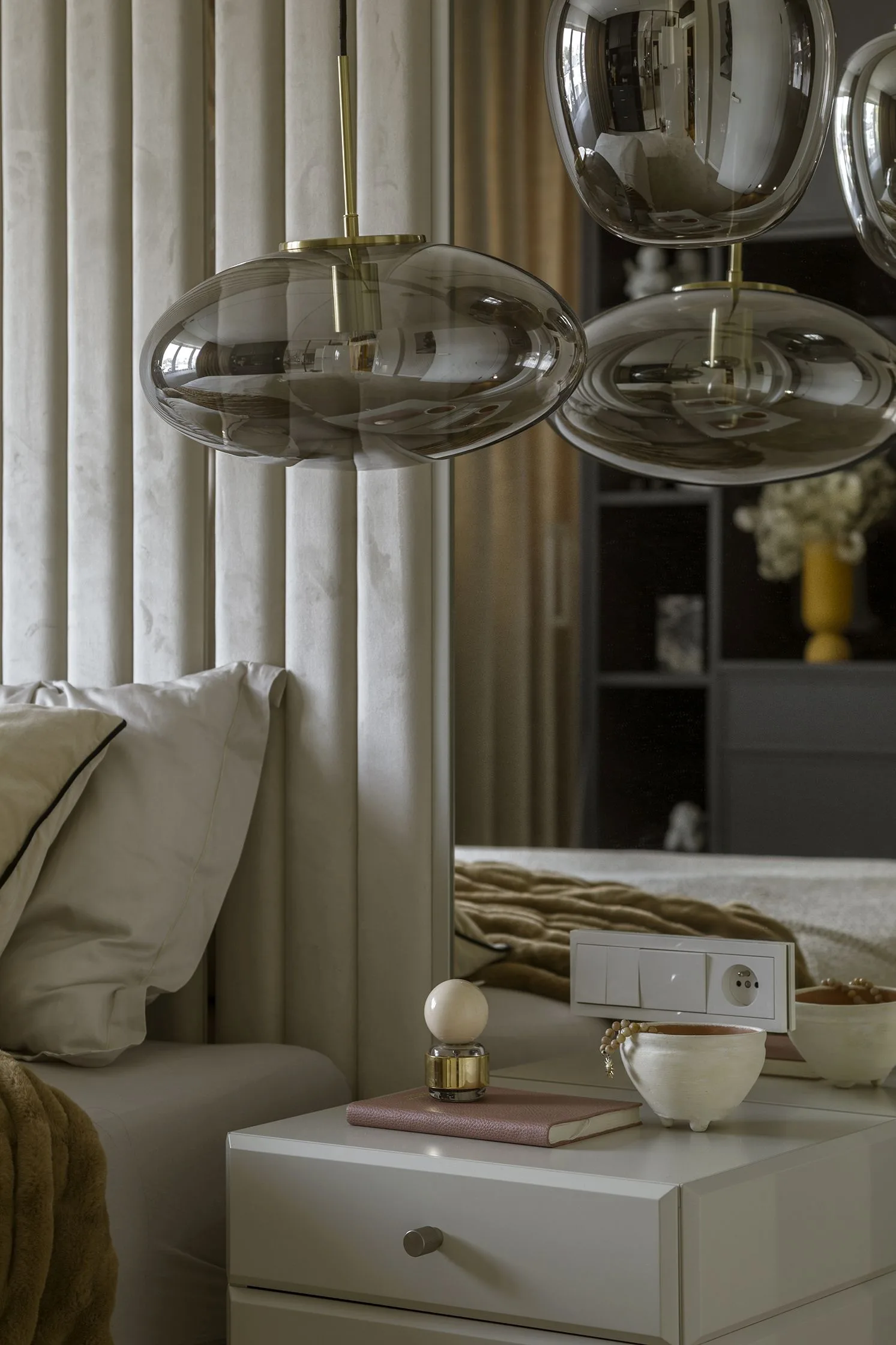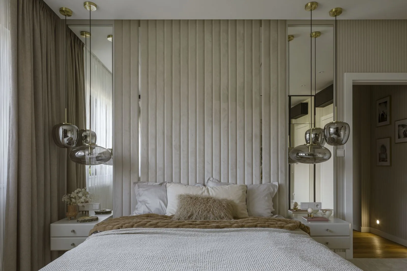 Piętro to prywatna strefa domowników – z dwoma przestronnymi sypialniami dzieci oraz master bedroom, która wraz z łazienką i garderobą tworzy prawdziwy apartament marzeń. W głównej sypialni dominują miękkie tkaniny, tapicerowane łóżko w odcieniach śmietanki i wykładzina, która tłumi dźwięki i potęguje wrażenie komfortu. Ściana za łóżkiem, zdobiona pionowymi panelami i lustrzanymi taflami, tworzy iluzję większej przestrzeni, wprowadzając zarazem subtelne odbicia światła.