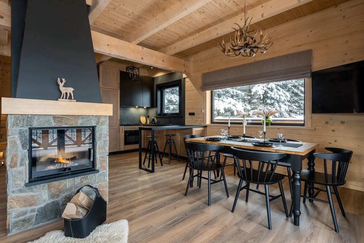 Założeniem projektowym było maksymalne otwarcie przestrzeni na parterze. Z salonu z kominkiem rozpościera się przecudowny widok na góry. Autentyczne bale wraz ze wszystkimi elementami naturalnych materiałów tworzą spójne, ciepłe wnętrze.