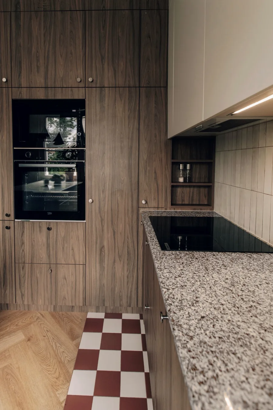 Motywem przewodnim pozostała estetyka lat 60., potraktowana nie jako sztywny szablon, lecz źródło inspiracji. Posadzka w kuchni w formie bordowej szachownicy, głęboka zieleń w strefie prywatnej czy niebieski sufit inspirowany obrazem z kolekcji właścicielki — to elementy, które scalają projekt wizualnie, ale też nadają mu indywidualny, emocjonalny rytm.