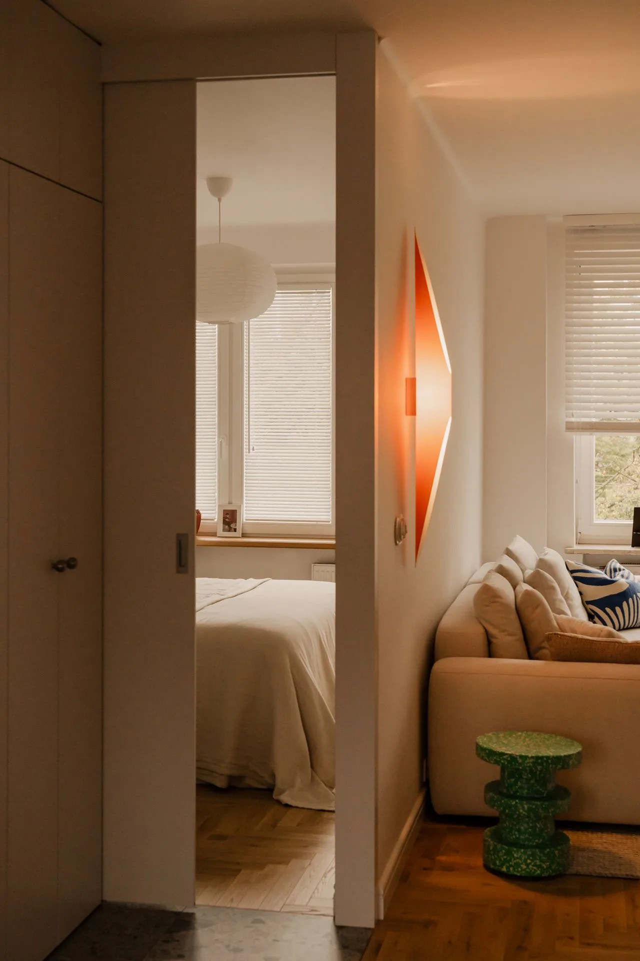To mieszkanie ma w sobie północny spokój i południowy temperament – ten rodzaj równowagi, który powstaje nie z kompromisu, ale z uważności. Właściciele, polsko-baskijskie małżeństwo, dzielą codzienność między Warszawą a Krajem Basków. Szukali więc miejsca, które stanie się ich miejską przystanią – zanurzoną w zieleni, a jednocześnie blisko pulsującego centrum i „starej” Warszawy.