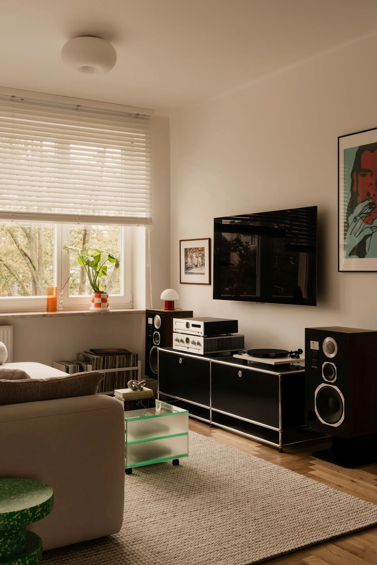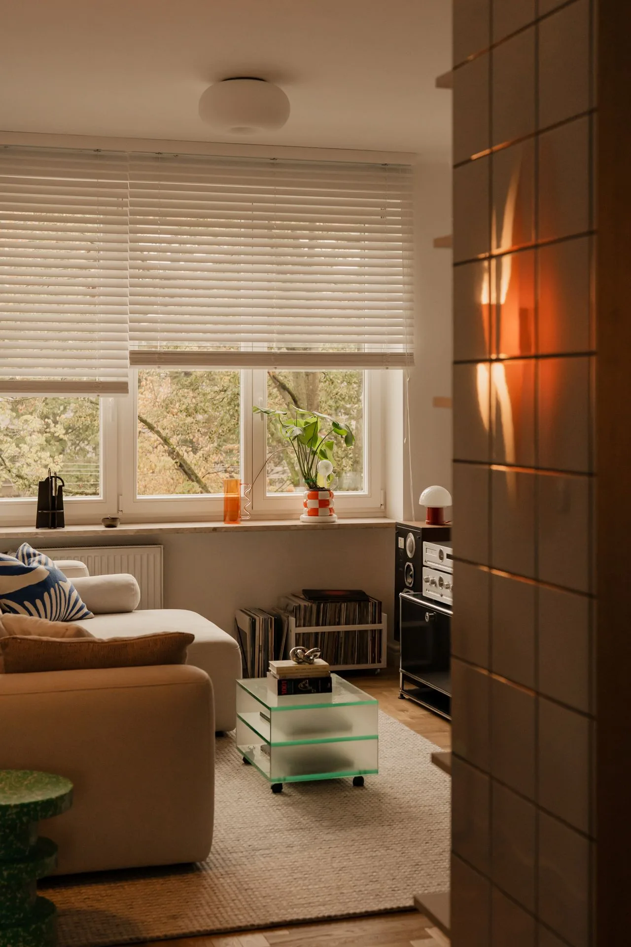 To nie jest wnętrze, które chce imponować. Jest raczej miejscem, w którym po prostu dobrze się żyje. Ciepło tworzą tu materiały, faktury, światło i muzyka płynąca z gramofonu. Każdy przedmiot i dekoracja staje się zalążkiem rozmowy, opowieści, pretekstem do wspomnień.