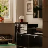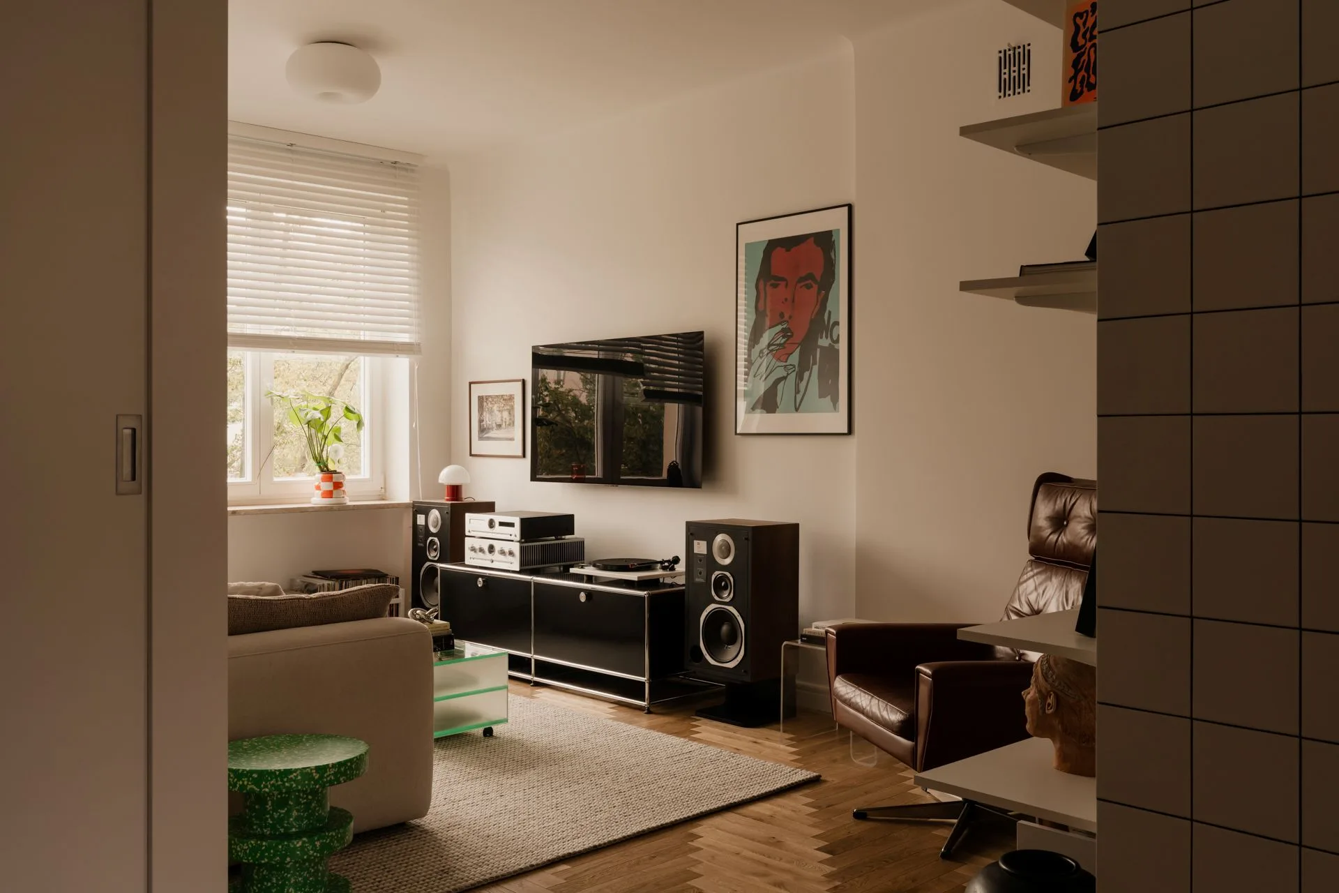 Wśród mebli pojawiają się perełki wzornictwa: duński fotel Georga Thamsa z lat 60., włoskie lampy z lat 90. (m.in. Shakti by Clerici), szwedzki stół z lat 70., a także szwajcarski klasyk – modułowa komoda USM. Każdy z tych obiektów ma swoją historię, ale razem nie tworzą kolekcji. Tworzą dom.