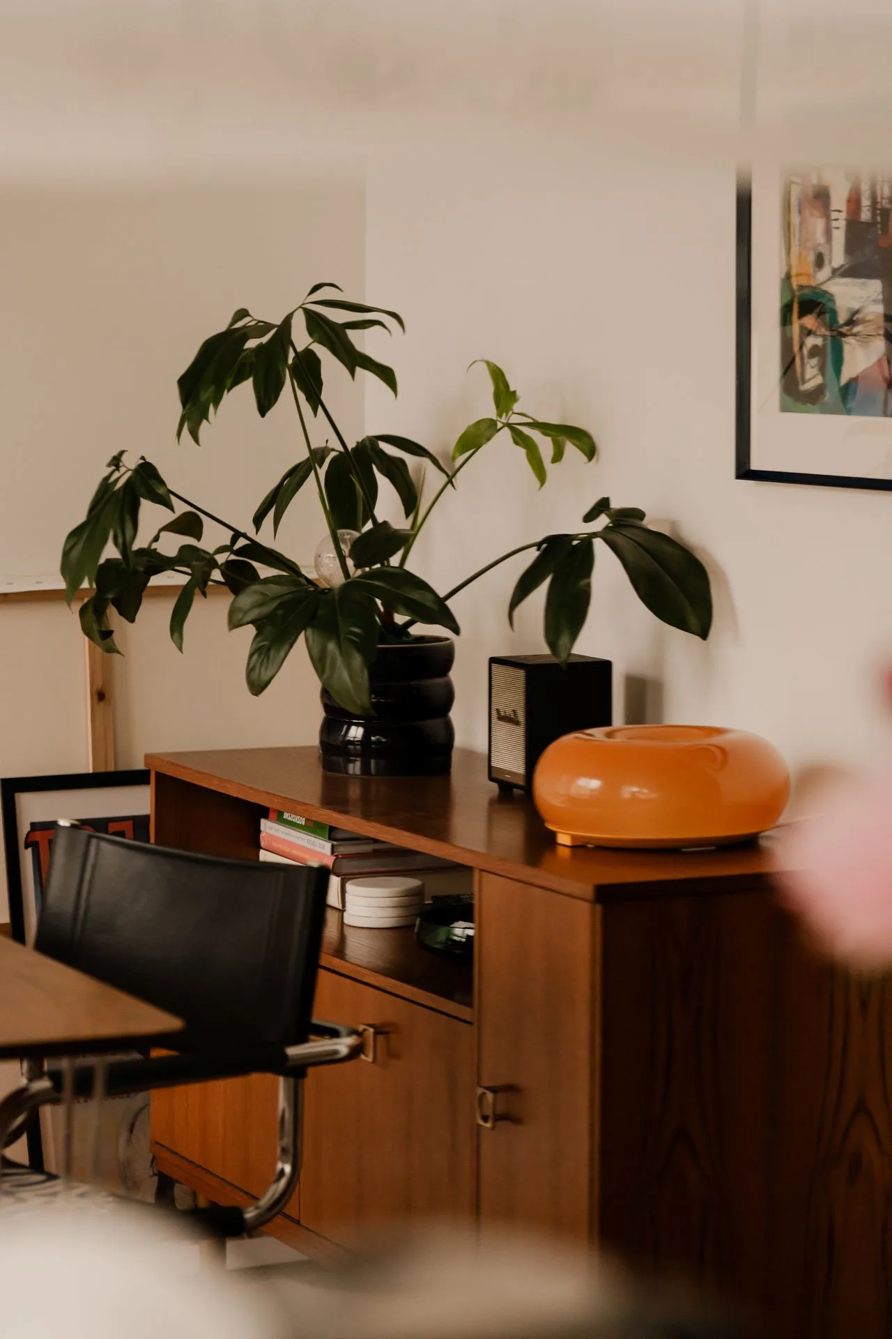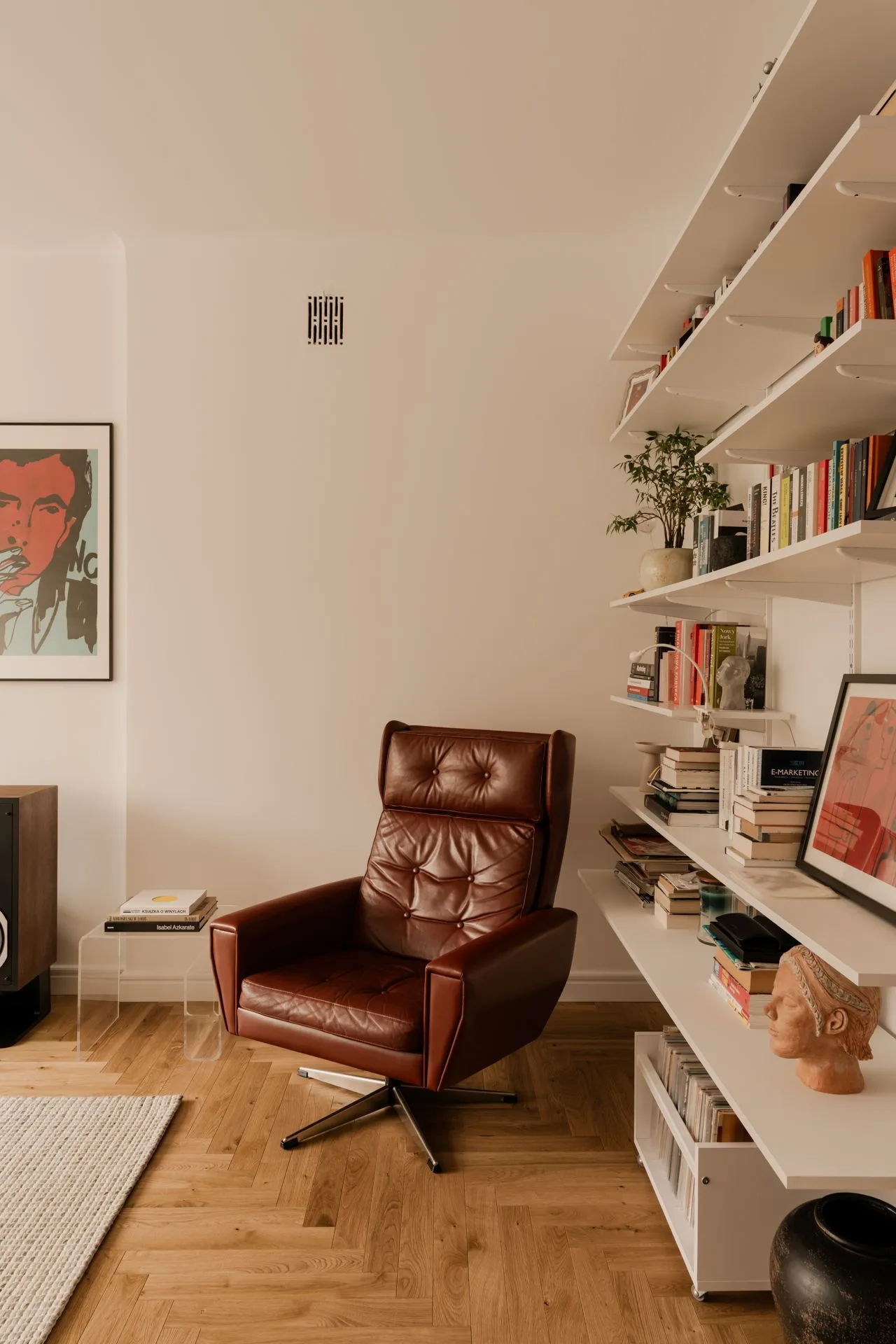 Dlatego obok designerskich ikon pojawiają się przedmioty osobiste: plakat Nicka Cave’a, obrazy przyjaciół, praca Kamila Lacha, baskijska rzeźba Iñigo Arregi, akwarela z widokiem ulicy, przy której para mieszkała kiedyś w Hiszpanii. Tak buduje się prawdziwa spójność – nie kolorem poduszek, lecz konsekwencją wrażliwości.