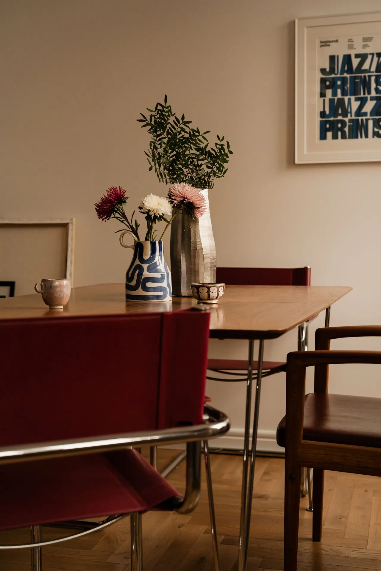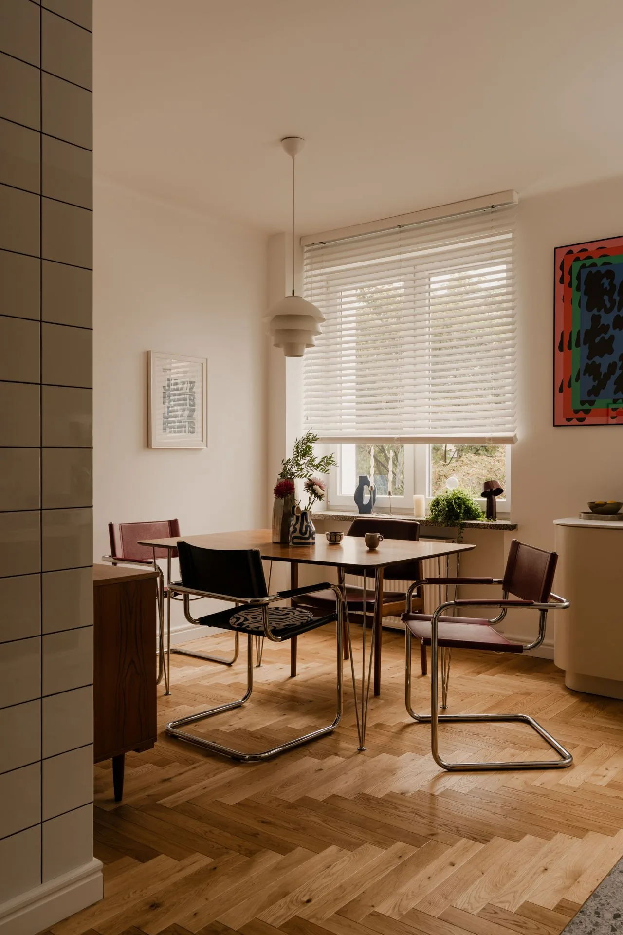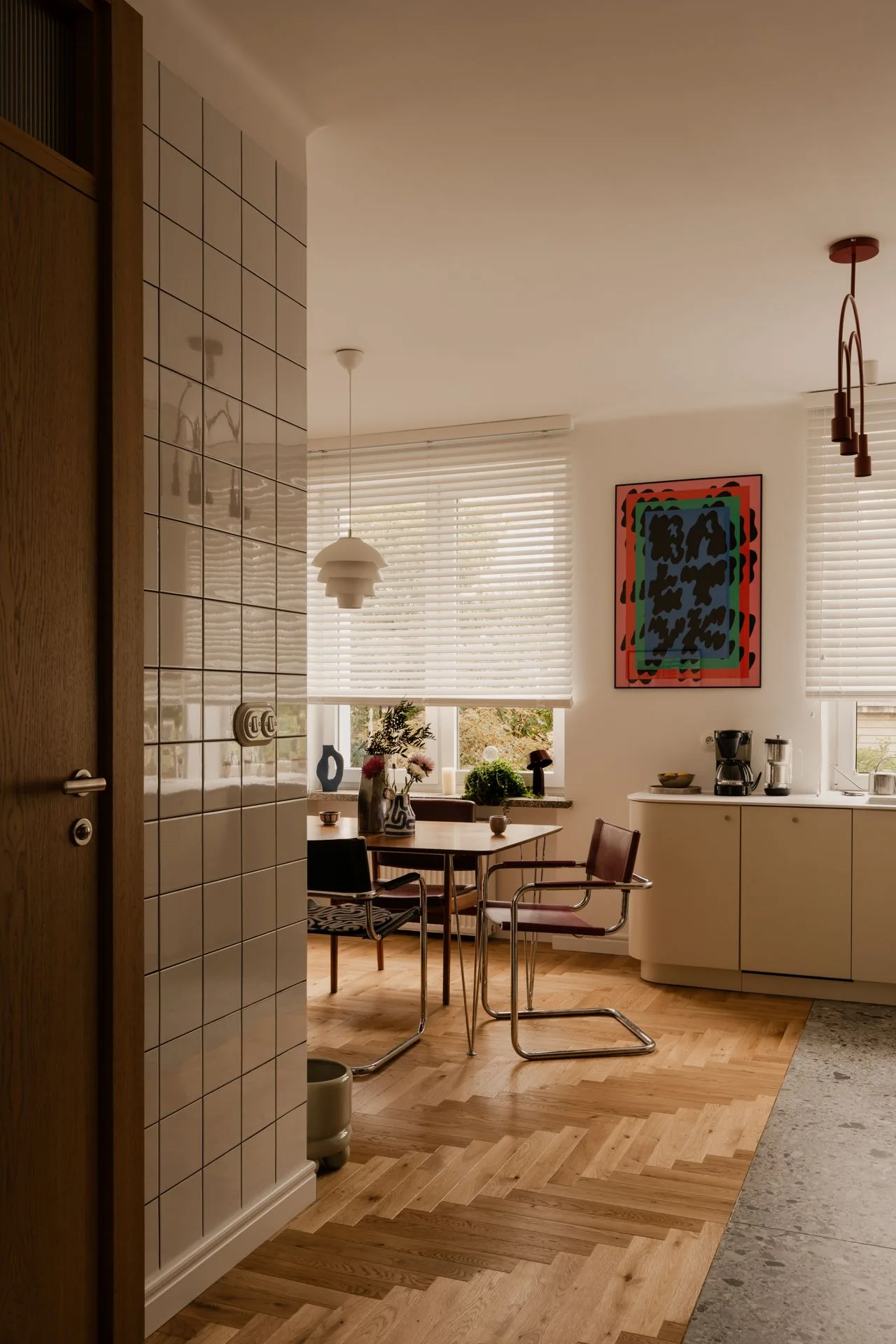 Estetyka wnętrza to mieszanka tego, co właściciele kochają najbardziej: modernistycznego vintage’u, unikalnych dodatków i naturalnych materiałów. Jest tu dyscyplina formy, ale nie ma w niej zimna. Jest szacunek do klasyki, ale bez muzealnego dystansu.