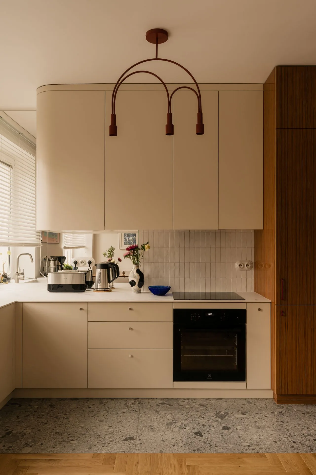 Retro detale, jak ceramiczne włączniki, spotykają się z nowoczesnymi akcentami bez spięcia i bez udowadniania racji. Kuchnia – lakierowany fornir i połyskujące lustro – otwiera przestrzeń, a strefy przenikają się subtelnie. W mieszkaniu można się zaszyć w wielu przytulnych kątach: z herbatą, książką, przy świetle lampy. Docenić chłodniejszy klimat Warszawy, który daje inny rodzaj odpoczynku niż ukochany Kraj Basków – bardziej introwertyczny, bardziej miękki, bardziej „do środka”.