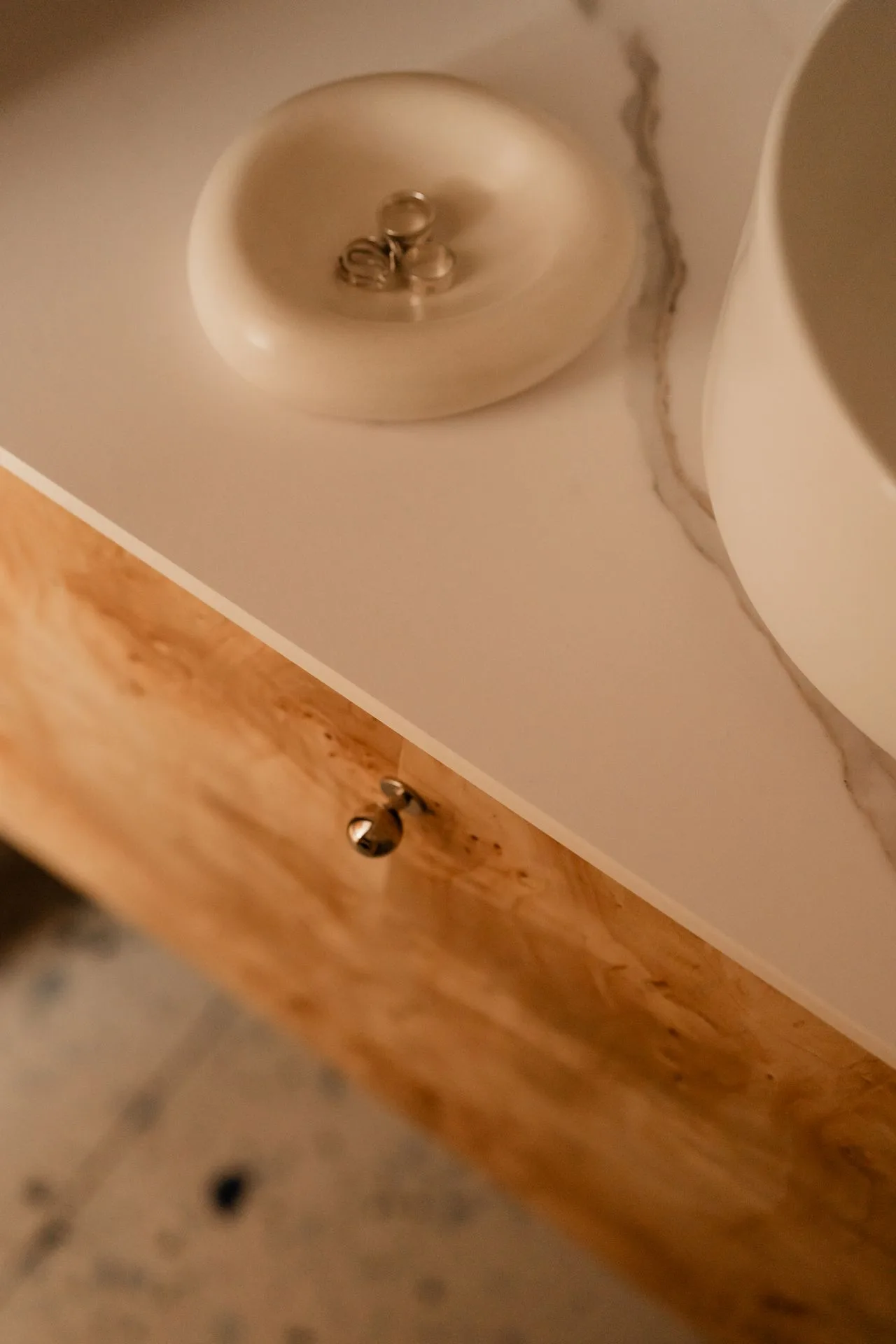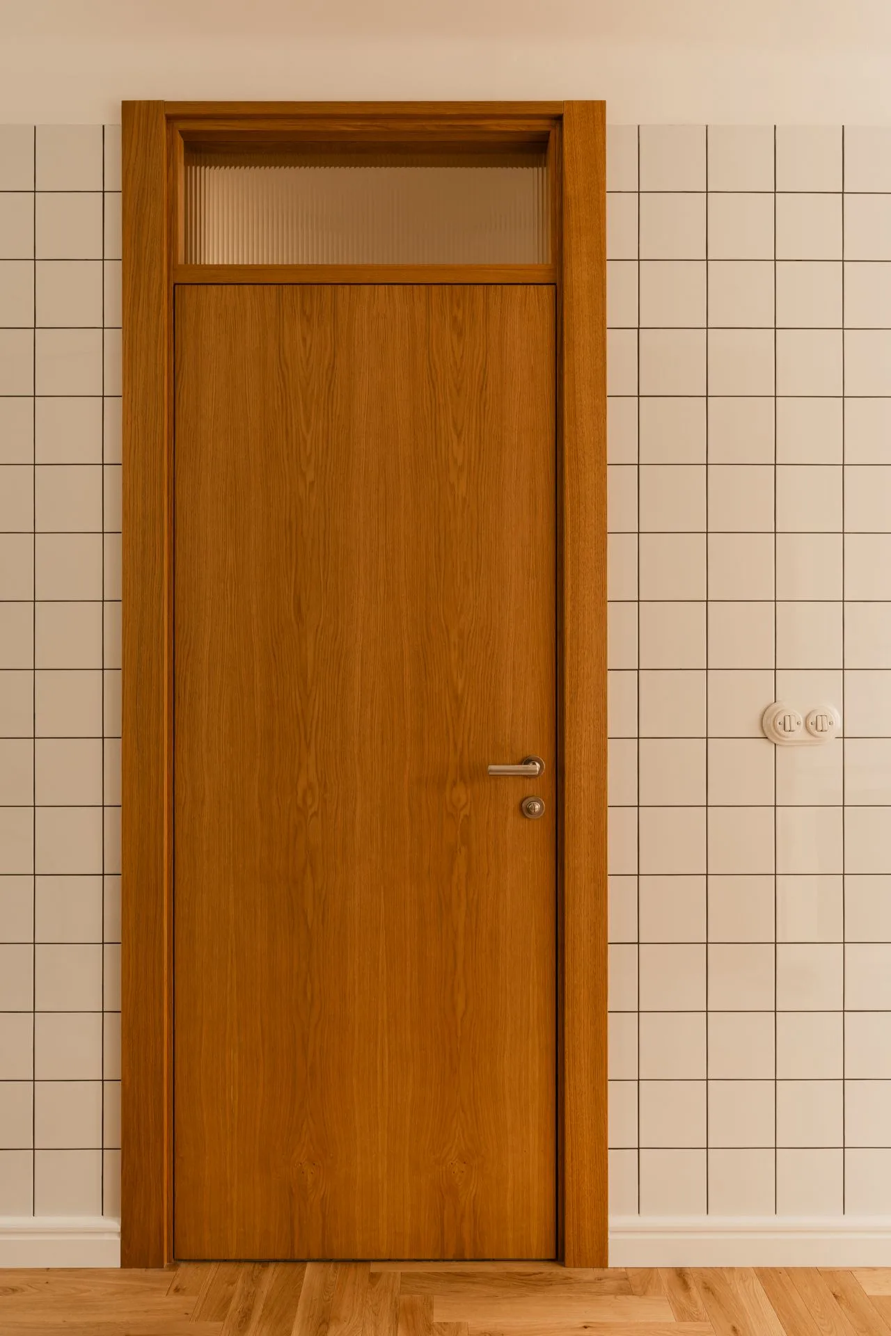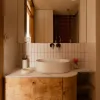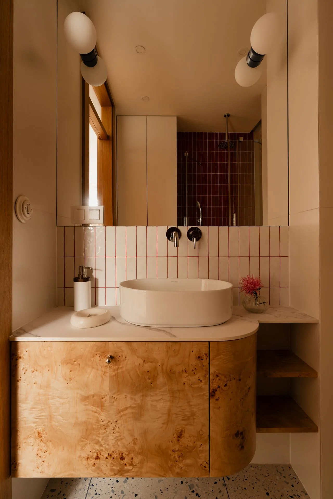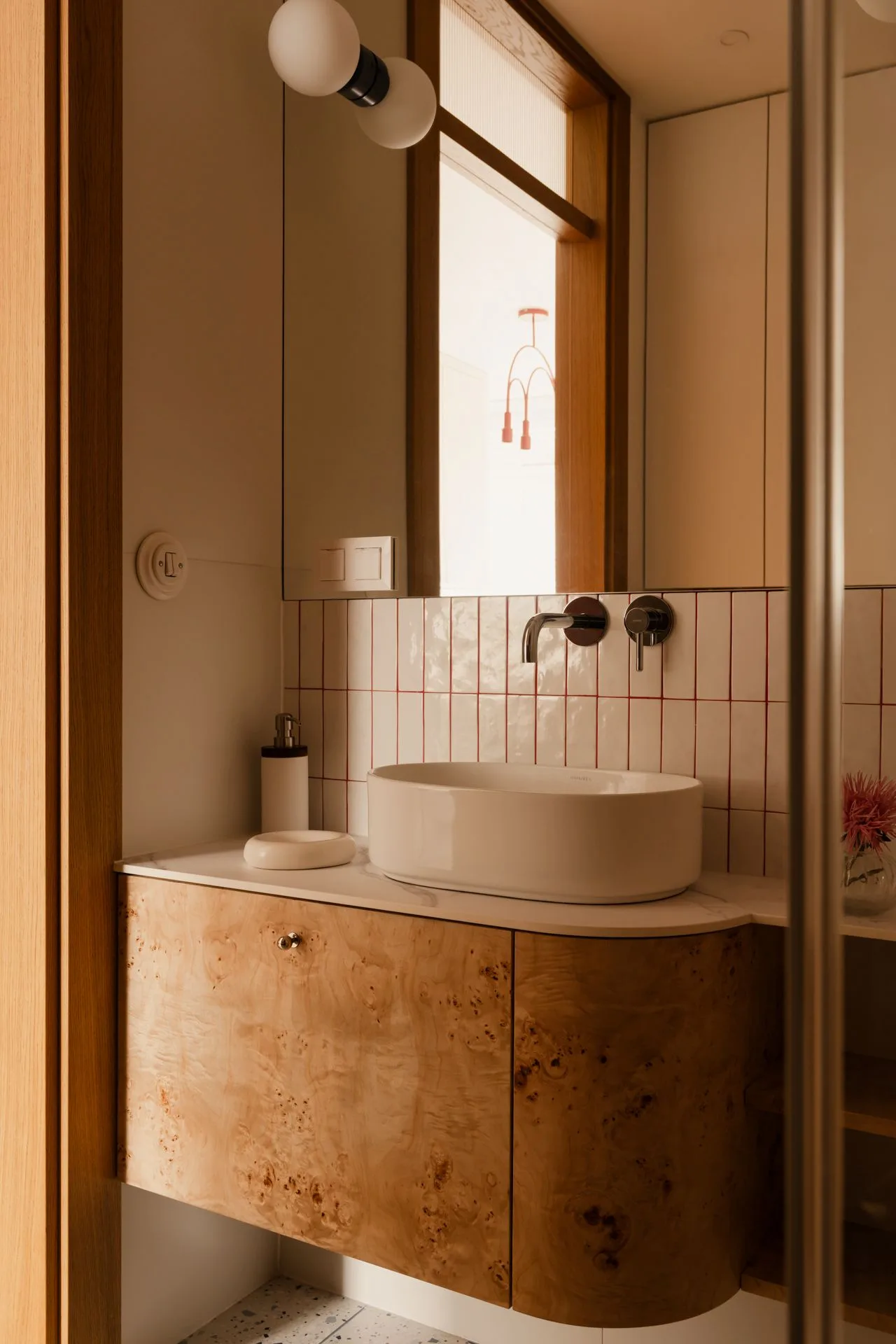 Rano światło miękko rozlewa się po fornirowanej kuchni, jakby chciało zaznaczyć początek rytuałów. W południe odbija się w lustrze – wpasowanym między okno a zabudowę – i wraca do wnętrza powiększone, rozproszone, jaśniejsze. Wieczorem natomiast tańczy na czeczotowych frontach w łazience, podkreślając strukturę materiału, jego organiczny rysunek i ciepłą głębię.