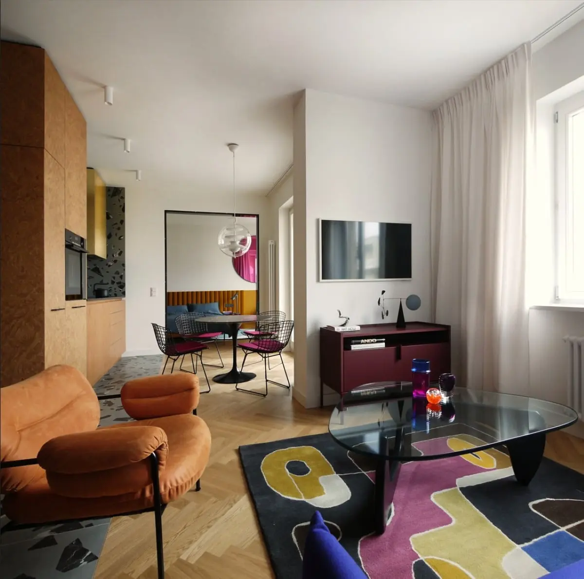 Główną inspiracją podczas tworzenia koncepcji aranżacji mieszkania, były wnętrza z lat 60. oraz 70. Architekci sięgnęli po wibrujące kolory i formy, a także meble i obiekty z epoki. Motywem przewodnim stała się musztardowa lamperia, przecinająca fronty szaf, która pojawiła się w holu. Jej kontynuację można znaleźć w sypialni – nie tylko na ścianach i wtapiającym się w kolorowy pas, pikowanym zagłowiu łóżka, ale również dwukolorowej kotarze, która pełni funkcję „drzwi” między salonem, a sypialnią. Organiczne sylwetki mebli czy barwny dywan z abstrakcyjnym wzorem, nawiązują do stylu retro. W aranżacji znalazł się, także kobaltowy fotel RM58, którego pierwowzór został zaprojektowany przez Modzelewskiego pod koniec lat 50. Obecnie produkuje go polska marka Vzór.