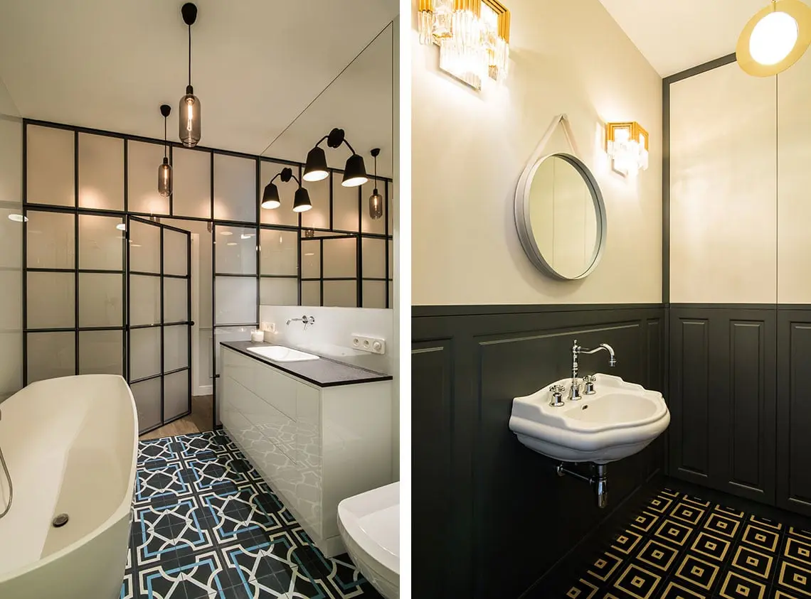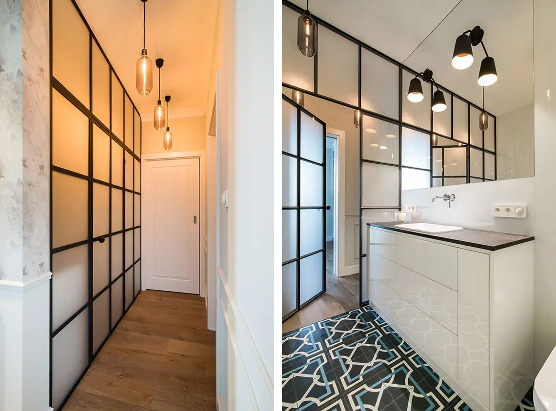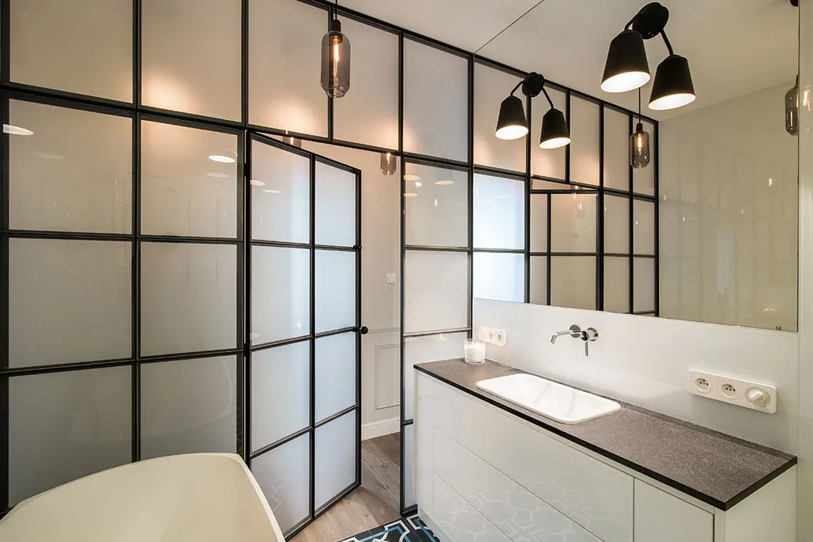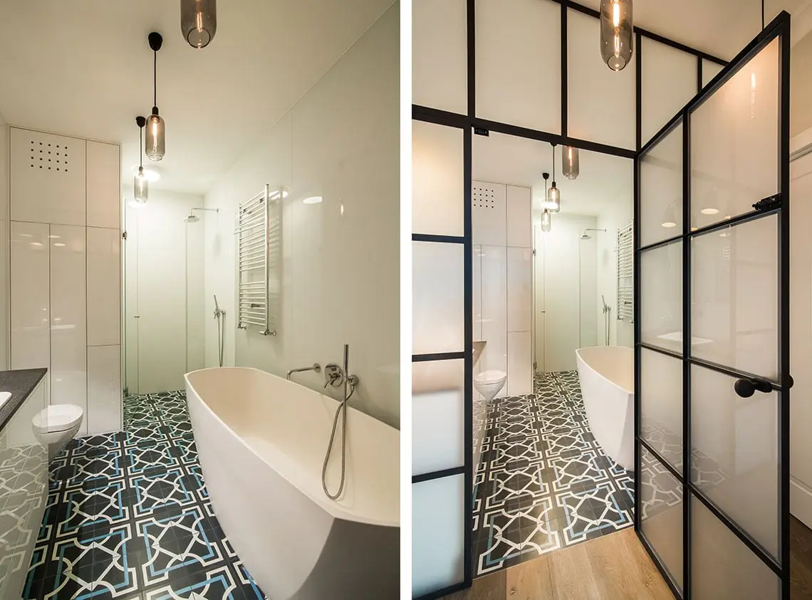 Łazienka przypominająca salon kąpielowy znajduje się za drzwiami o stalowych szprosach z mlecznymi szybkami. Dzięki temu rozwiązaniu do łazienki wpada naturalne światło, tym samym czyniąc ją jaśniejszą i przestronniejszą. Kontrastem do białych ścian jest wzorzysta podłoga pokryta cementowymi płytkami.