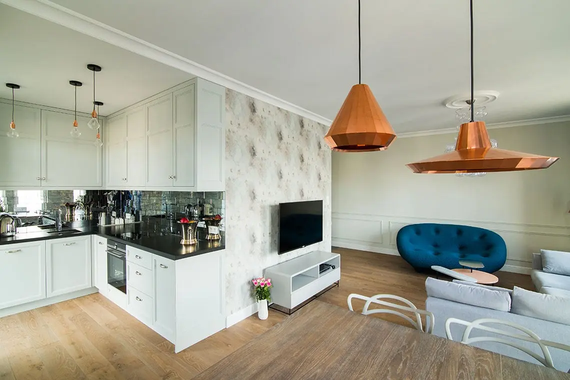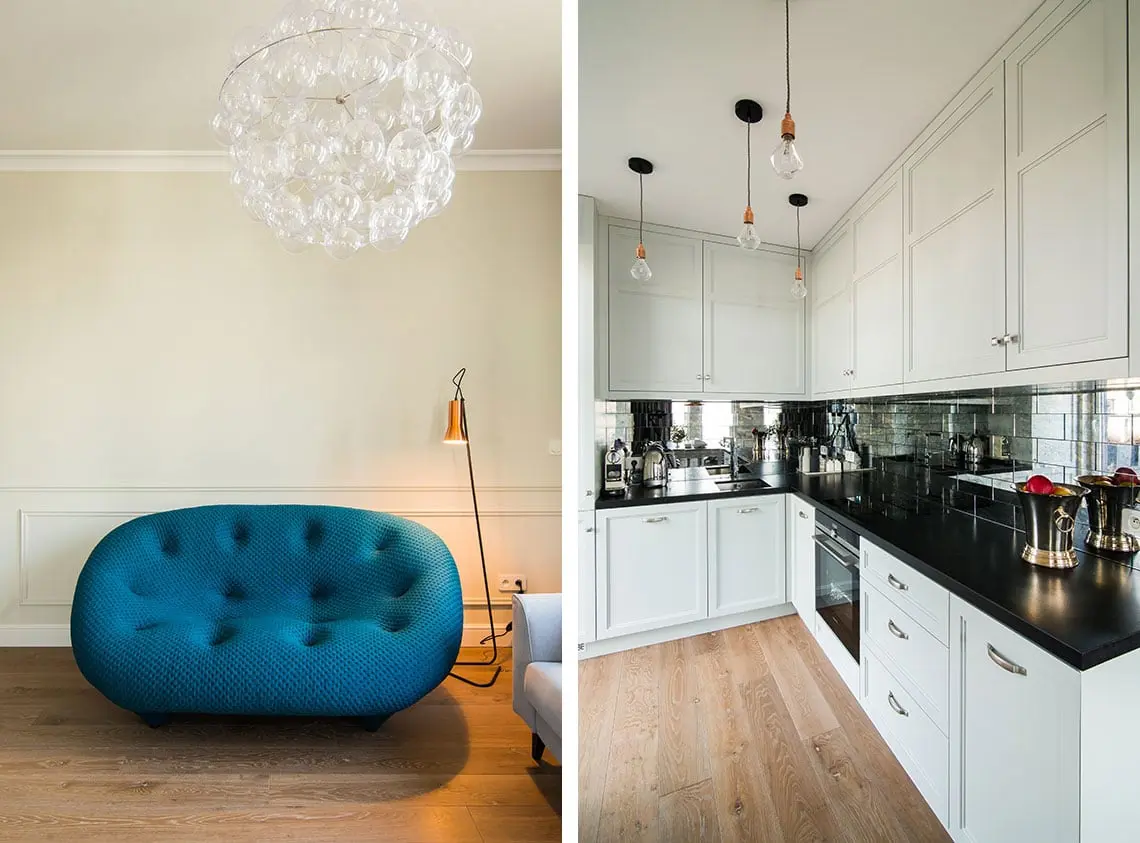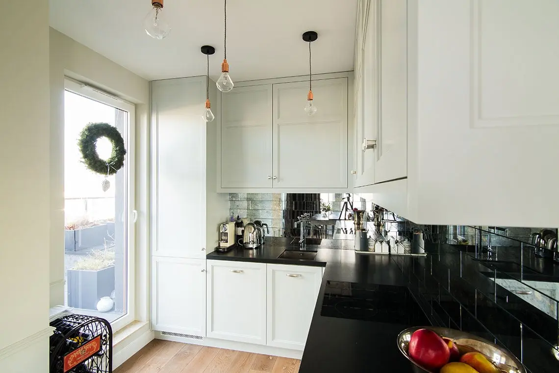 Dopełnieniem wizerunku są szare krzesła oraz niewielka kuchnia znajdująca się tuż obok salonu. Elementem, który najbardziej przyciąga wzrok jest oczywiście oryginalna ściana nad blatem. Zamiast tradycyjnych kafelków lub popularnego szkła użyto postarzane lustra w małych formatkach tworzących układ cegiełki. Całość sprawia, że kuchnia wydaje się elegancka, przestronna oraz jasna, gdyż odbija promienie świetlne wpadające przez okno balkonowe znajdujące się tuż obok.
