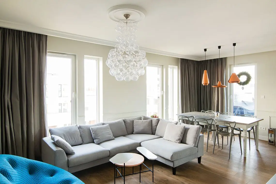 Głównym założeniem i zarazem prośbą skierowaną do architektów było niezagracenie mieszkania – to na tym najbardziej zależało mieszkańcom. Udało się. Wnętrze nie jest przeładowane zbędnymi dekoracjami, rekwizytami czy meblami. Jest czysto i przejrzyście. Ma swój w tym udział również zastosowana stonowana kolorystyka, gdzie barwą przewodnią jest szarość.
