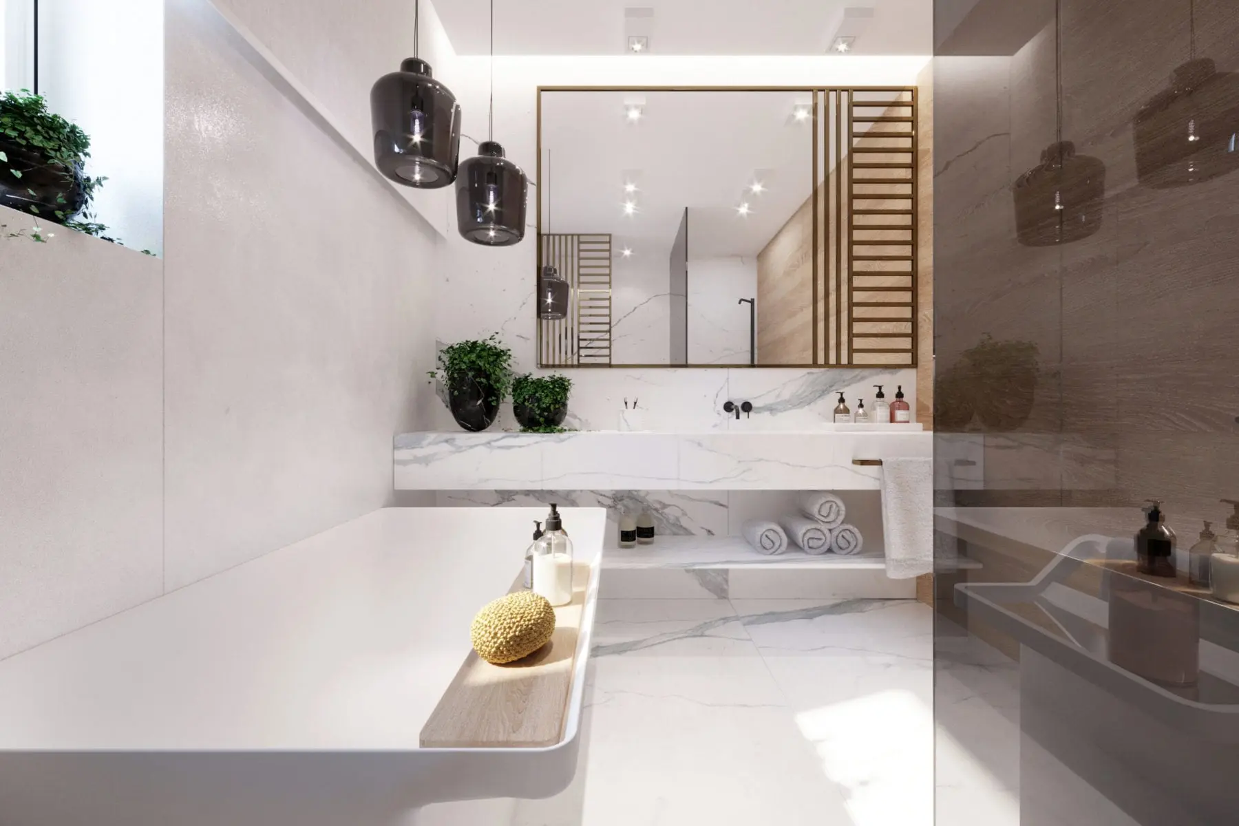 Zgdonie z filozofią biura architektonicznego, we wnetrzu znajdują się naturalne materiały. Spójne przewodnie motywy, takie jak elegancki i ponadczasowy marmur calacatta, fornirowane jesionem ściany, czy ażurowe mosiężne przegrody znajdujące się w sypialni, łazienkach i na poddaszu.