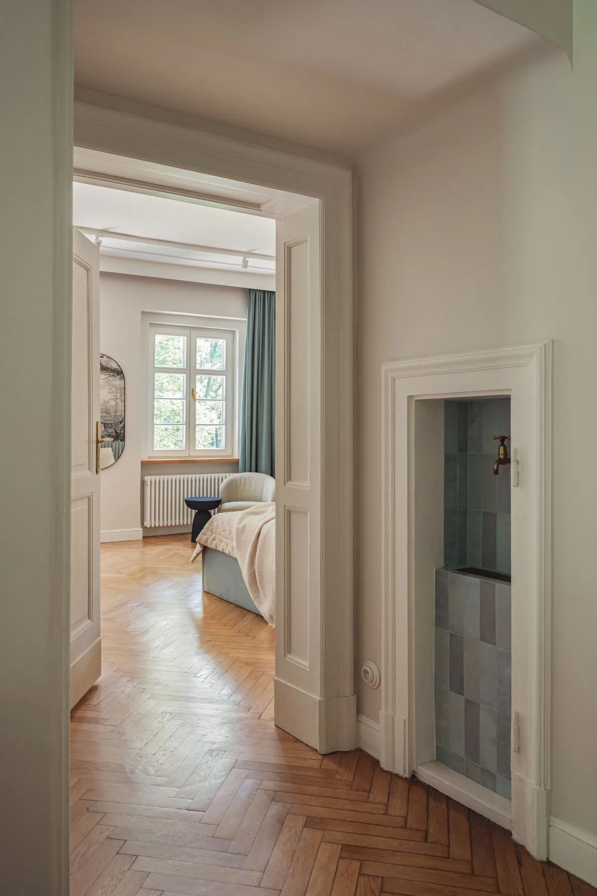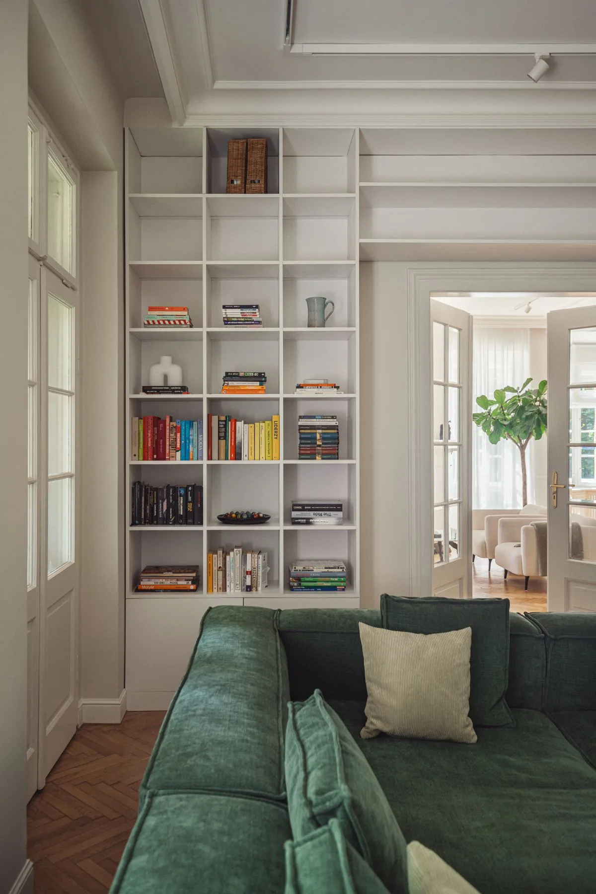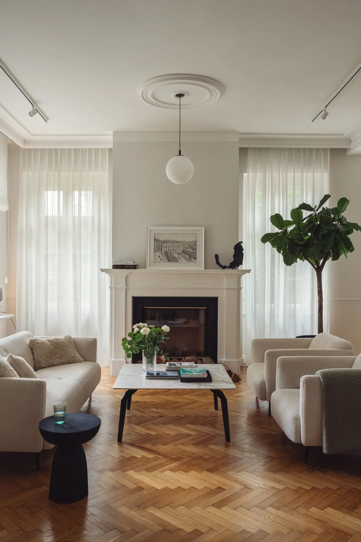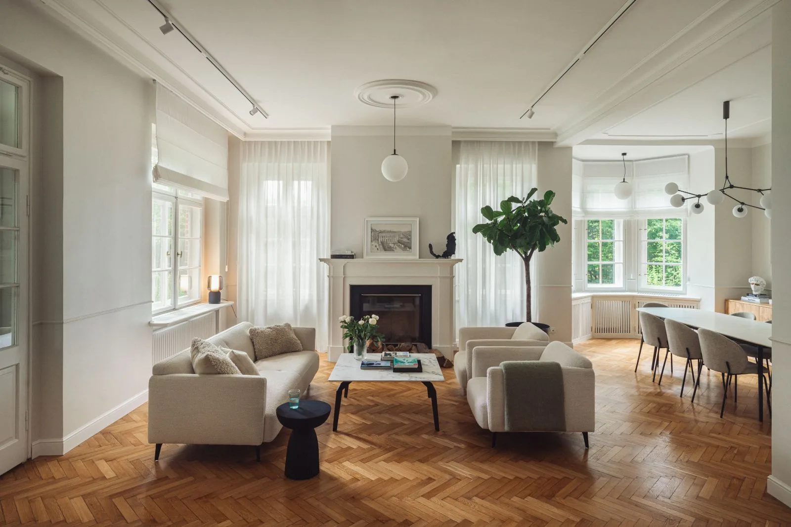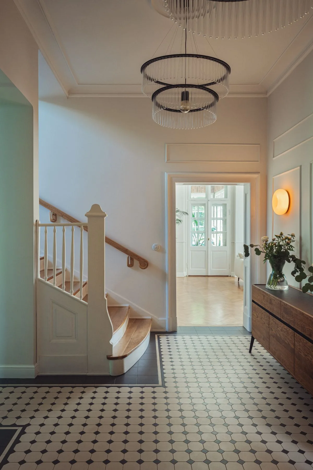 Strefa dzienna parteru została starannie odtworzona – jasna, przestronna i otwarta, z płynnie przenikającymi się wnętrzami. Oryginalny parkiet z lat 20. został pieczołowicie odrestaurowany i wciąż stanowi o duszy tego miejsca. Nową posadzkę położono jedynie w holu, kuchni i małej toalecie – tam, gdzie pierwotna powierzchnia nie nadawała się już do renowacji. Zastosowano klasyczną czarno-beżową mozaikę z podwójną bordiurą, nadającą przestrzeni elegancji w stylu retro.