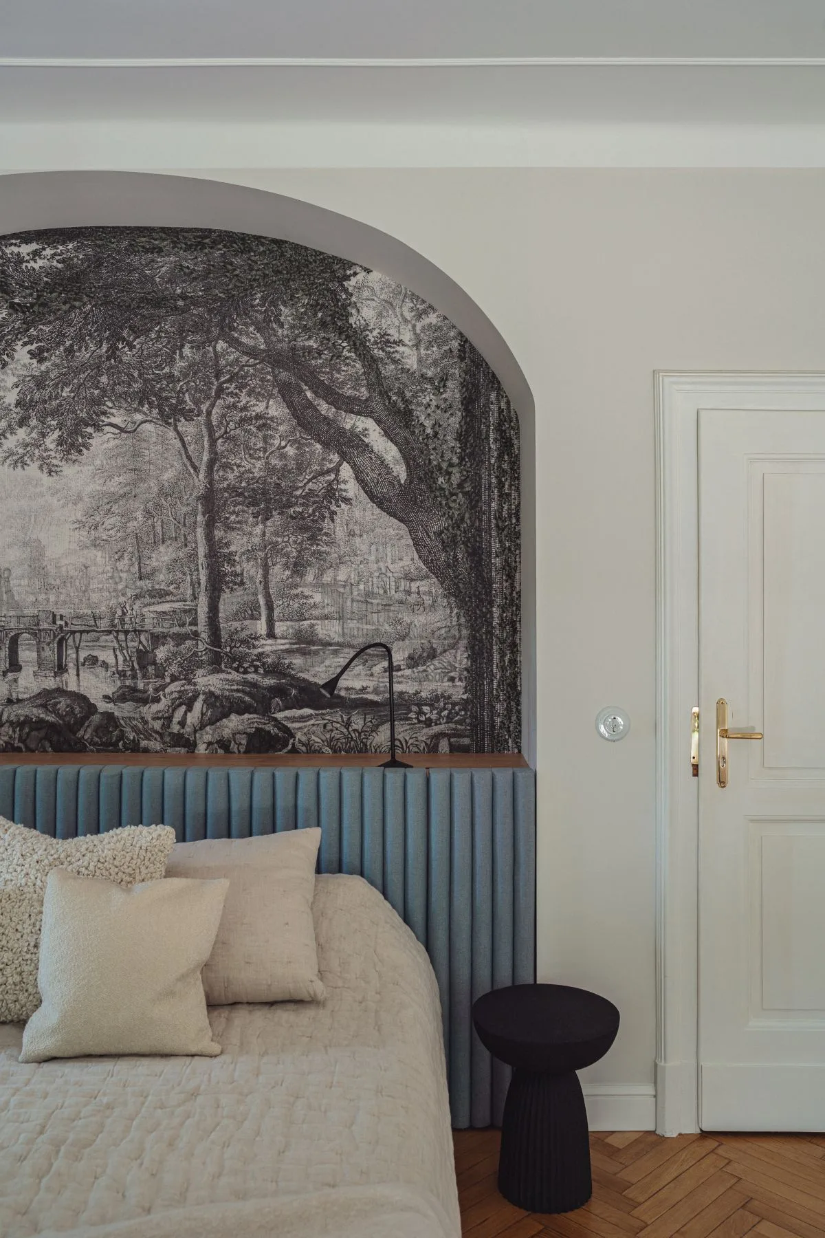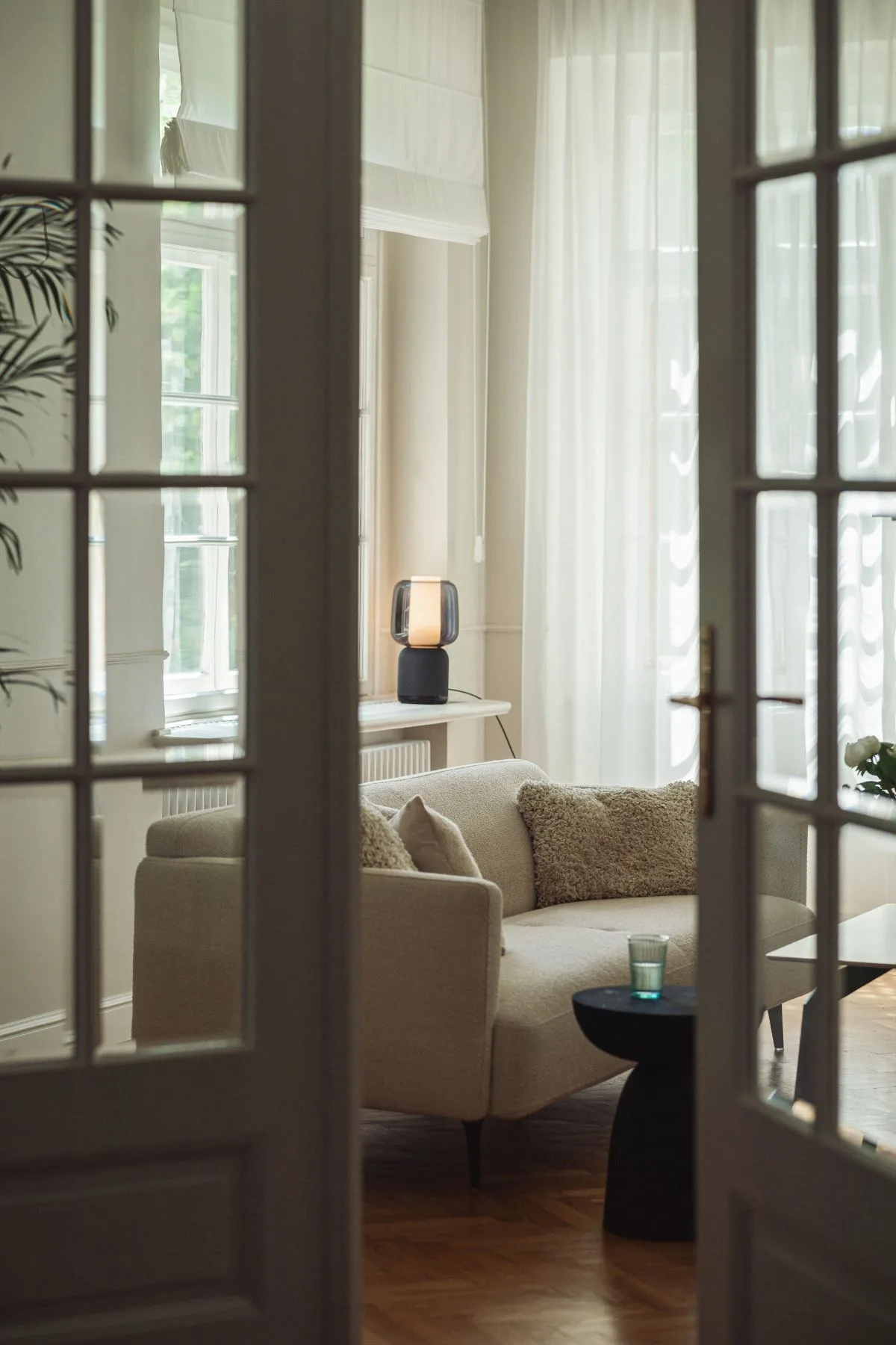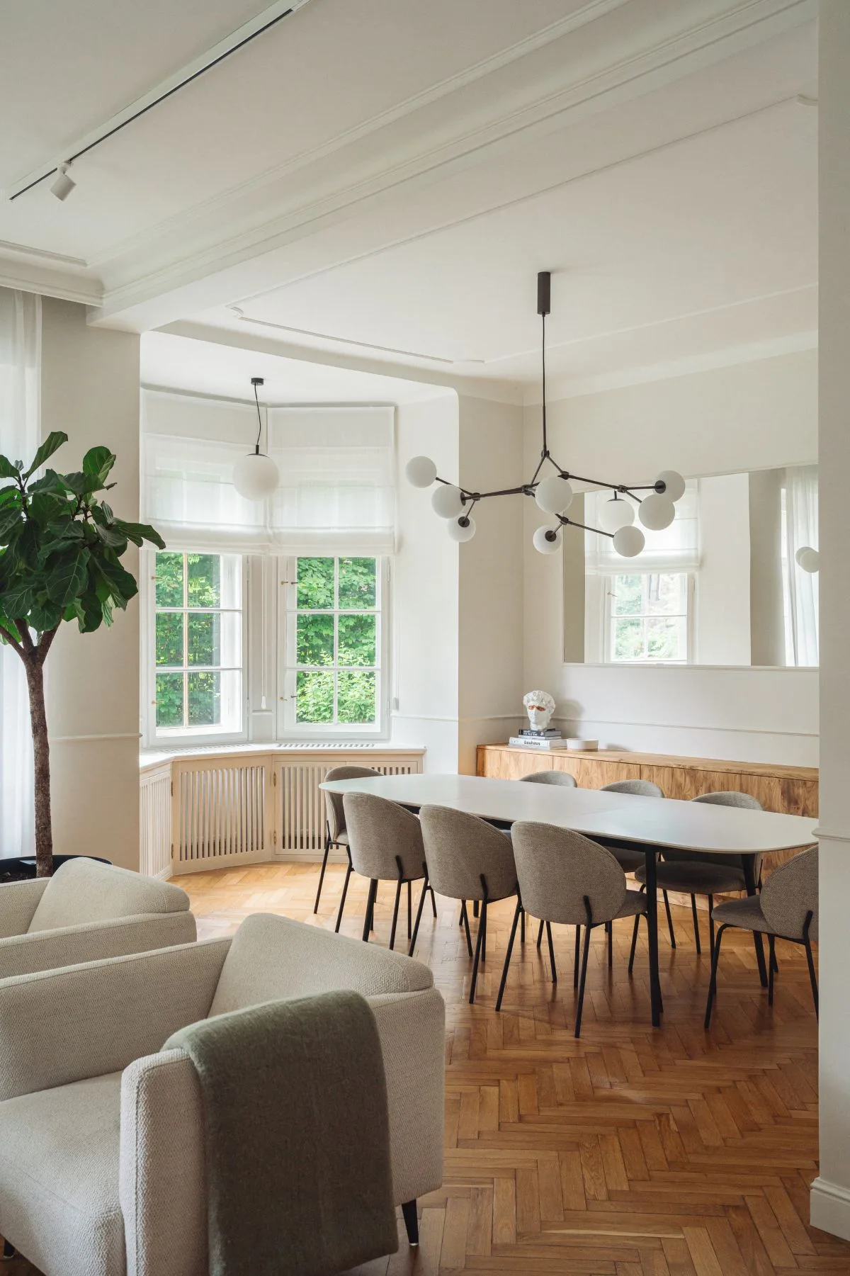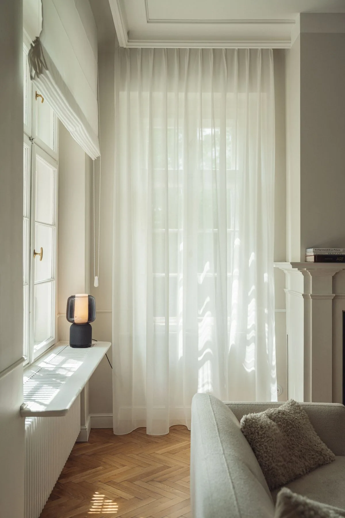 Dopełnieniem stylu są delikatne sztukaterie, żyrandole od Pani Jurek oraz 101 Copenhagen, które nadają wnętrzom szlachetności i subtelnej ekstrawagancji. Lniane zasłony w salonach miękko filtrują światło, dodając całości naturalności i przytulności.