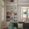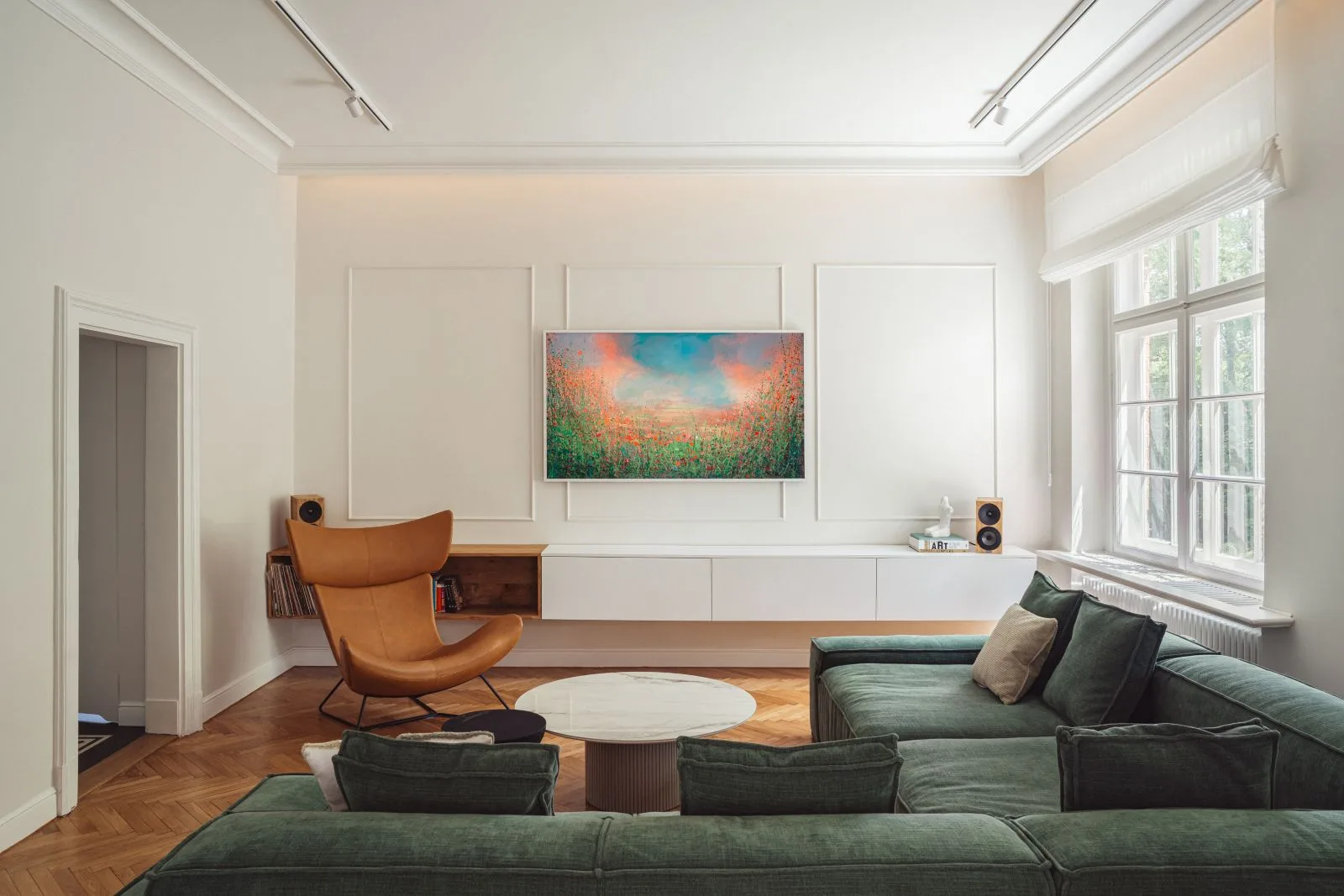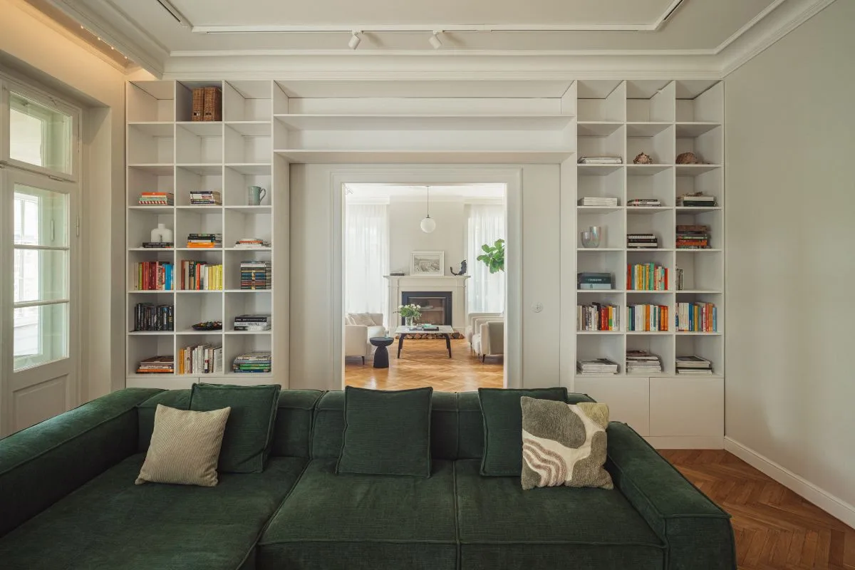Oba salony współgrają ze sobą stylistycznie, lecz każdy pełni odmienną funkcję. Pierwszy to pokój wypoczynkowo-telewizyjny z głęboką, zieloną kanapą oraz imponującą biblioteką – centrum intelektualne i dekoracyjne tego domu. Drugi salon, z eleganckim stołem jadalnianym i miejscem do relaksu, skupia uwagę wokół oryginalnego, monumentalnego portalu kominkowego – prawdziwego skarbu tej rezydencji.