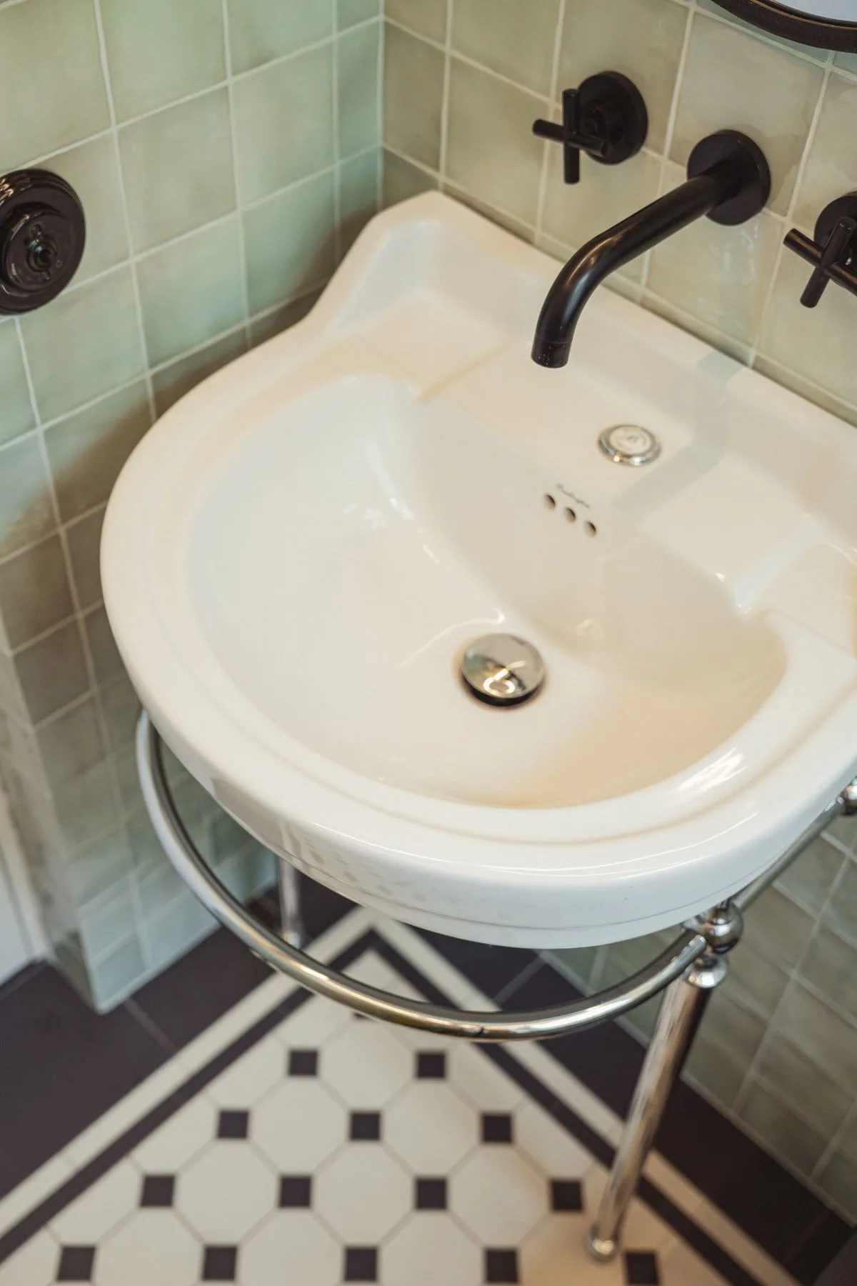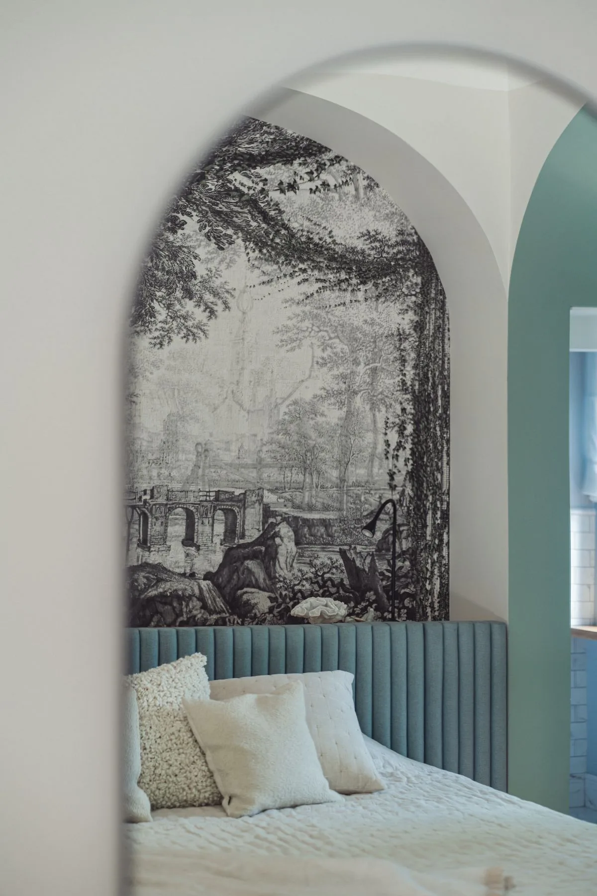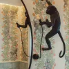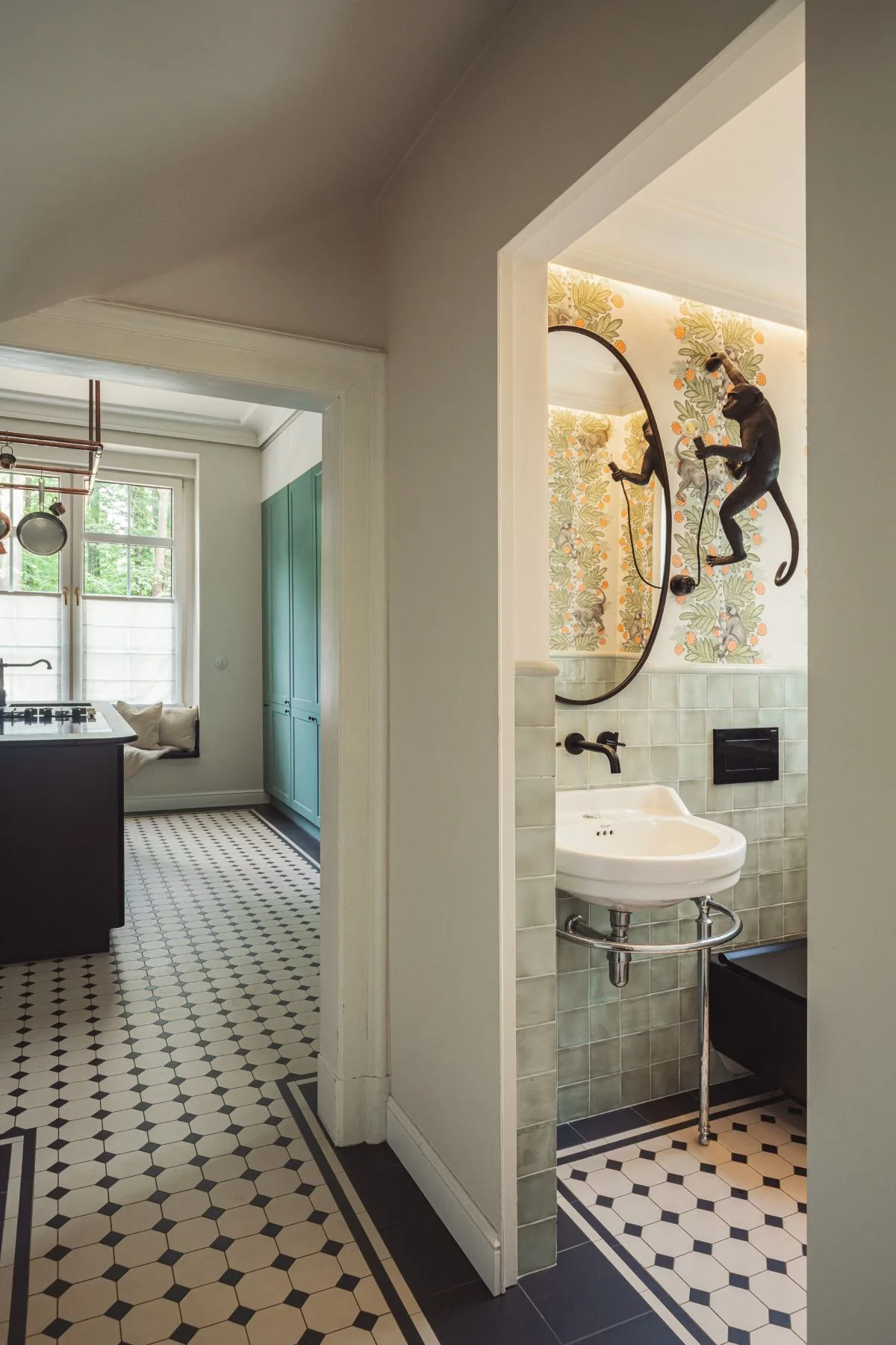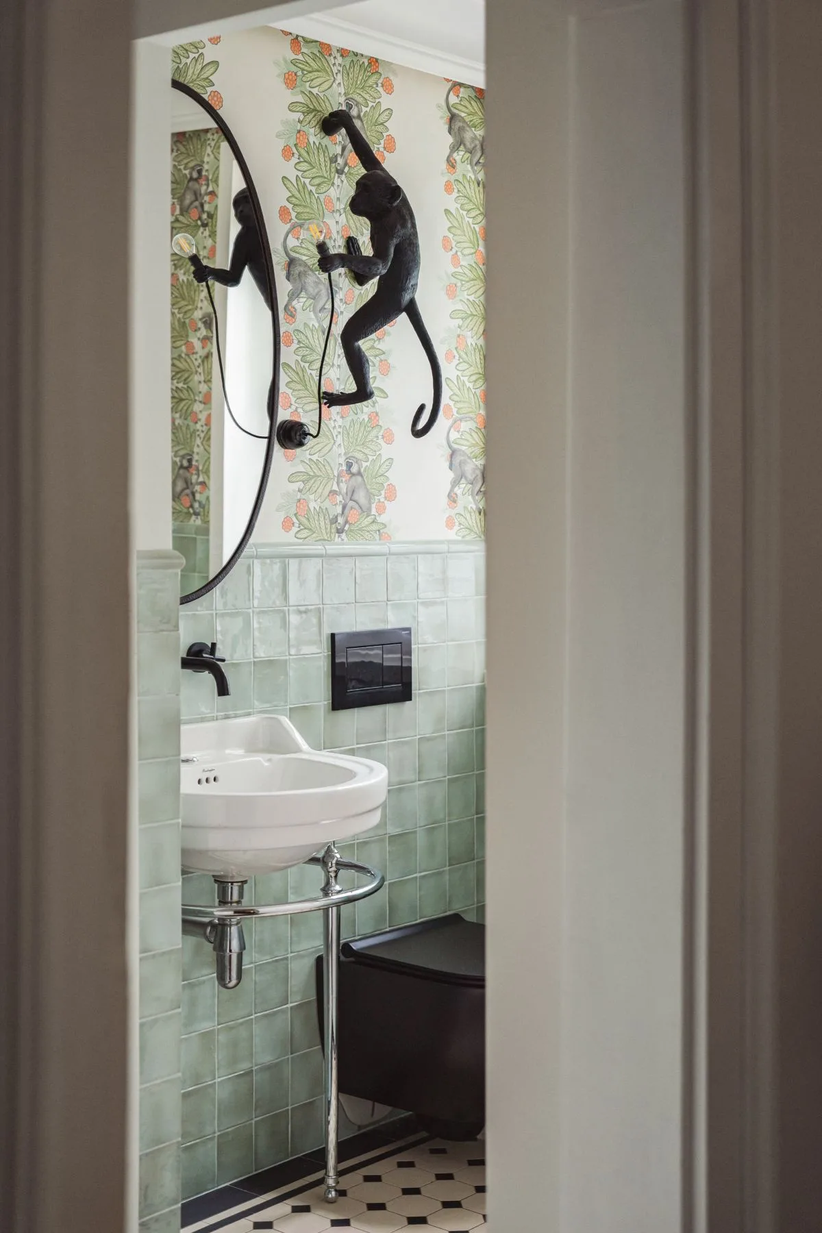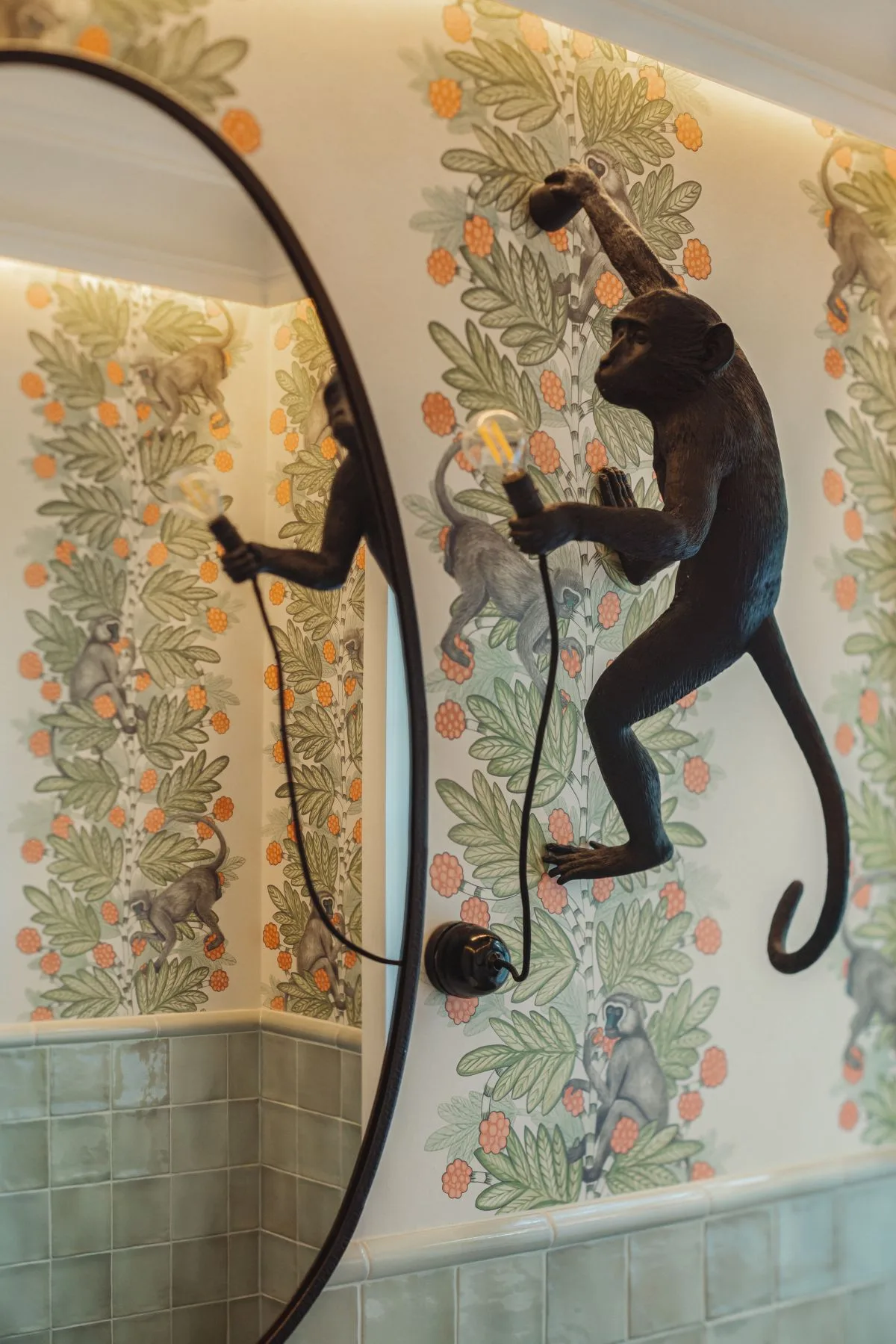 Prawdziwą perełką jest mała toaleta przy kuchni. Jej ściany zdobi niezwykle charakterystyczna tapeta z motywem małp od Cole & Son, która dodaje wnętrzu odrobiny ekstrawagancji i humoru. Kinkiet w formie małpy podkreśla teatralny klimat tego pomieszczenia – małego, lecz pełnego charakteru.
