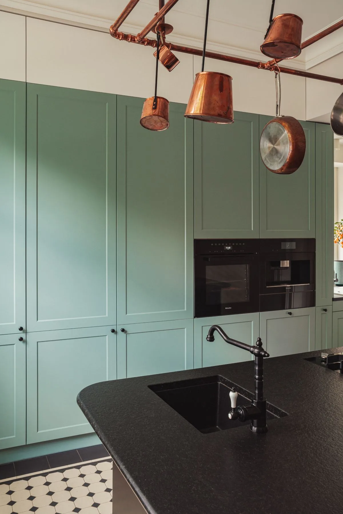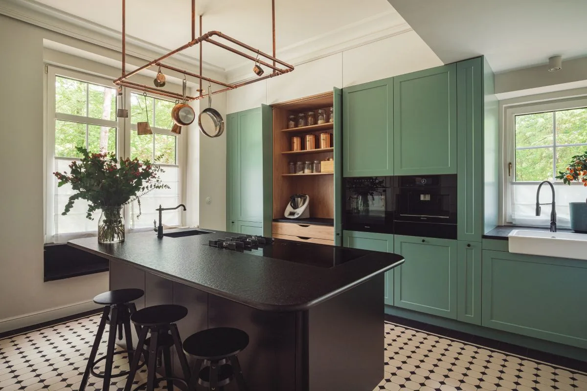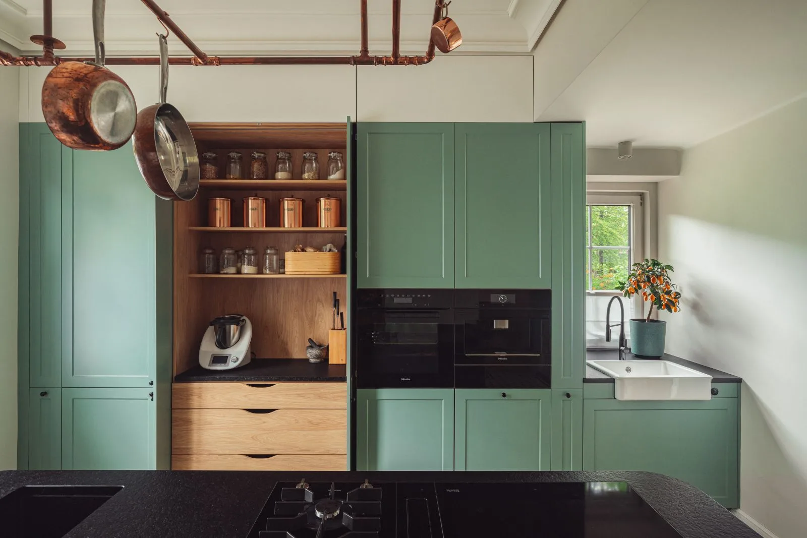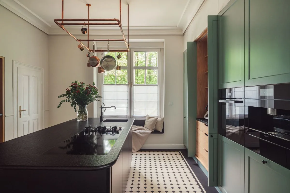 Nowoczesnym akcentem w kuchni jest czarna wyspa kuchenna z granitowym blatem, nad którą zawieszono mosiężną konstrukcję na patelnie i garnki – subtelne nawiązanie do dawnych kuchni dworskich. Fronty szafek w odcieniu szlachetnej zieleni idealnie komponują się z naturalnym otoczeniem za oknem. Zachowano również pierwotny zlew pod oknem z widokiem na las, uzupełniając go o drugi, pomocniczy, zintegrowany z wyspą.