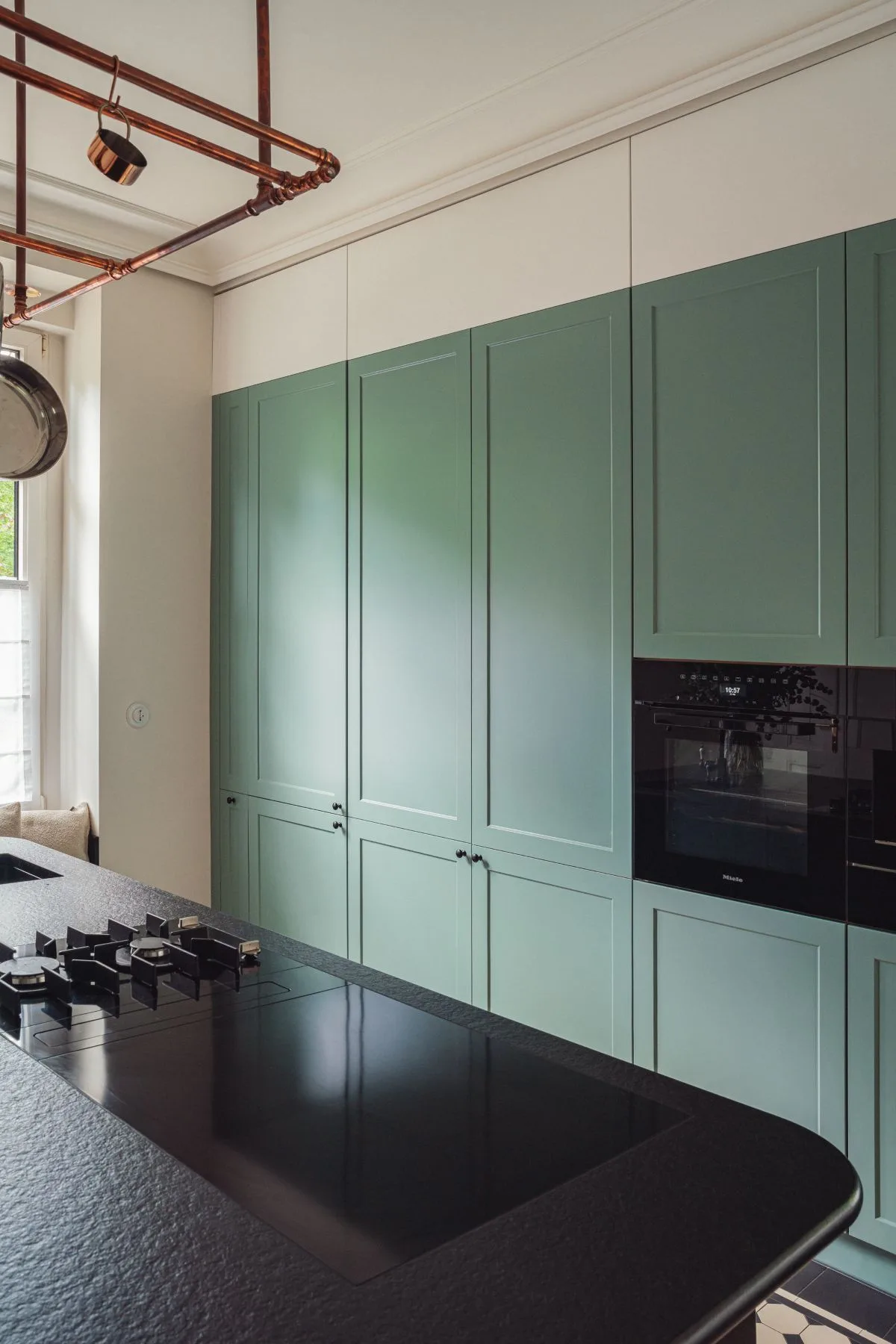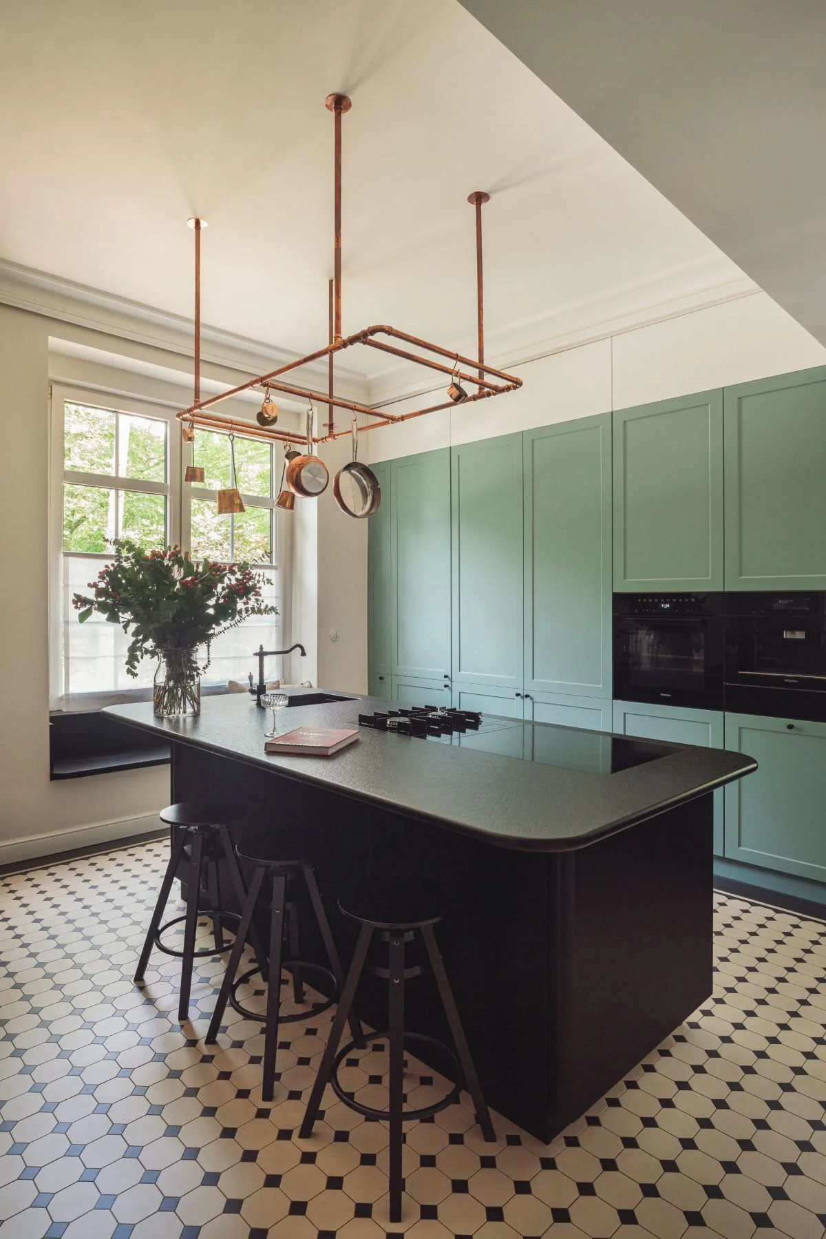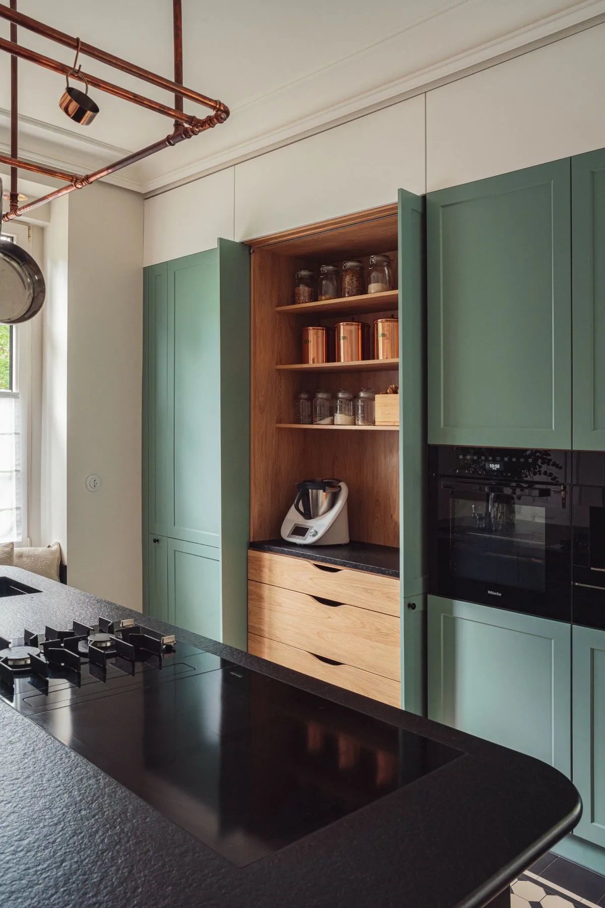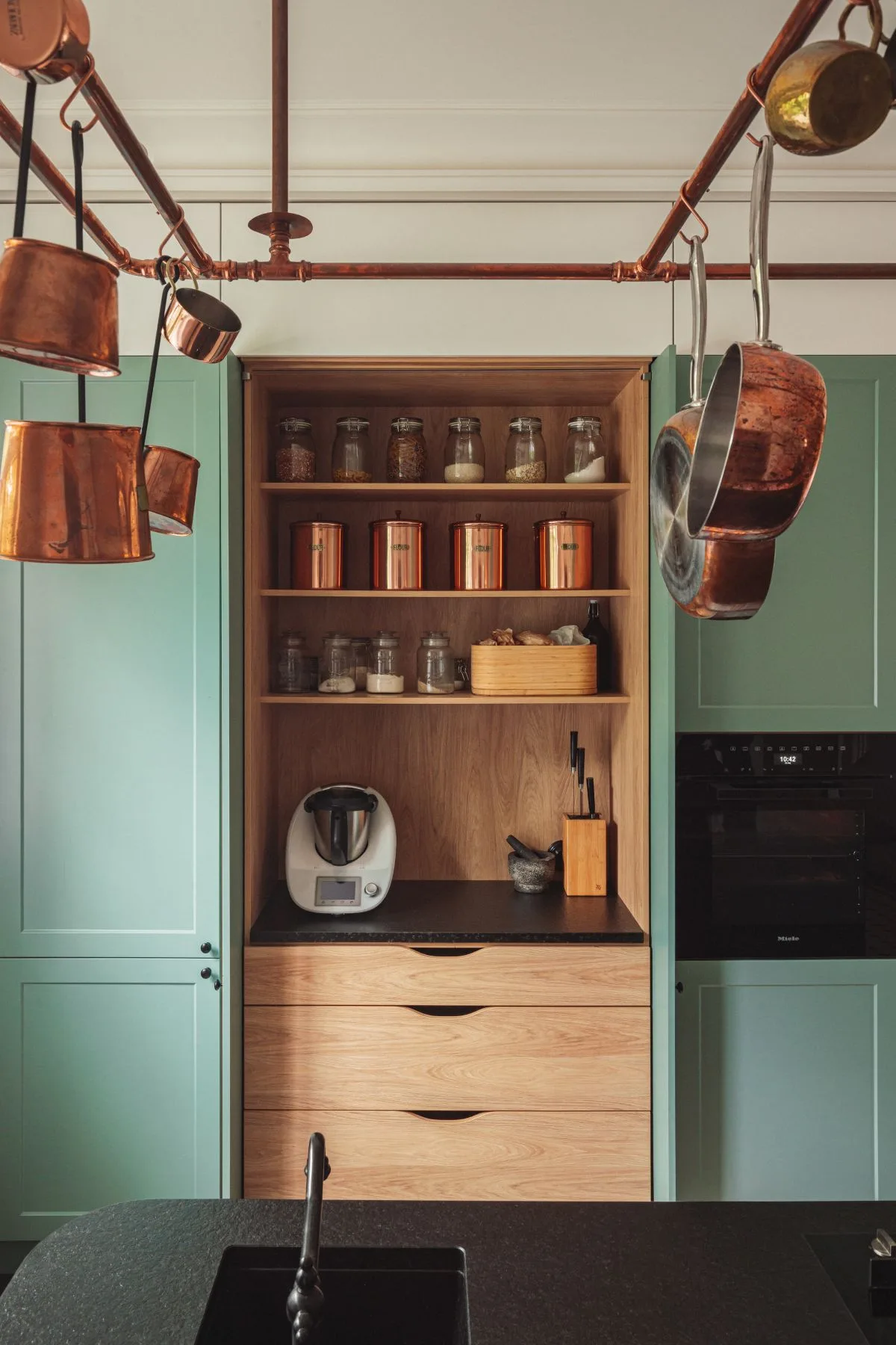 Nowoczesnym akcentem w kuchni jest czarna wyspa kuchenna z granitowym blatem, nad którą zawieszono mosiężną konstrukcję na patelnie i garnki – subtelne nawiązanie do dawnych kuchni dworskich. Fronty szafek w odcieniu szlachetnej zieleni idealnie komponują się z naturalnym otoczeniem za oknem. Zachowano również pierwotny zlew pod oknem z widokiem na las, uzupełniając go o drugi, pomocniczy, zintegrowany z wyspą.
