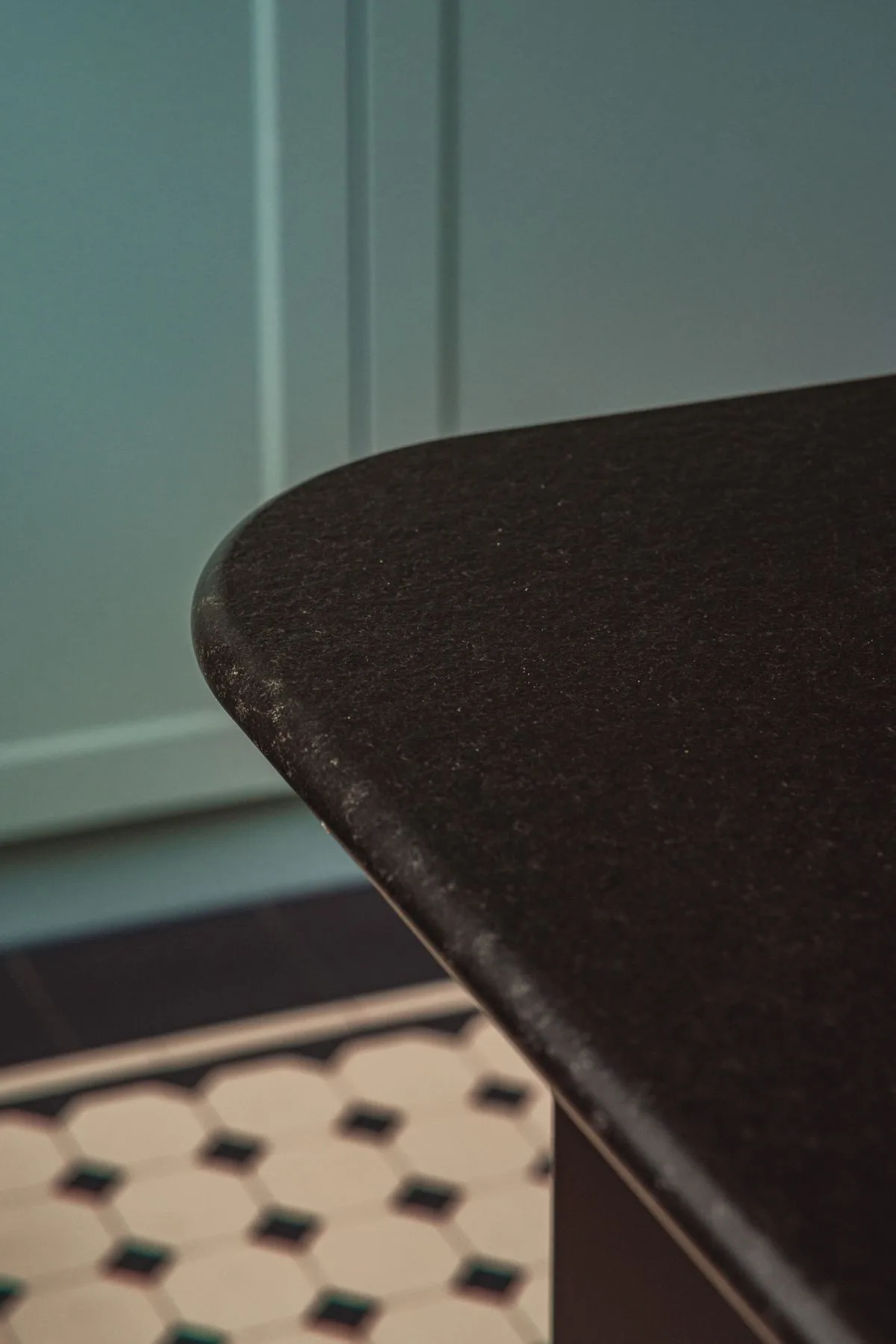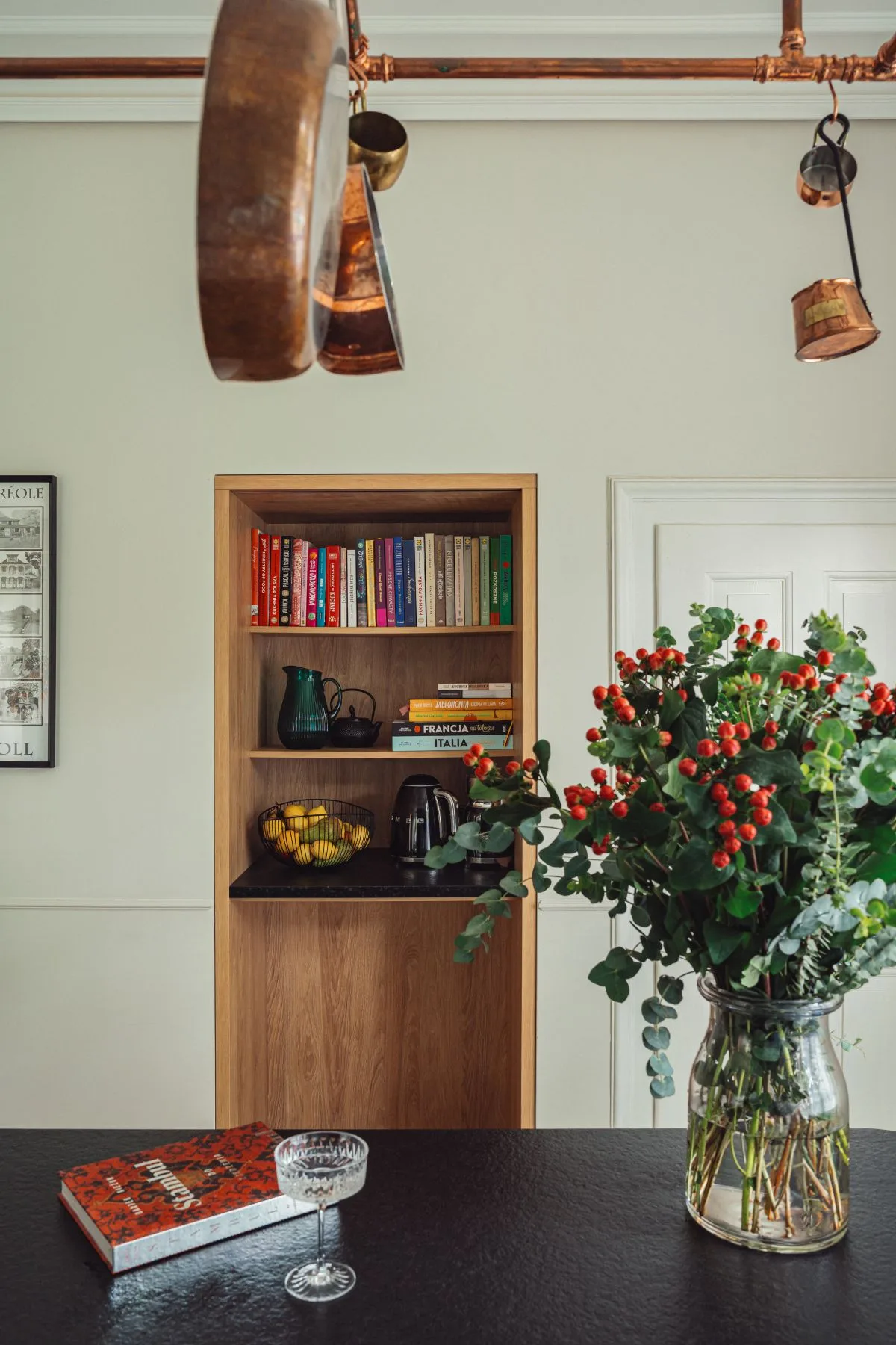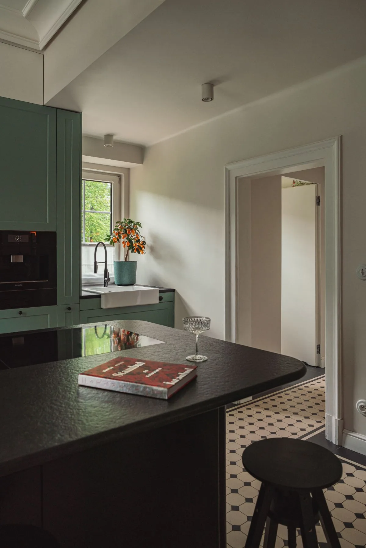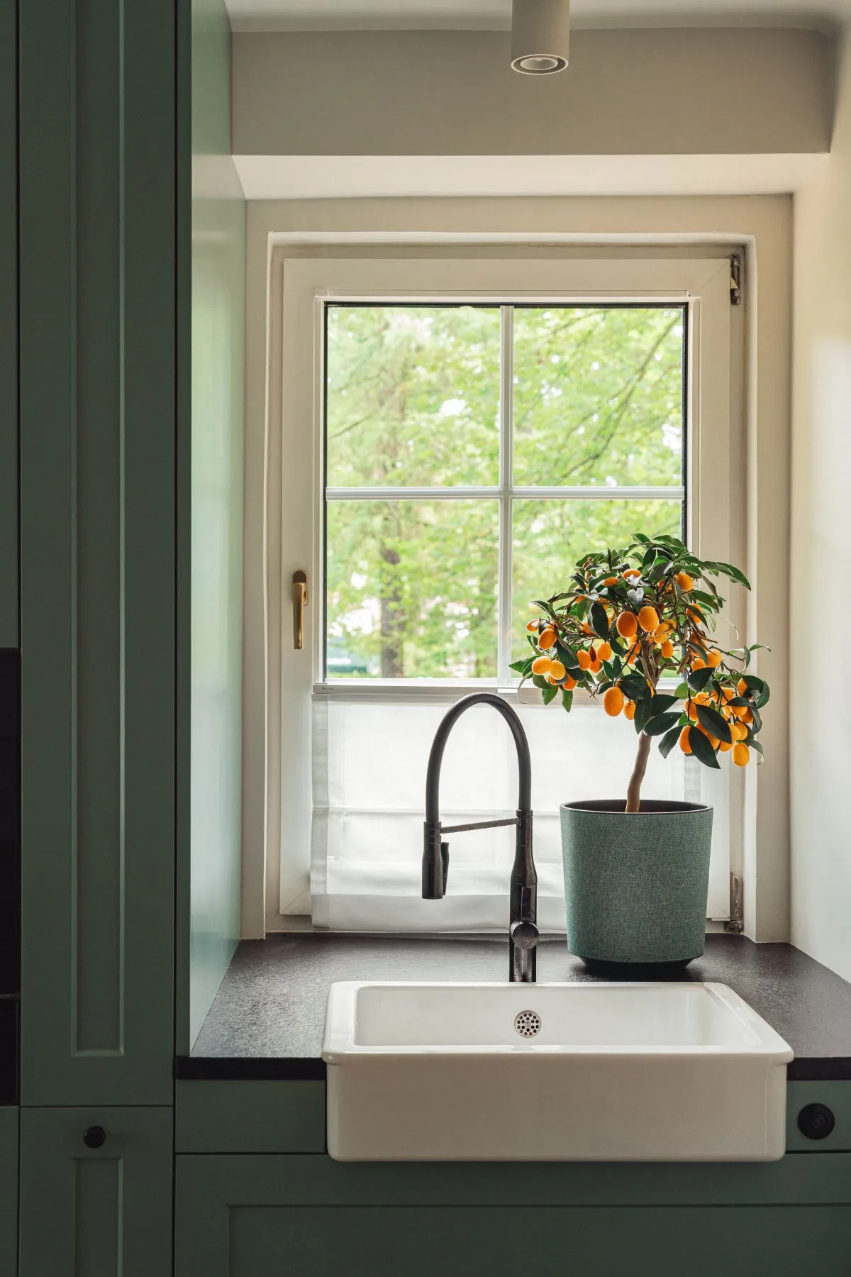 Nowoczesnym akcentem w kuchni jest czarna wyspa kuchenna z granitowym blatem, nad którą zawieszono mosiężną konstrukcję na patelnie i garnki – subtelne nawiązanie do dawnych kuchni dworskich. Fronty szafek w odcieniu szlachetnej zieleni idealnie komponują się z naturalnym otoczeniem za oknem. Zachowano również pierwotny zlew pod oknem z widokiem na las, uzupełniając go o drugi, pomocniczy, zintegrowany z wyspą.