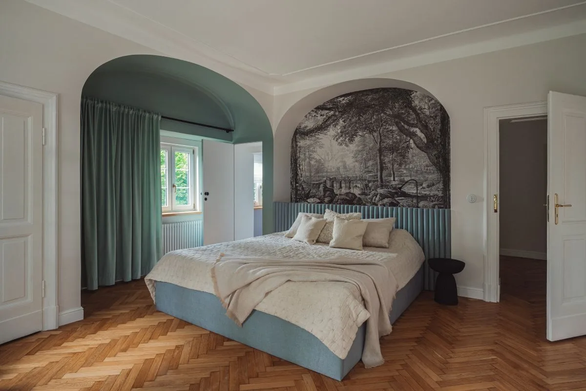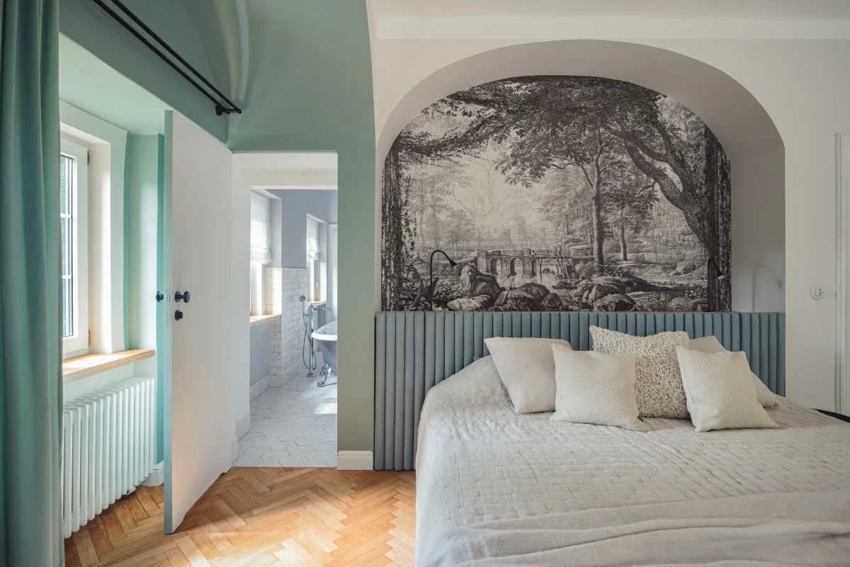 Wnętrza, z wyjątkiem łazienek na piętrze, zostały zaprojektowane przez AMOK Architecture – Olgę Kurek, której estetyczne podejście łączy poszanowanie historii z nowoczesnym komfortem. Z kolei projekt łazienek to dzieło studia Profilar, które zadbało o wysmakowaną elegancję i funkcjonalność przestrzeni kąpielowych.