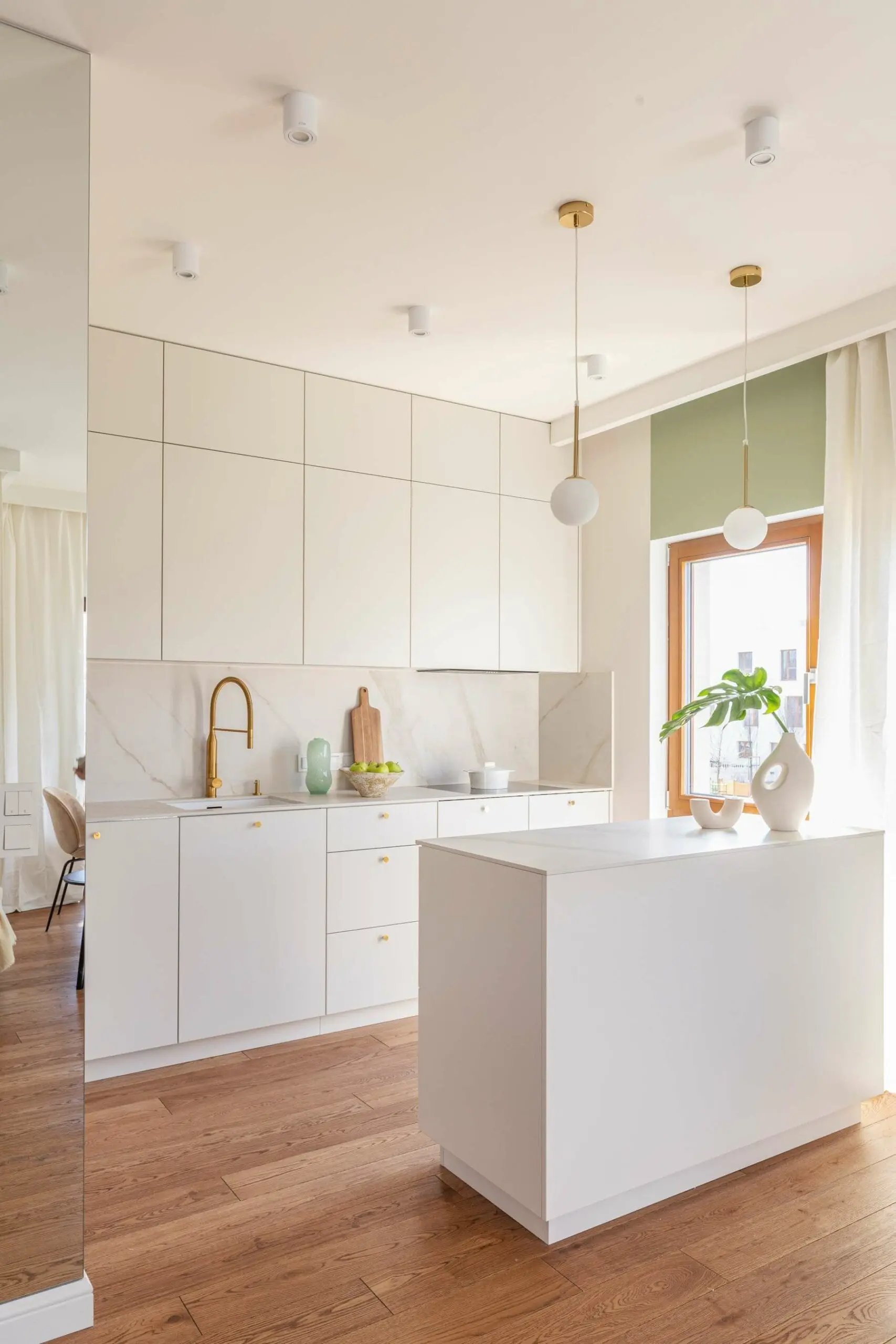 Sam salon nie przytłacza dodatkami – znajdziemy tu stolik z widokiem na podwórze, kanapę i stolik kawowy oraz telewizor i kolejną ozdobę roślinną. Pomieszczenie jest jednak otwarte na kuchnię, która naturalnie wpisuje się w krajobraz salonu, choć utrzymana jest w duchu dominującej bieli, przełamywanej gdzieniegdzie brązem. Występują tu również elementy złota, będące swoistego rodzaju ,,biżuterią” dla kuchennych mebli. Oba pomieszczenia zaopatrzono również w designerskie lampy, nadające wnętrzu jeszcze więcej oryginalności.