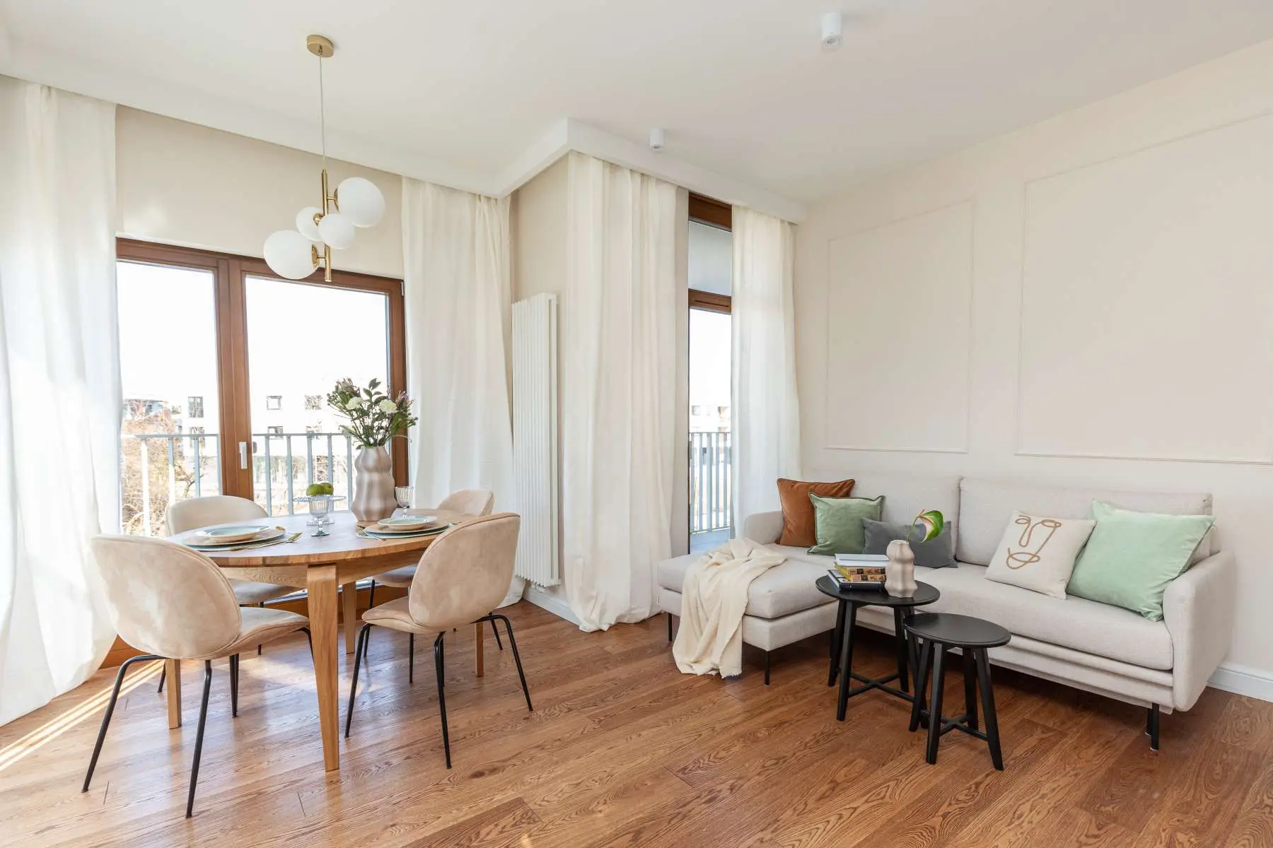 Dużym plusem na mapie mieszkania są również wielkie okna znajdujące się w salonie. Dzięki swoim rozmiarom wpuszczają do środka mnóstwo światła oraz – przy lepszej pogodzie – promienie słońca, co wspaniale współgra z barwą brązu i oliwki. W upalne dni każdy z nas woli jednak schronić się przed słońcem, dlatego też salon zaopatrzony został w białe zasłony, stawiające kropkę nad ,,i” w tym pomieszczeniu.