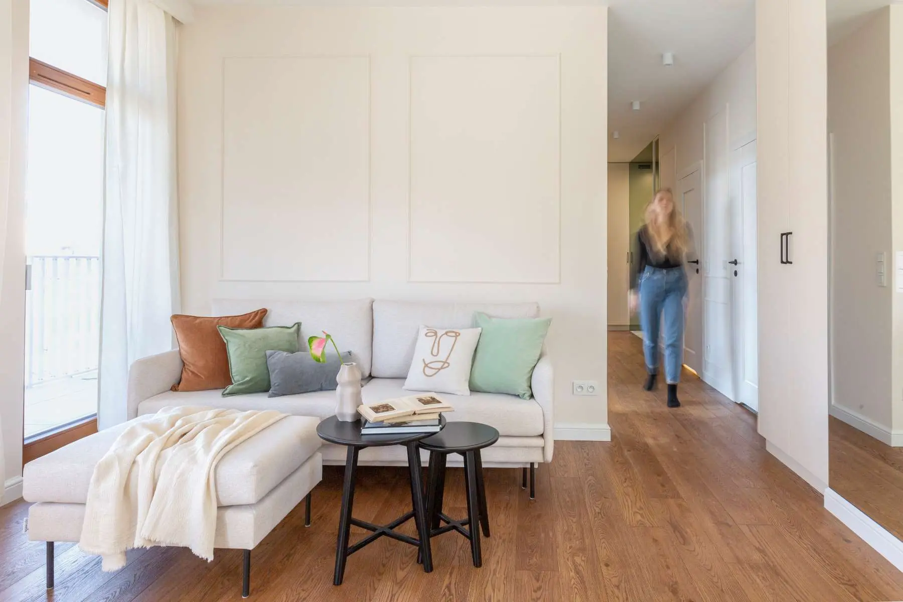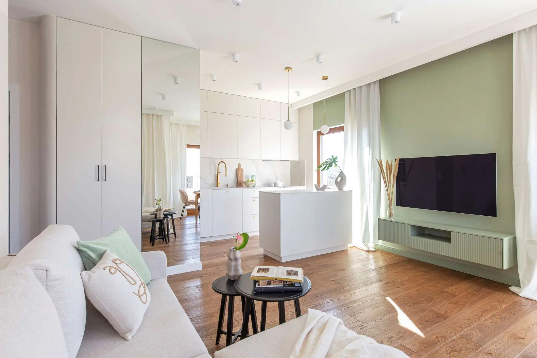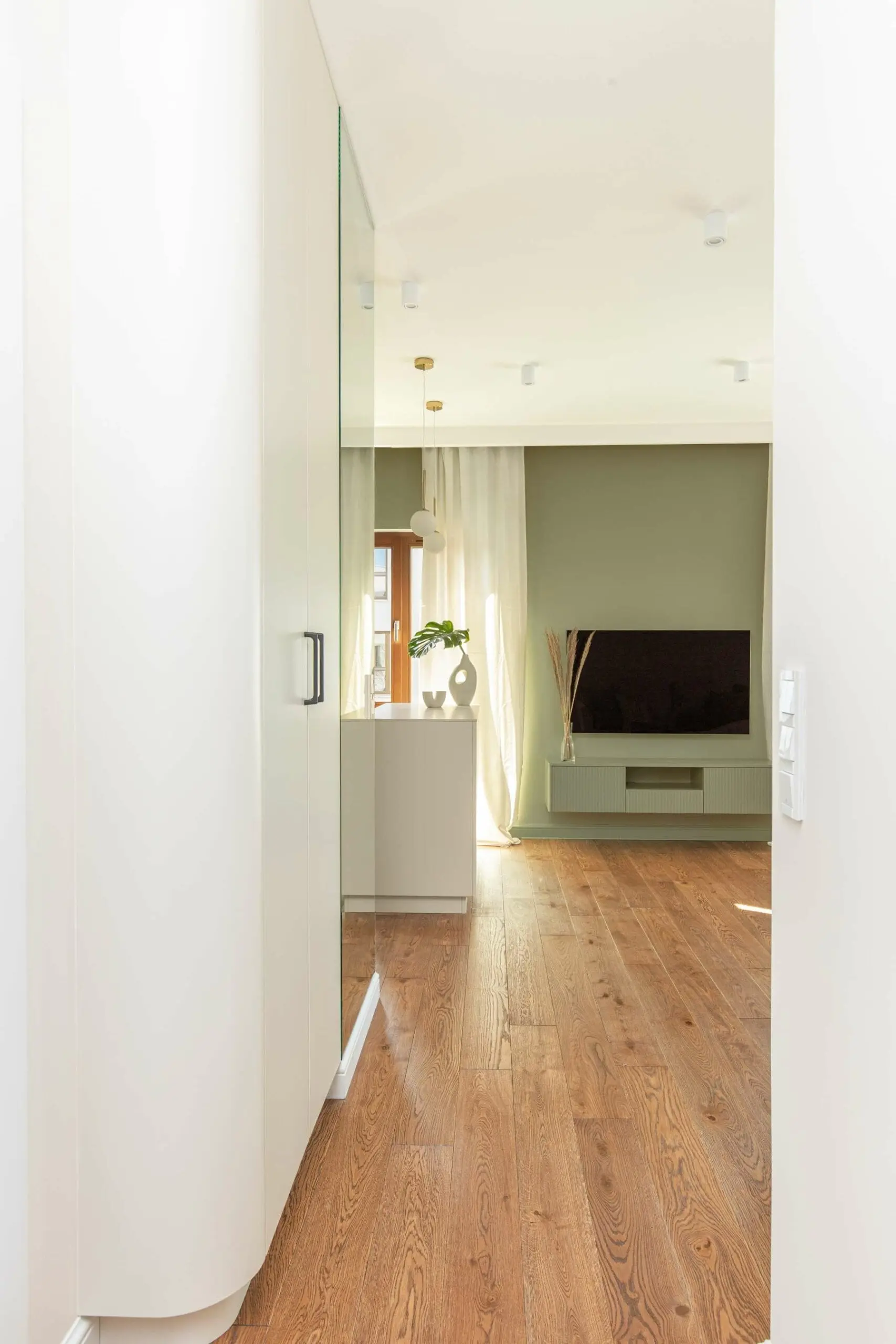 Tym razem architekci z firmy IdeabyMag realizowali jeden z projektów na warszawskim Mokotowie, gdzie mieli okazję sprostać wyzwaniu, jakie postawiło im mierzące 63 metry mieszkanie. Projektanci od samego początku założyli, że efektem pracy będzie harmonijne wnętrze. To właśnie dlatego, w trakcie wyboru kolorów ścian nie wahano się, aby zestawić biel z oliwką. Kto zna się na oddziaływaniu kolorów na ludzką psychikę, ten na pewno zrozumie, dlaczego ta barwa króluje przede wszystkim w salonie i przedpokoju.