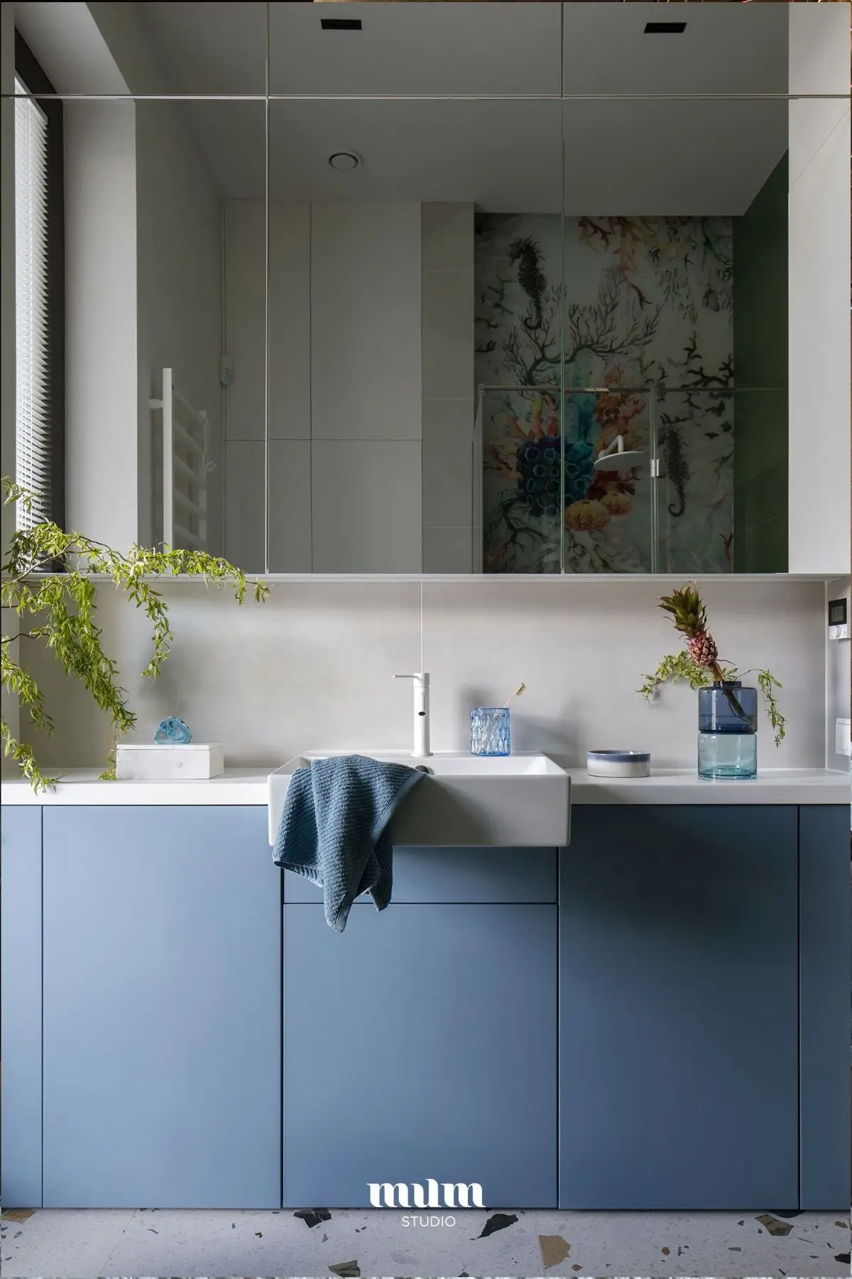 W łazience, można dostrzec spójność estetyczną z resztą przestrzeni opisanej wcześniej. To, co wyróżnia tę łazienkę, to liczne detale projektowe, które nadają jej charakteru i wyjątkowego wyglądu.