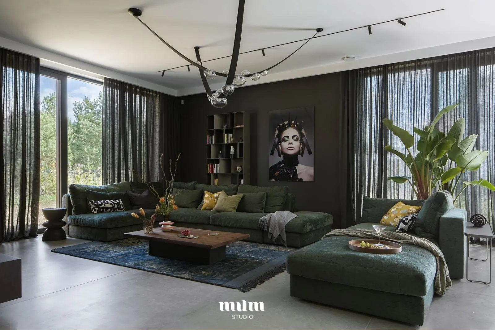 Centralnym elementem w tej przestrzeni jest duży stalowy żyrandol, który przykuwa uwagę i stanowi ważny punkt centralny. Przy odpowiednim doborze oświetlenia żyrandol może dodać przestrzeni elegancji i charakteru. To ciekawe urozmaicenie wśród głównie ciemniejszej kolorystyki.